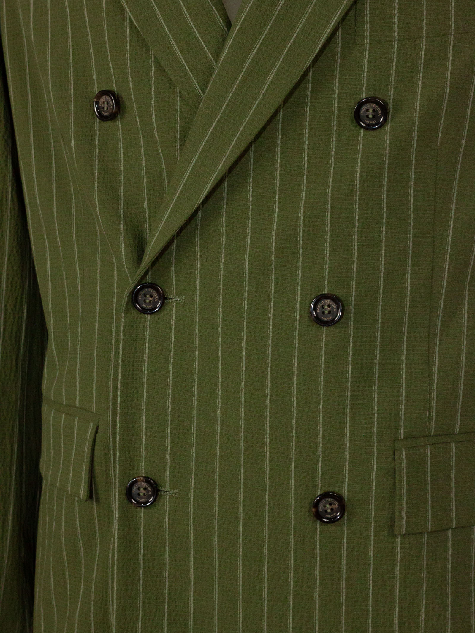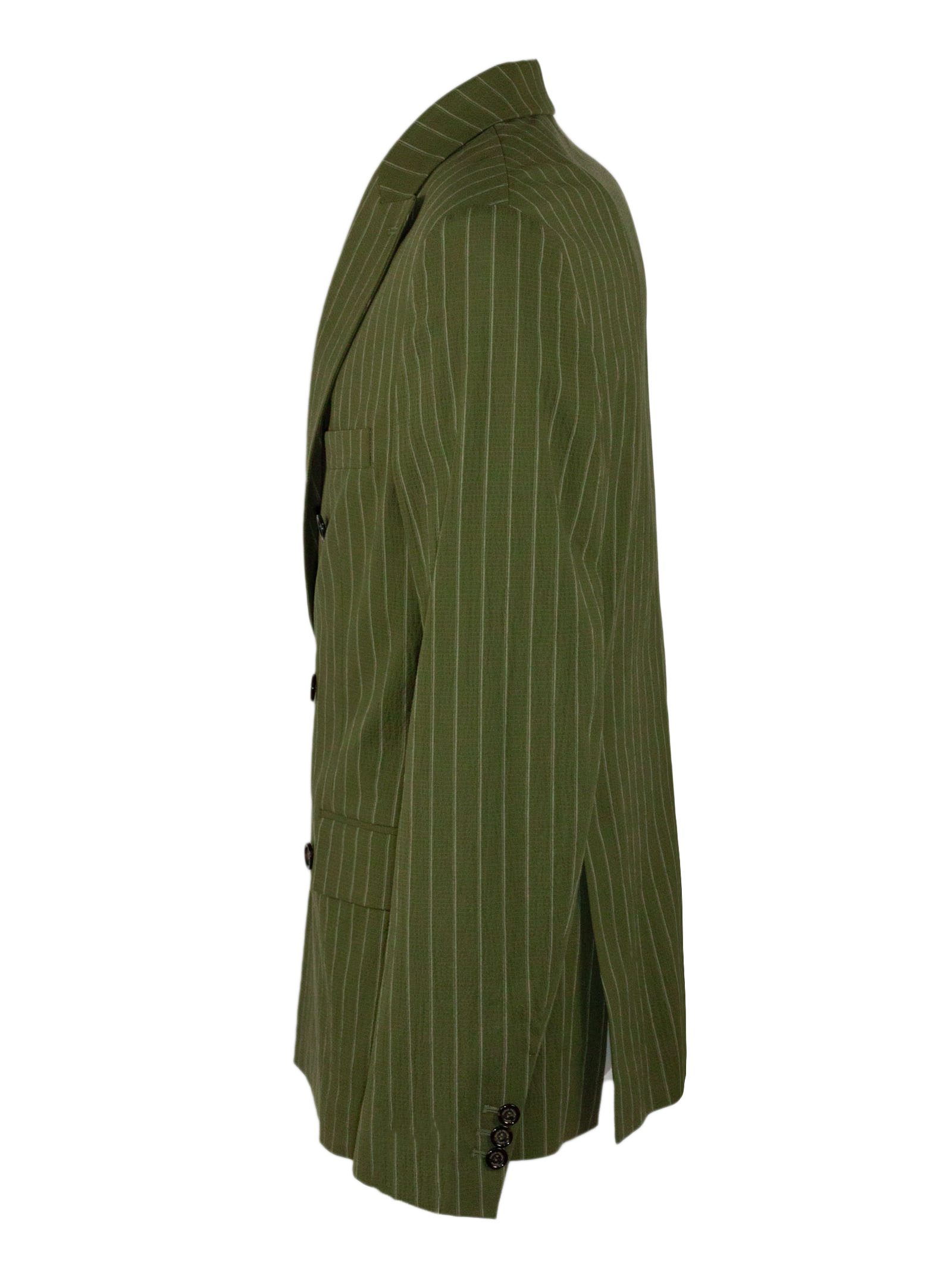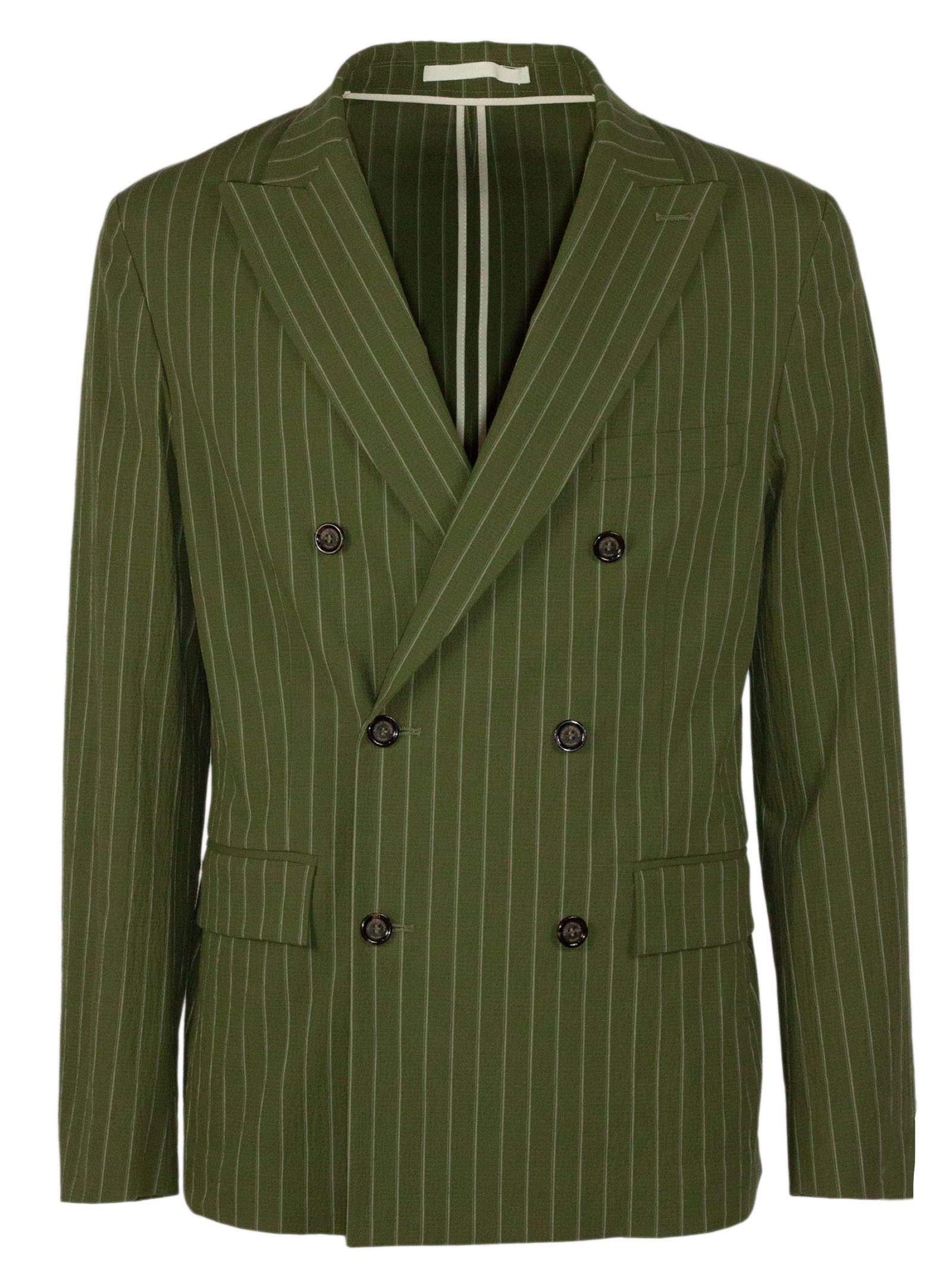 Green cotton double-breasted jacket, thin pinstripe pattern, six-button closure, classic peak lapels, front flap pockets, chest pocket, elegant and structured cut, 98% cotton 2%Elastane Lining: 60%Acetate 40%Cupro