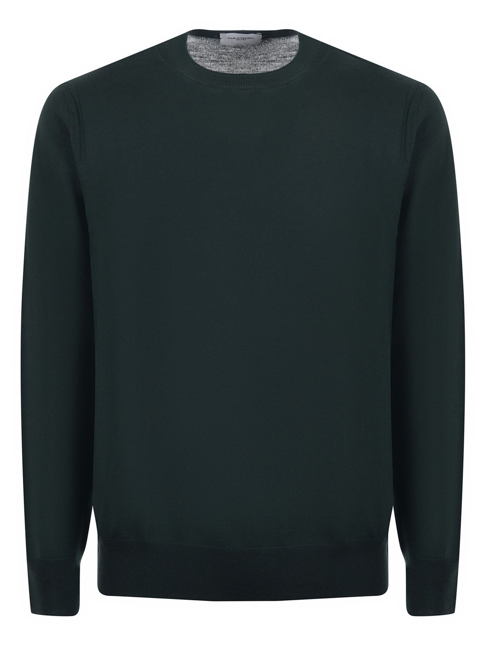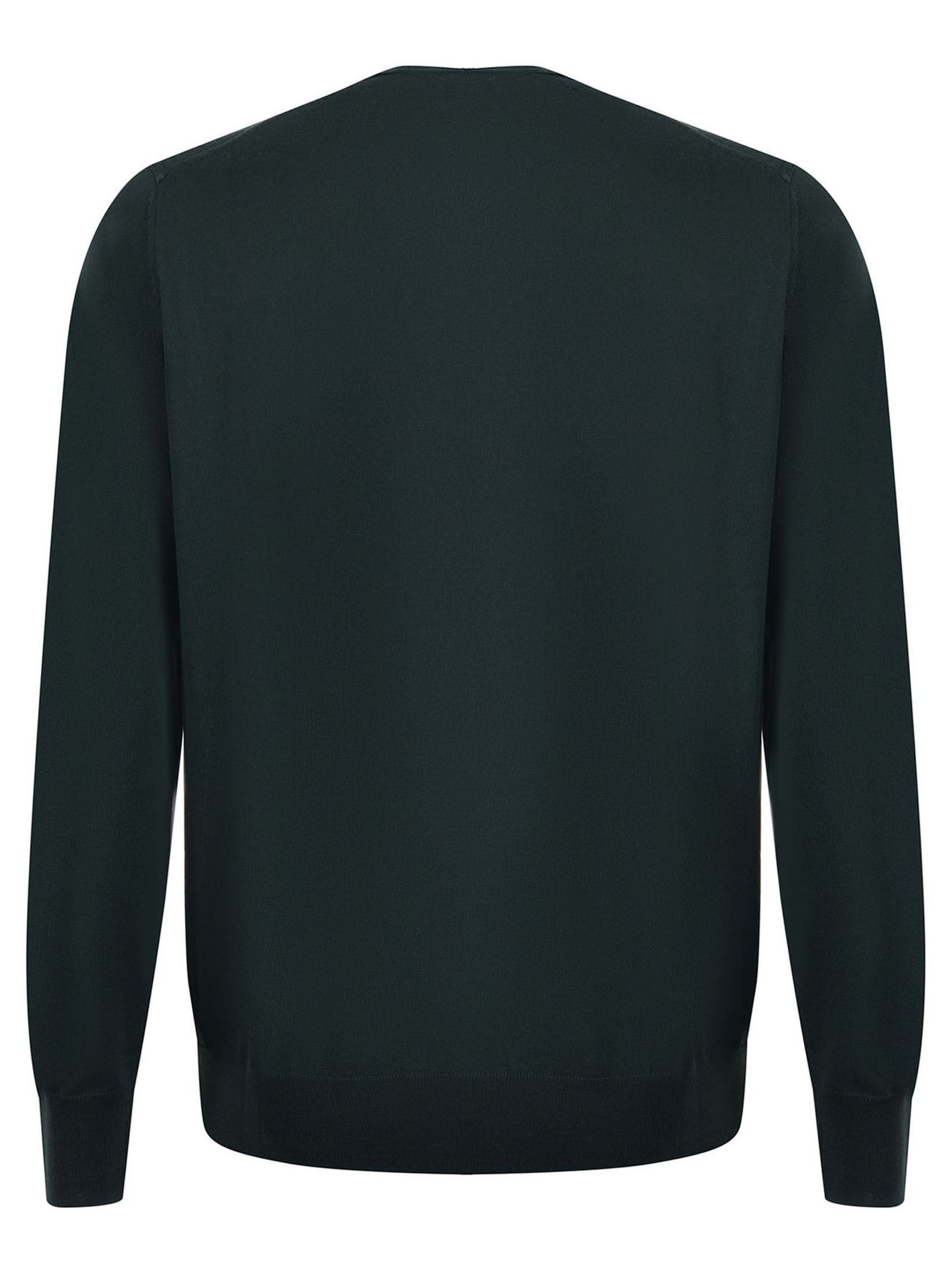 Green virgin wool jumper, ribbed trim, crew neck, long sleeves