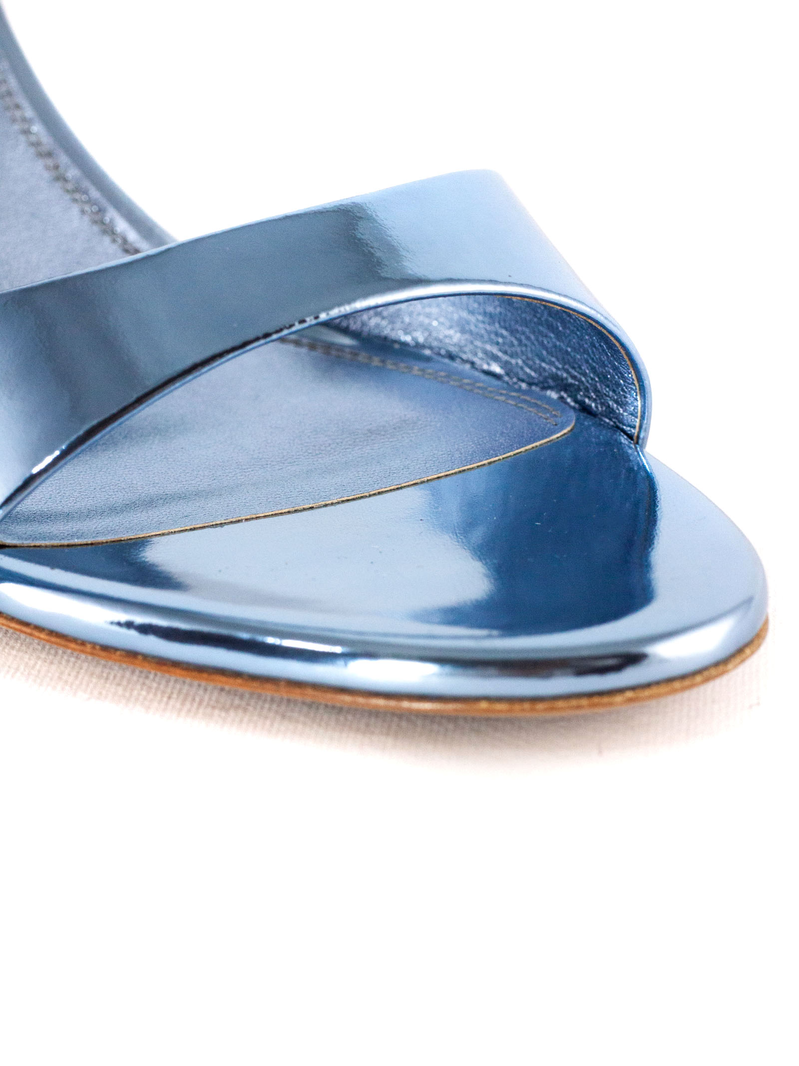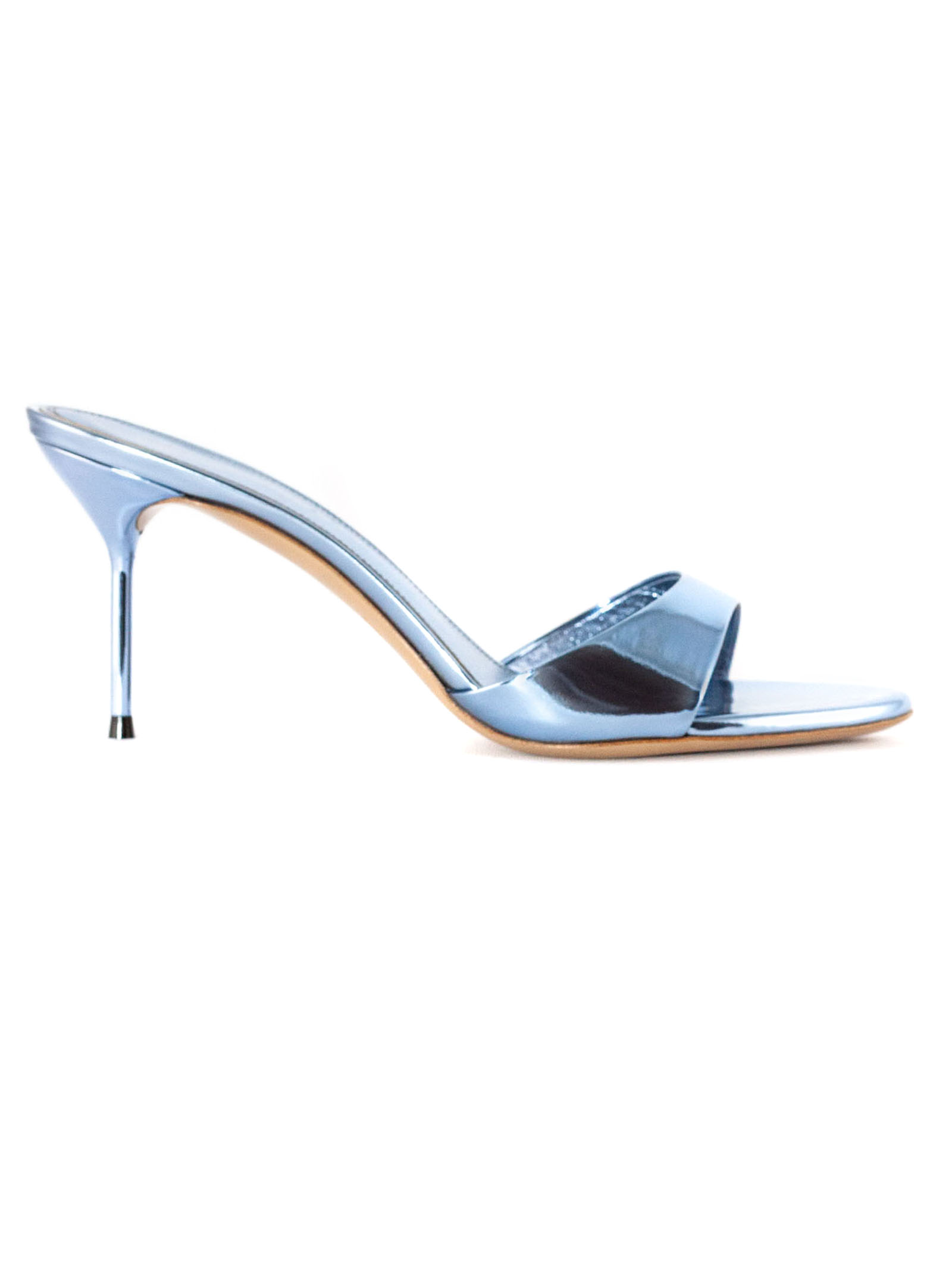 Lidia 70 mules in light blue mirrored leather, round toe, leather sole with logo, heel height 70mm