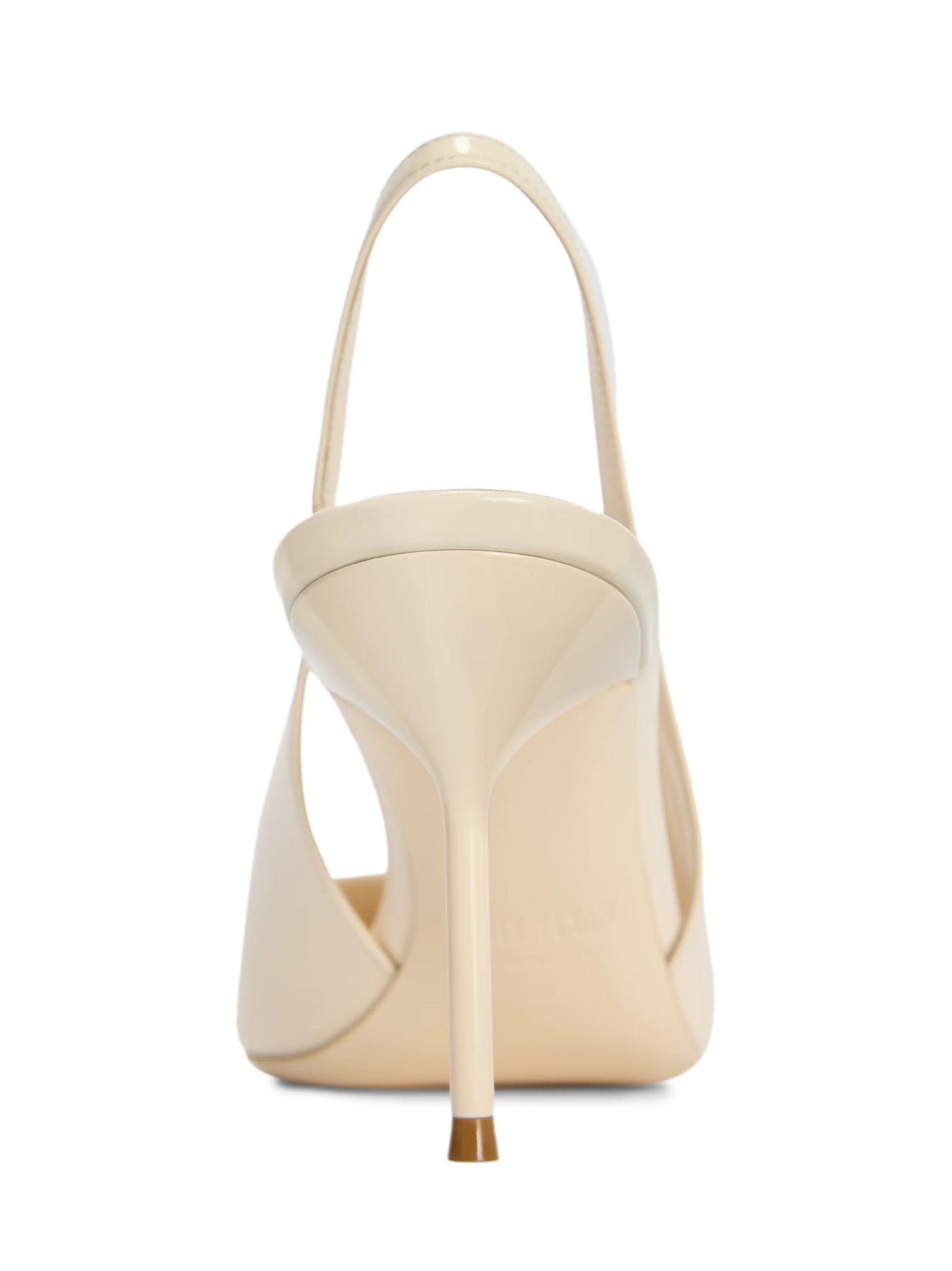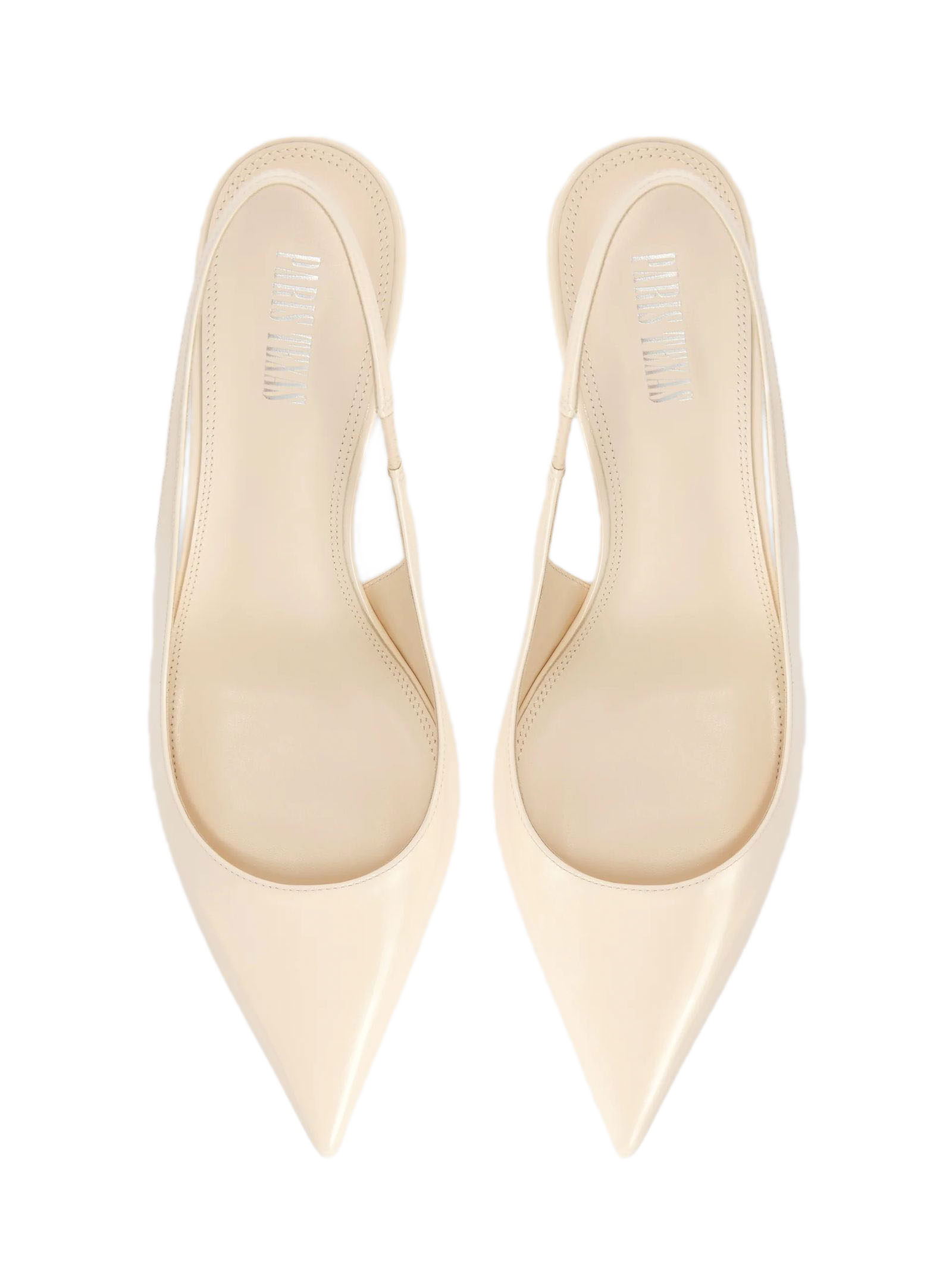Lidia pointed-toe slingbacks in ivory patent leather, covered pin heel, leather sole with logo, heel height 70mm