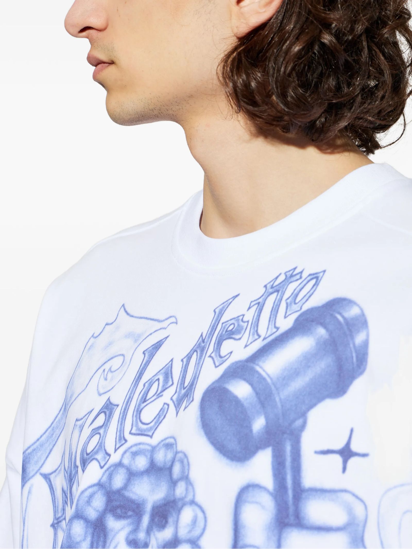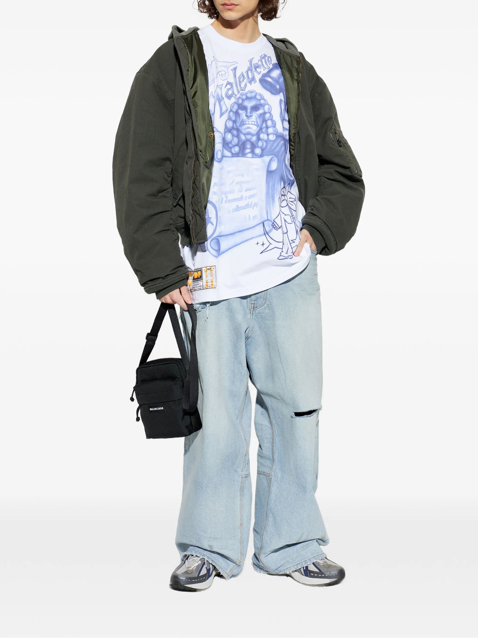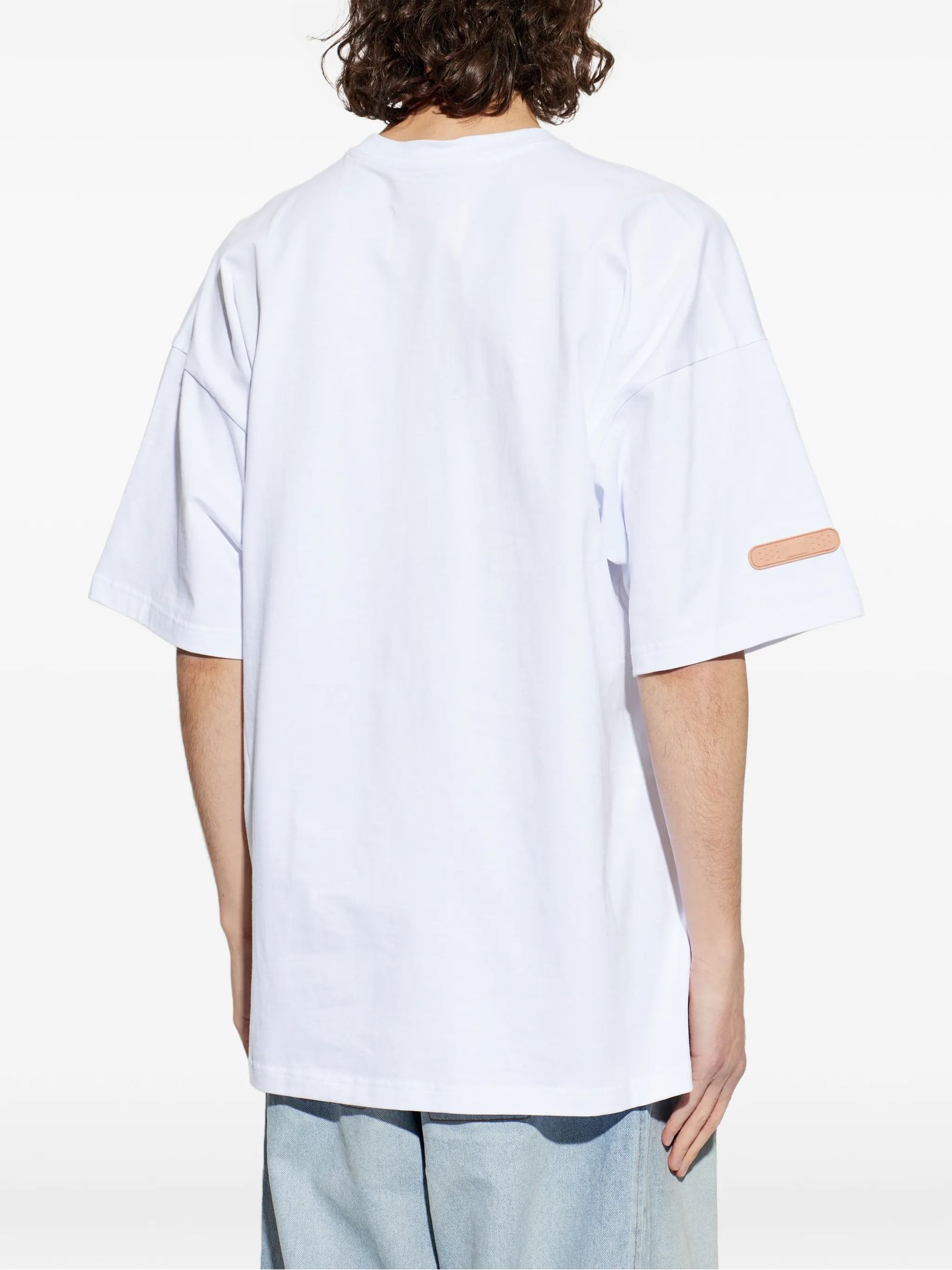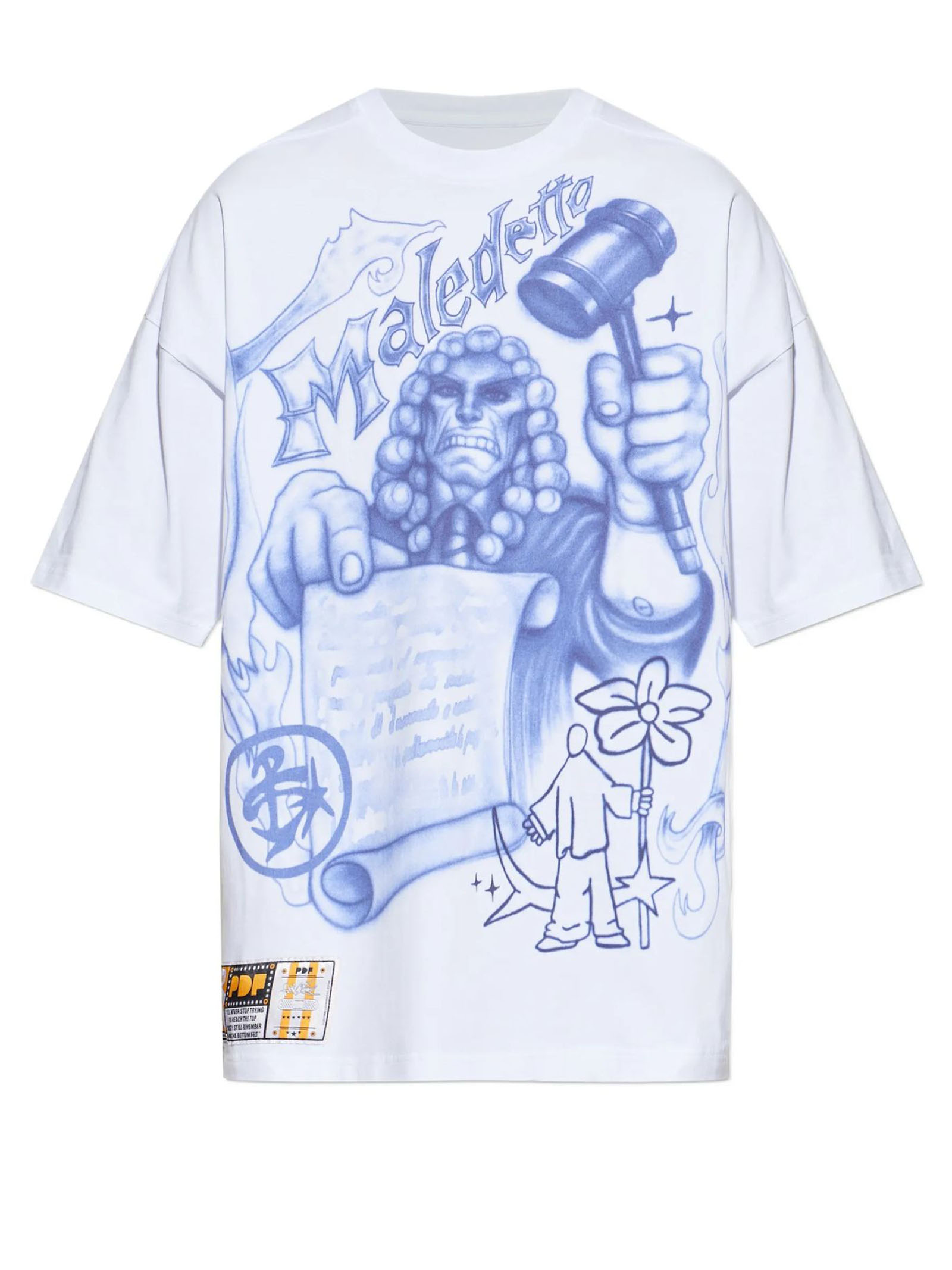 White cotton T-shirt, graphic print, round neck, short sleeves, comfortable fit