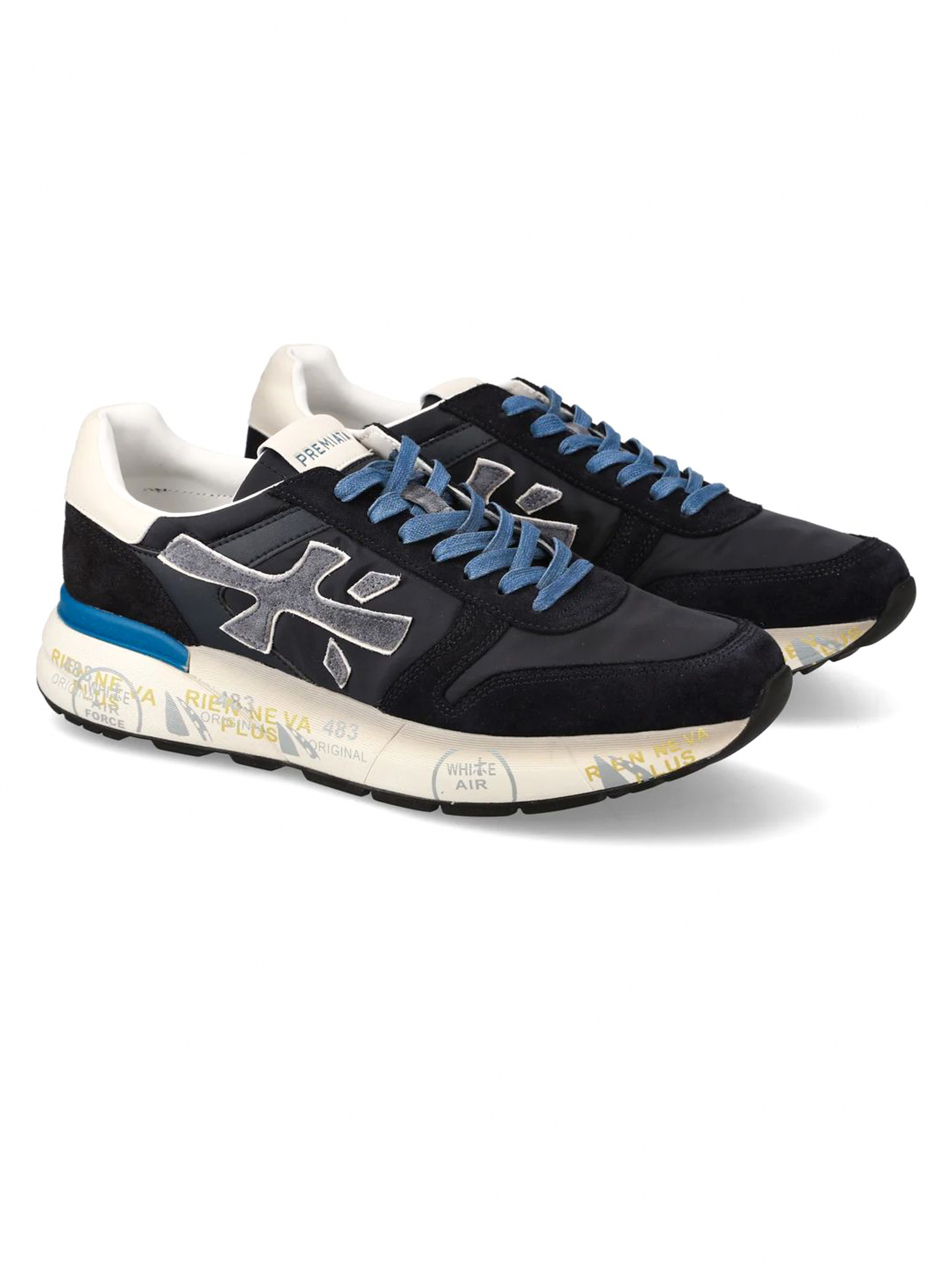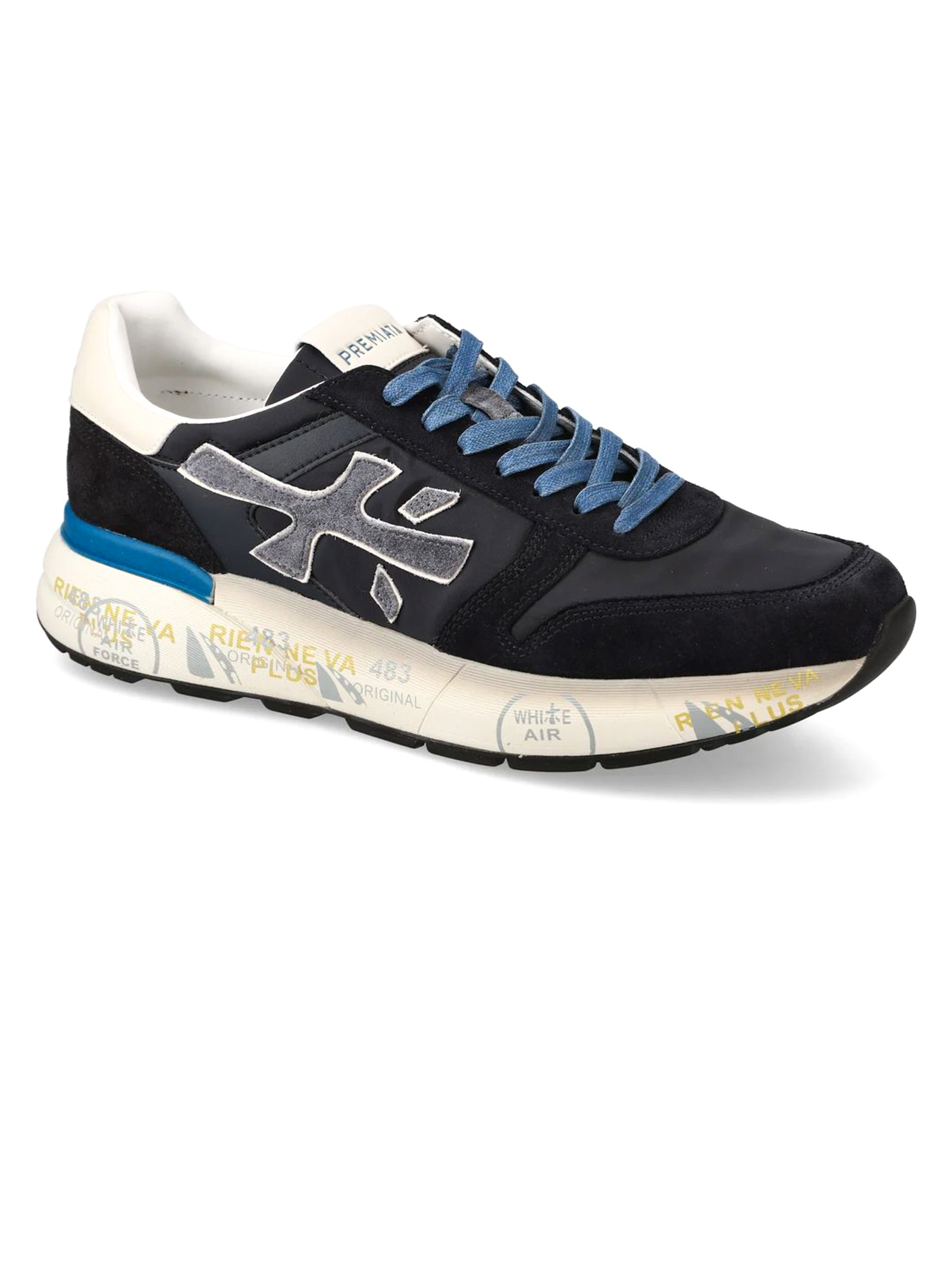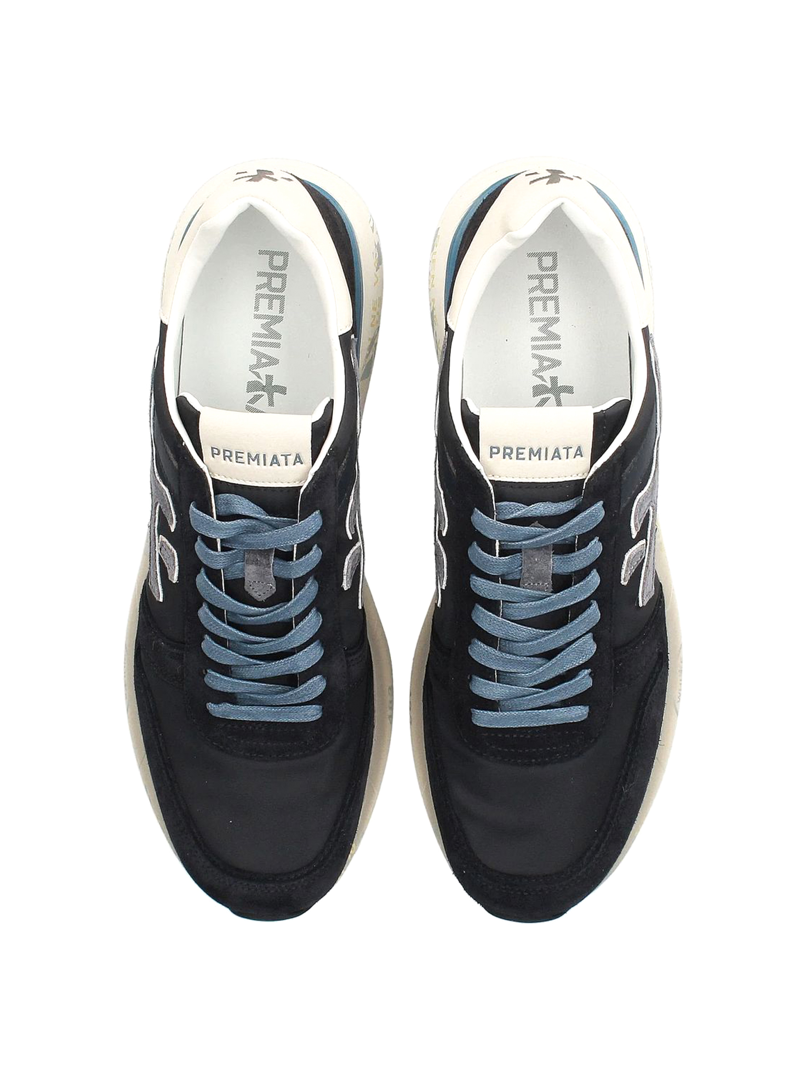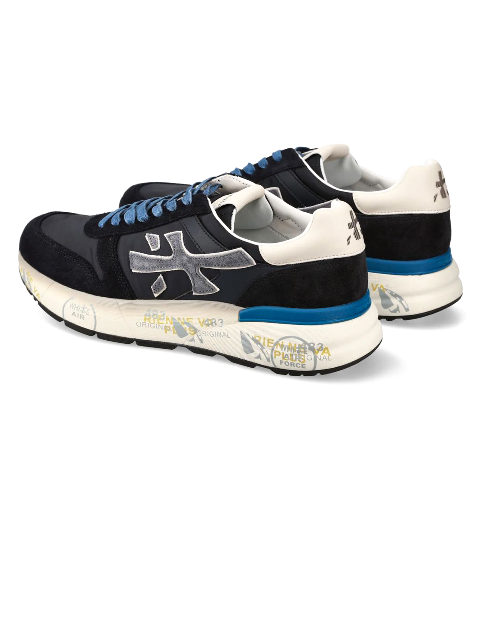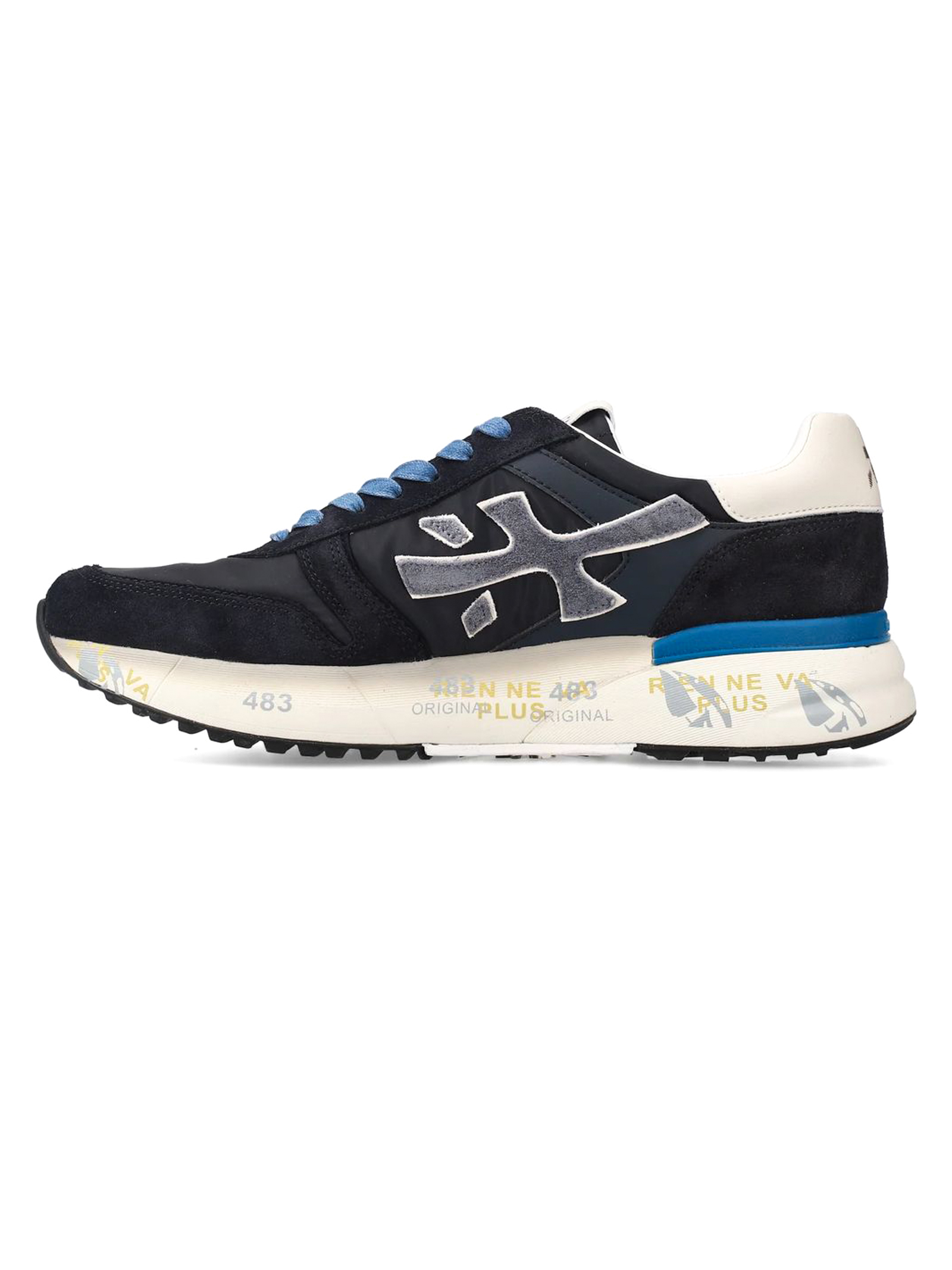 Blue suede and nylon Mick sneakers, front lace-up fastening, contrasting branded heel cunter, round toe, chunky rubber sole, heel height 4 cm