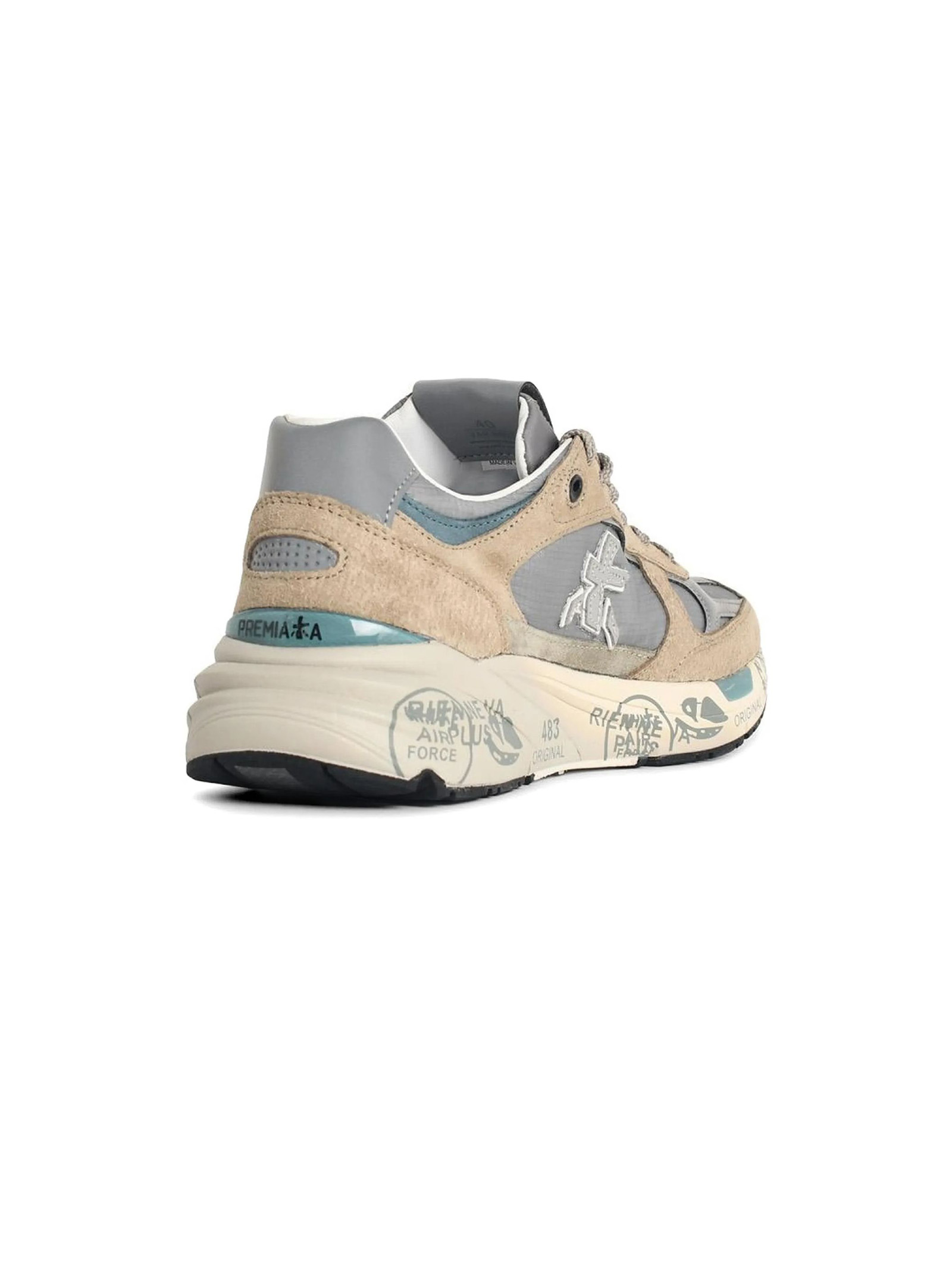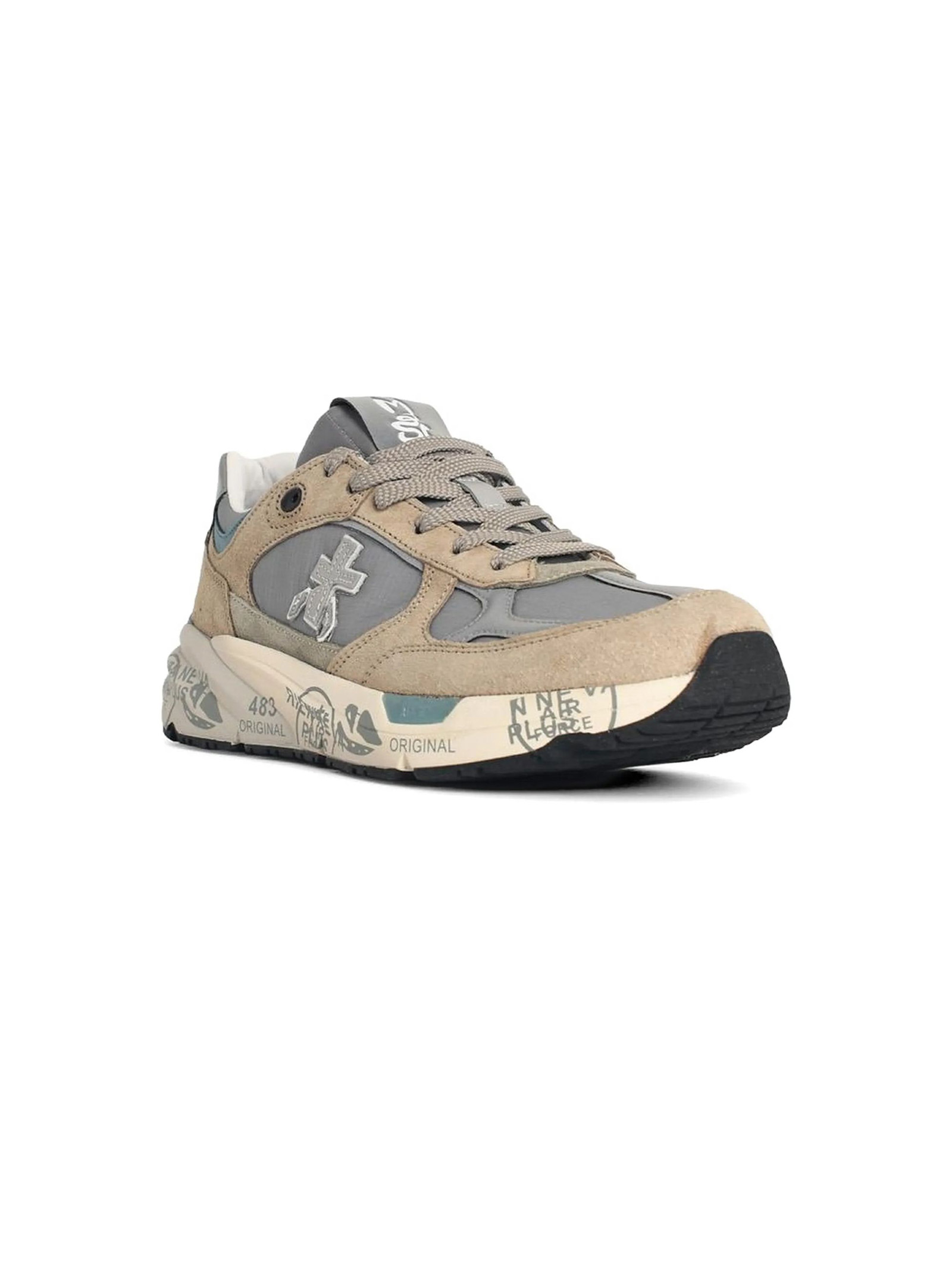 Mase sneakers in beige suede and grey nylon with contrasting heel reinforcement, tongue featuring an embossed logo, logo patch, round toe, insole with logo, leather lining, sole height 4 cm