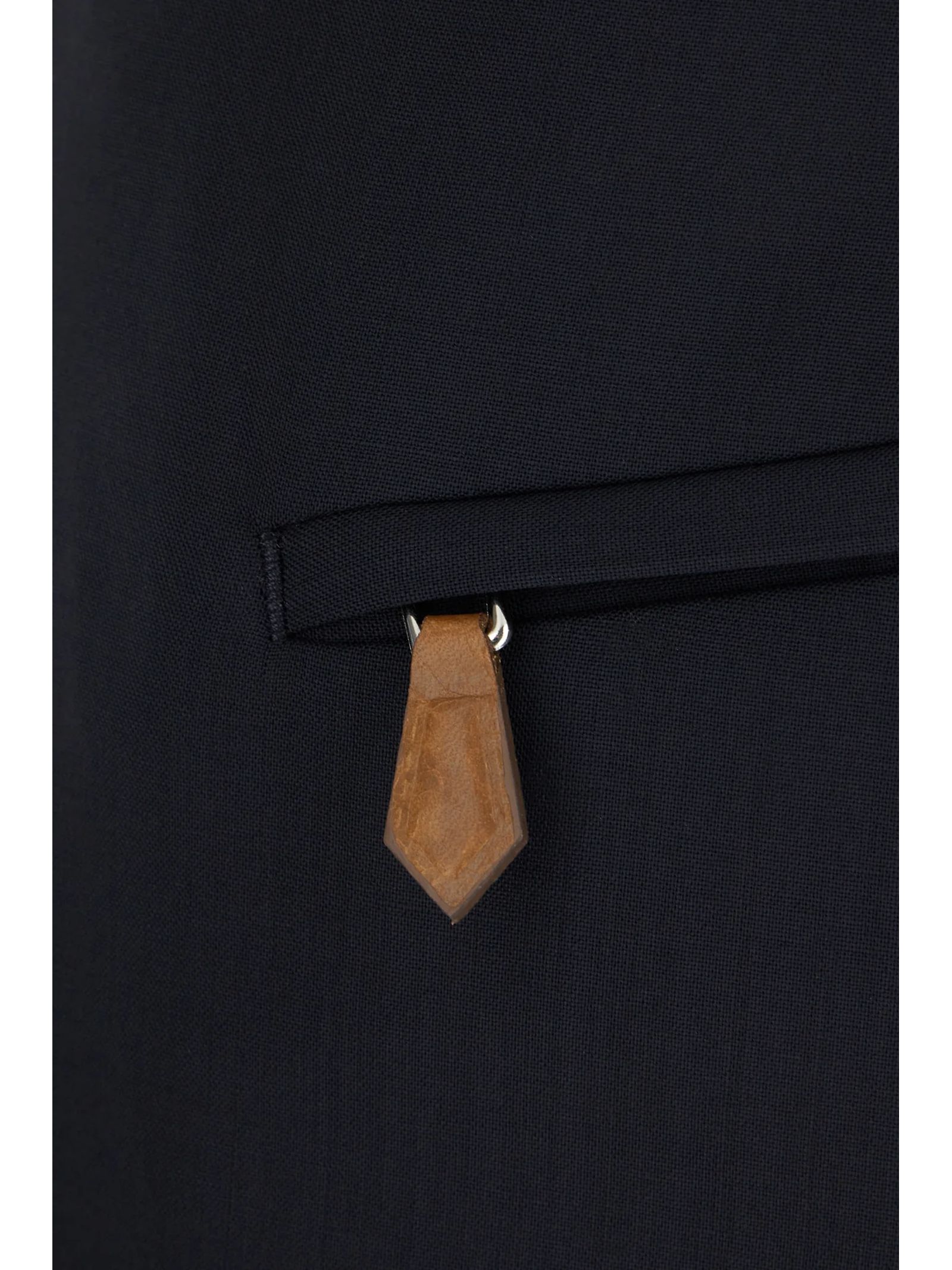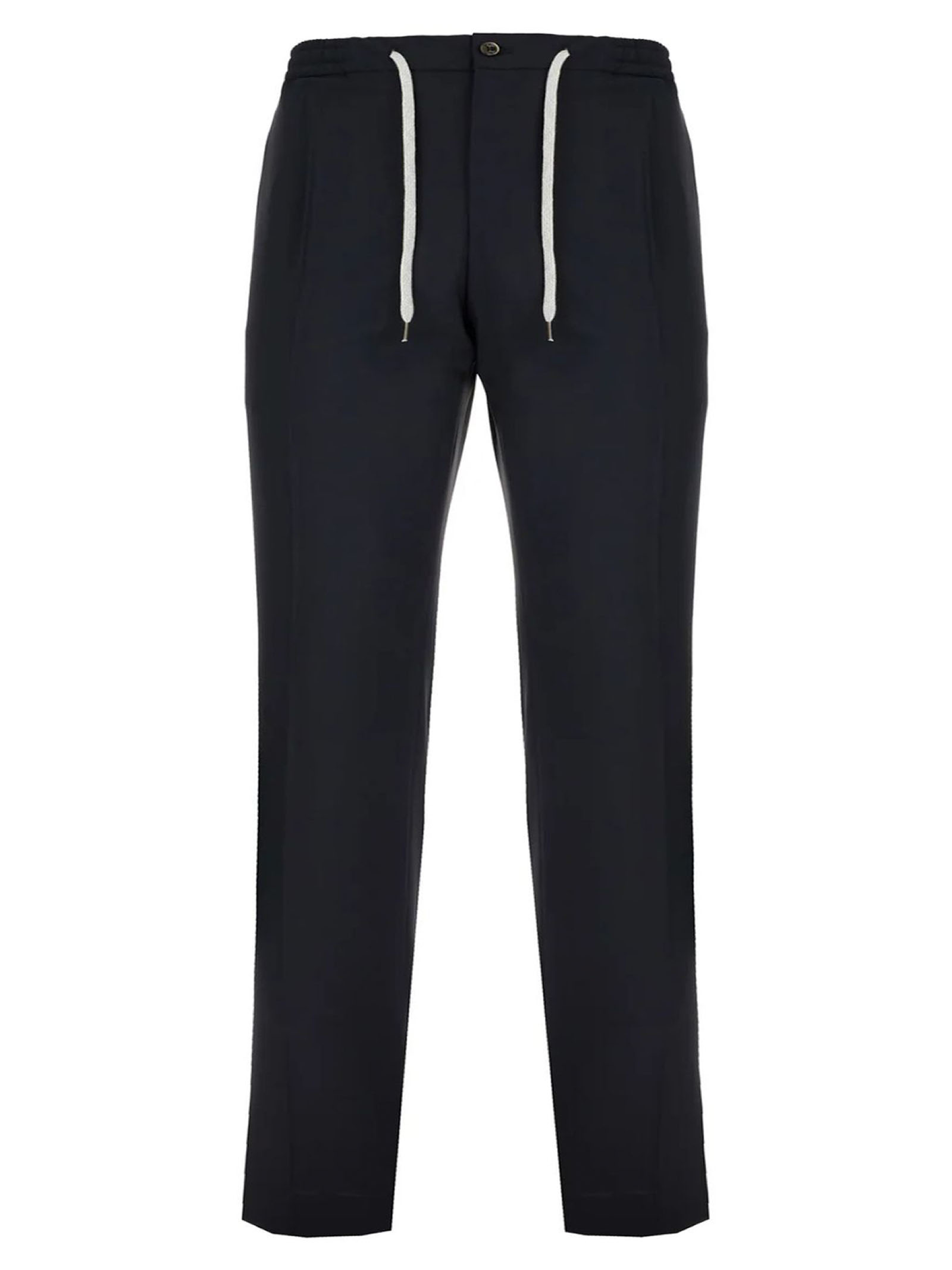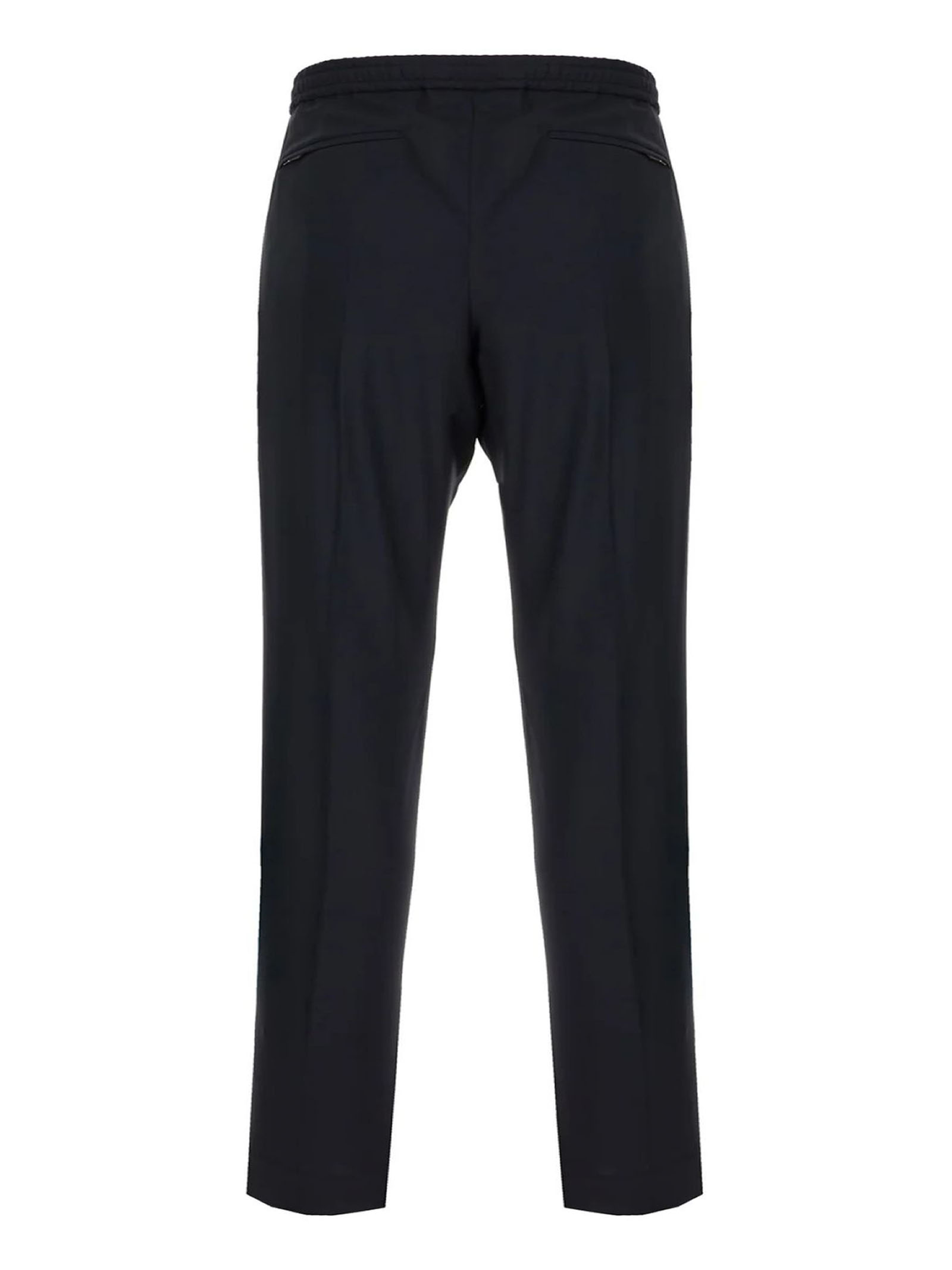 Blue wool pants, elastic waistband, drawstring closure, back welt pocket, tailored details, tone-on-tone stitching