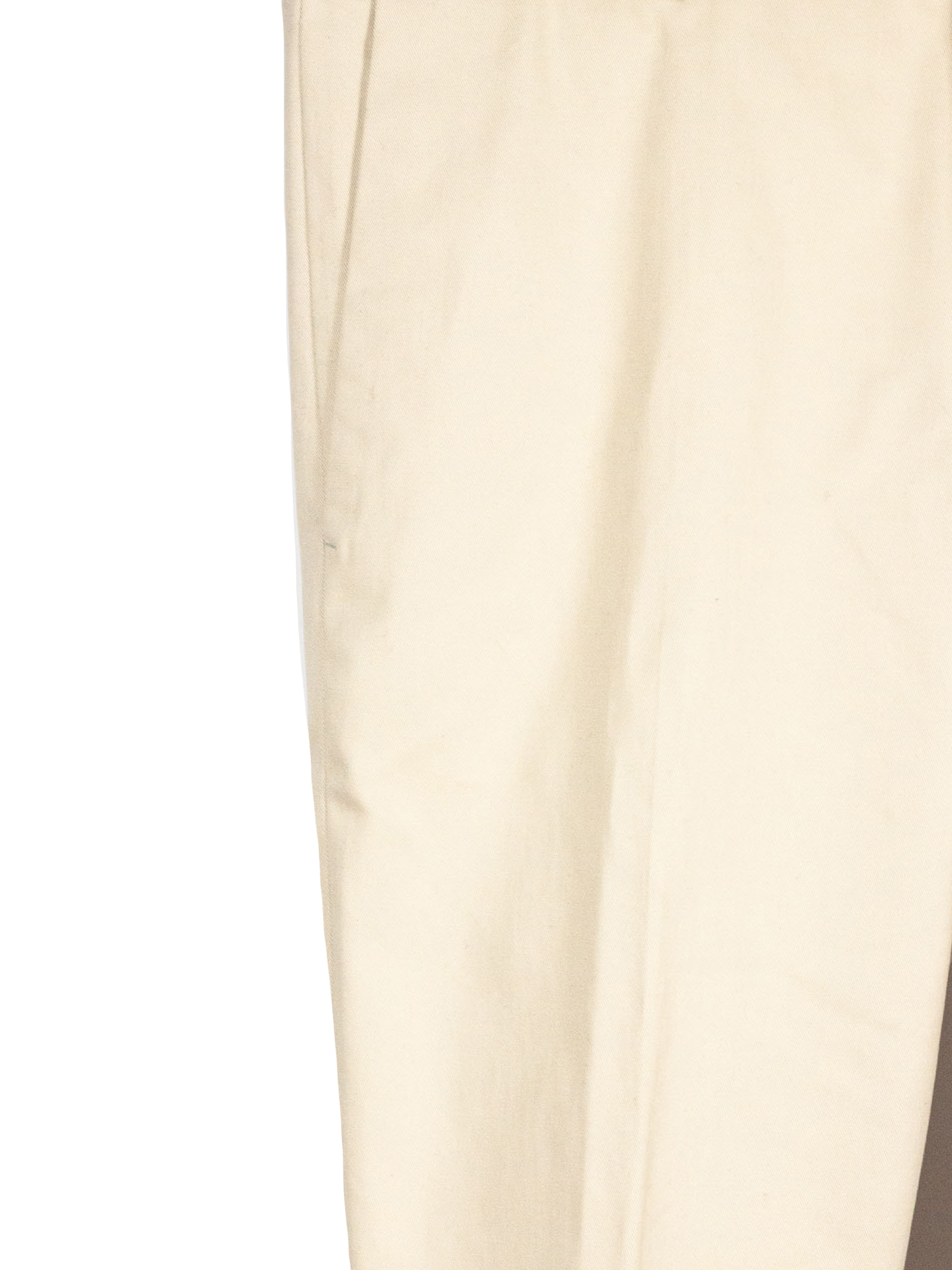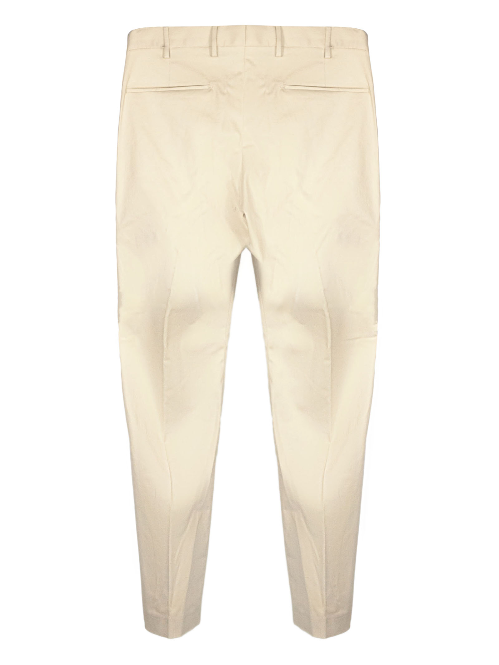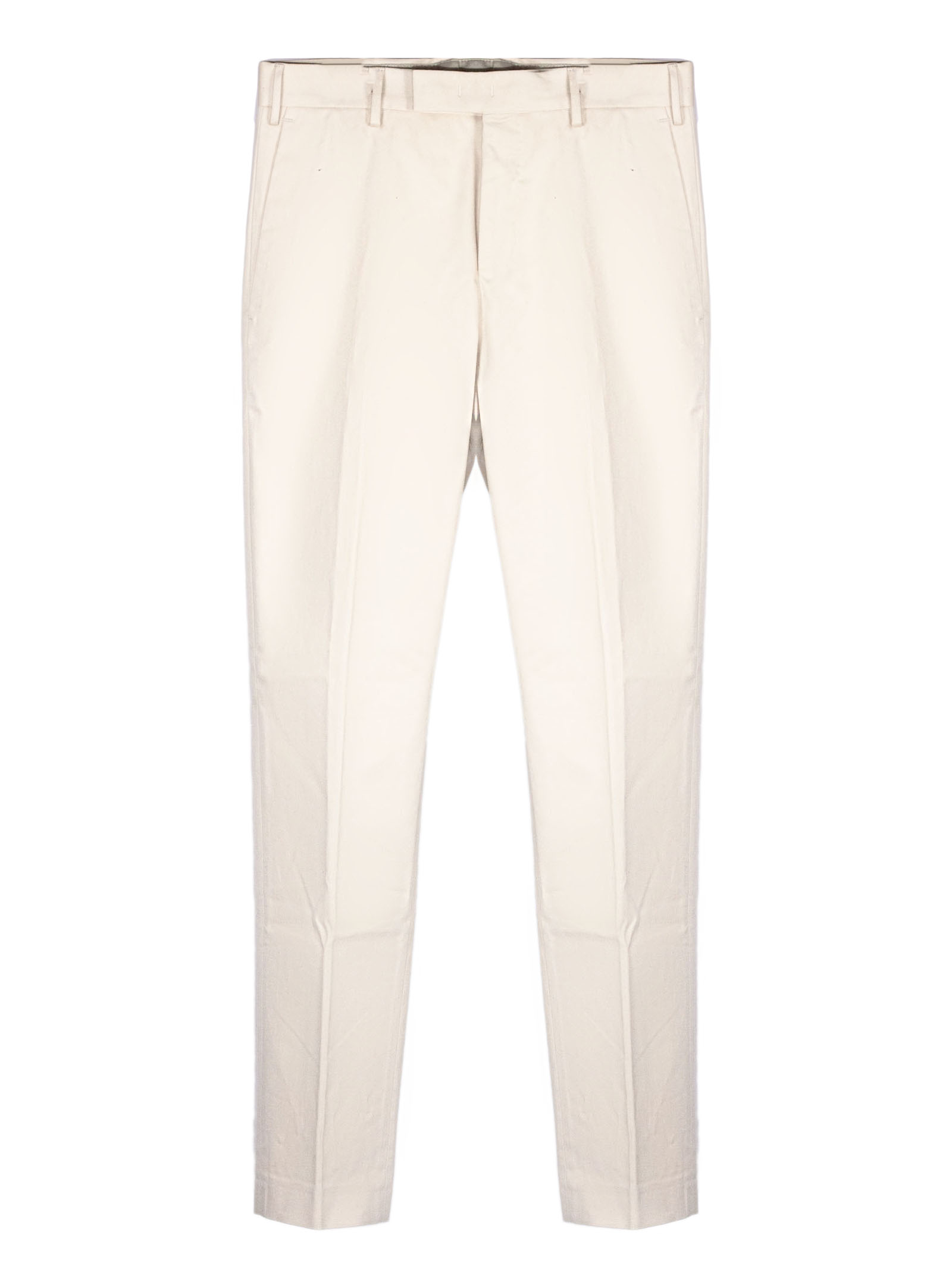Cream white cotton blend trousers with front zip closure and hidden hook, pleats, belt loops, side pockets, back pockets