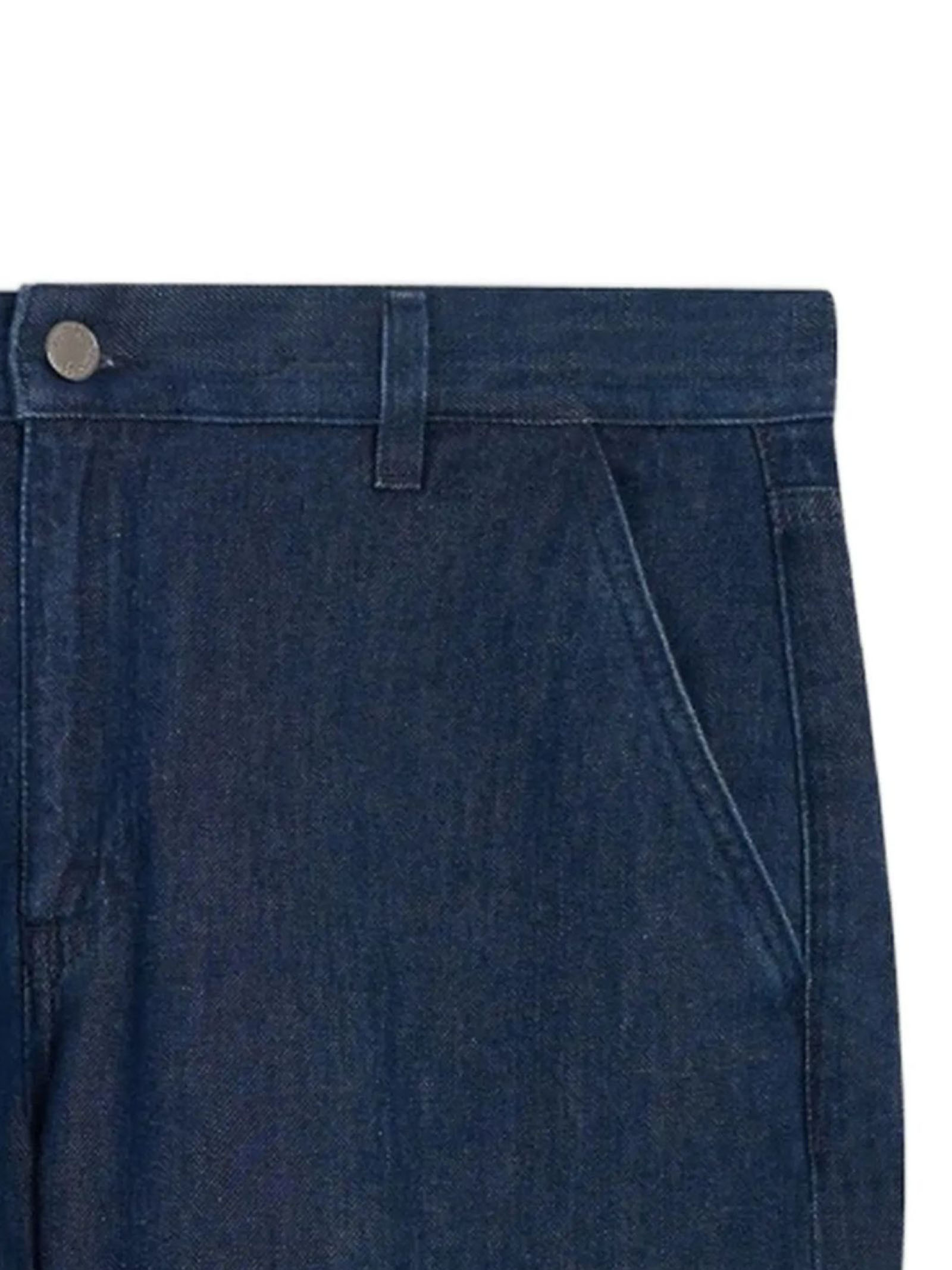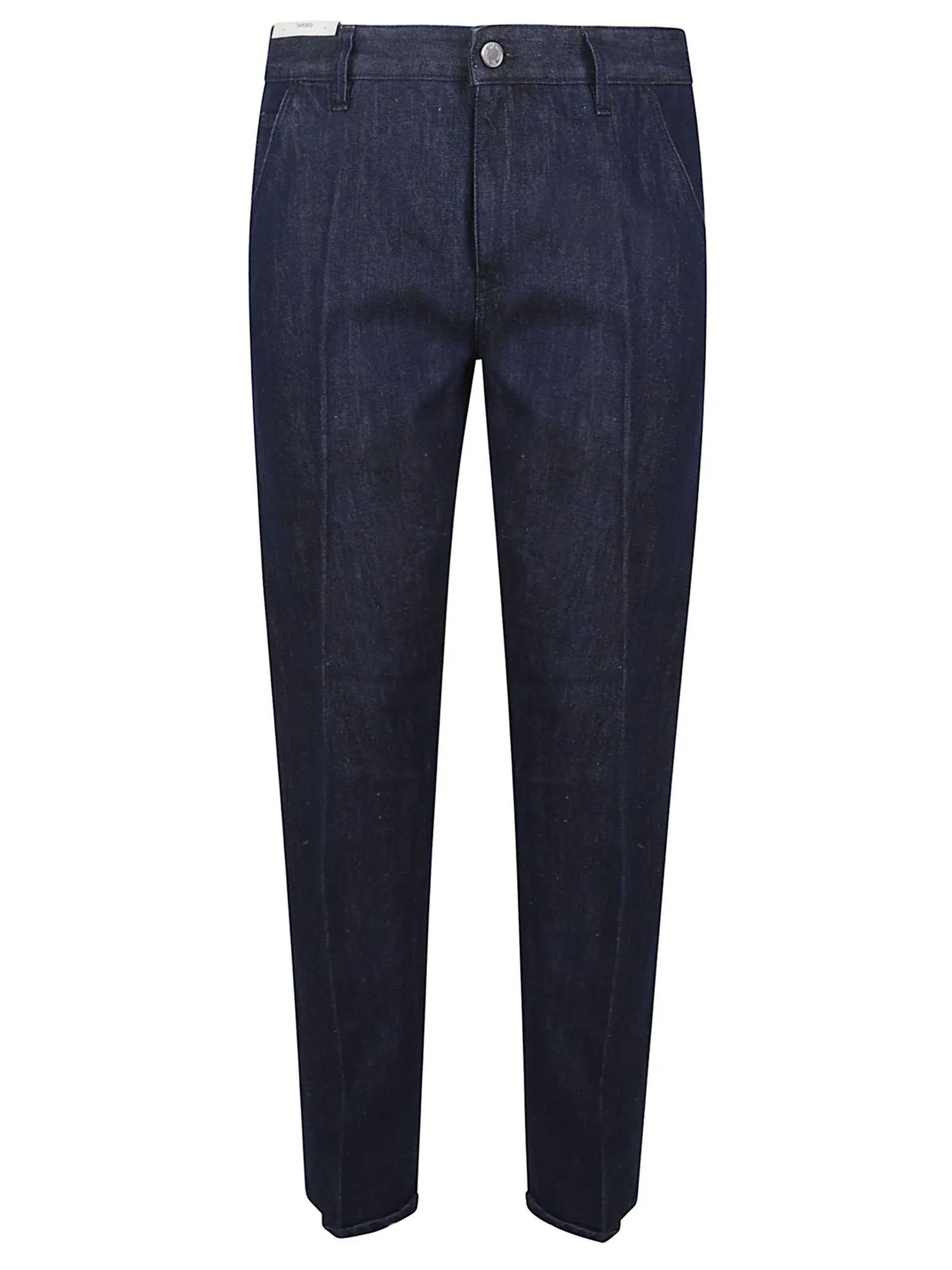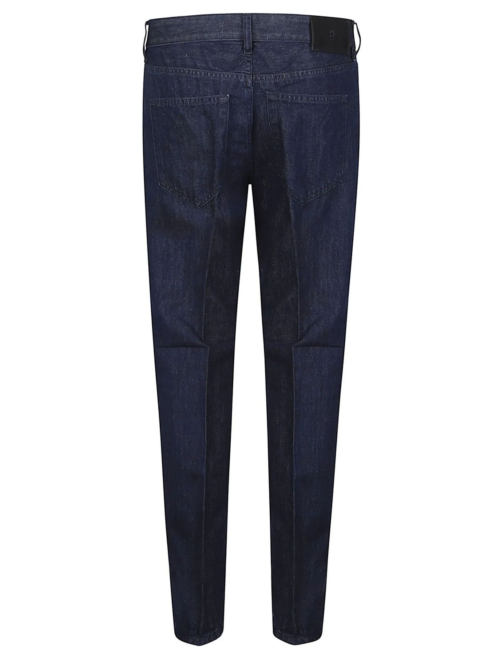 Deep indigo blue denim jeans, light blue stitching, regular fit, mid rise design, button and zip closure
