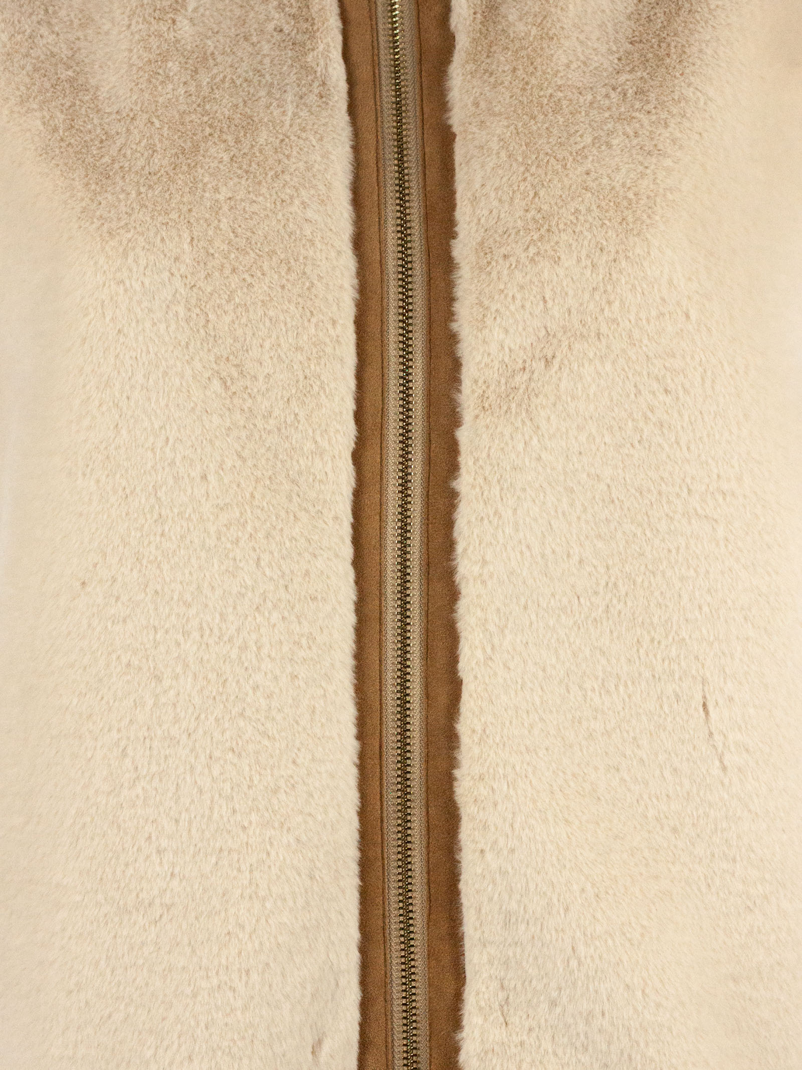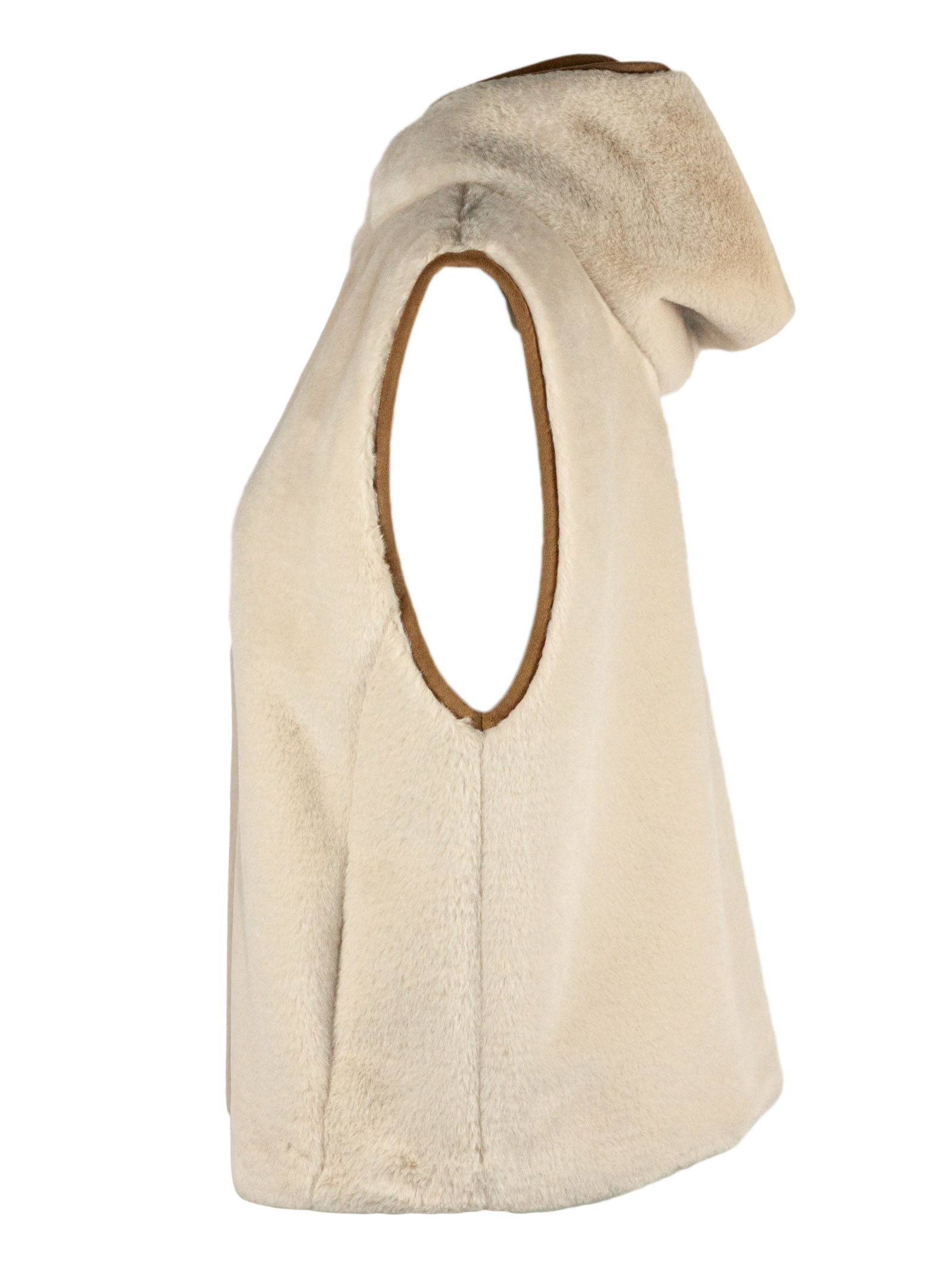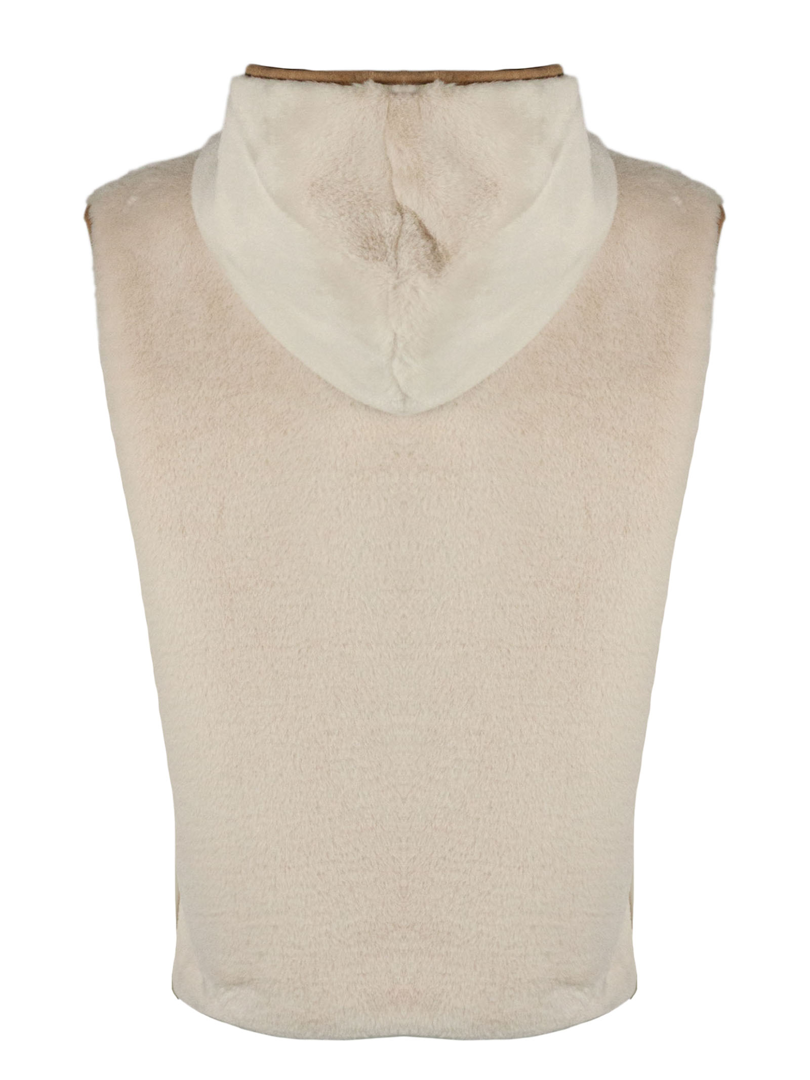 Beige faux fur polyester waistcoat, hood, front zip fastening, sleeveless, 96% Polyester 4%Elastane
