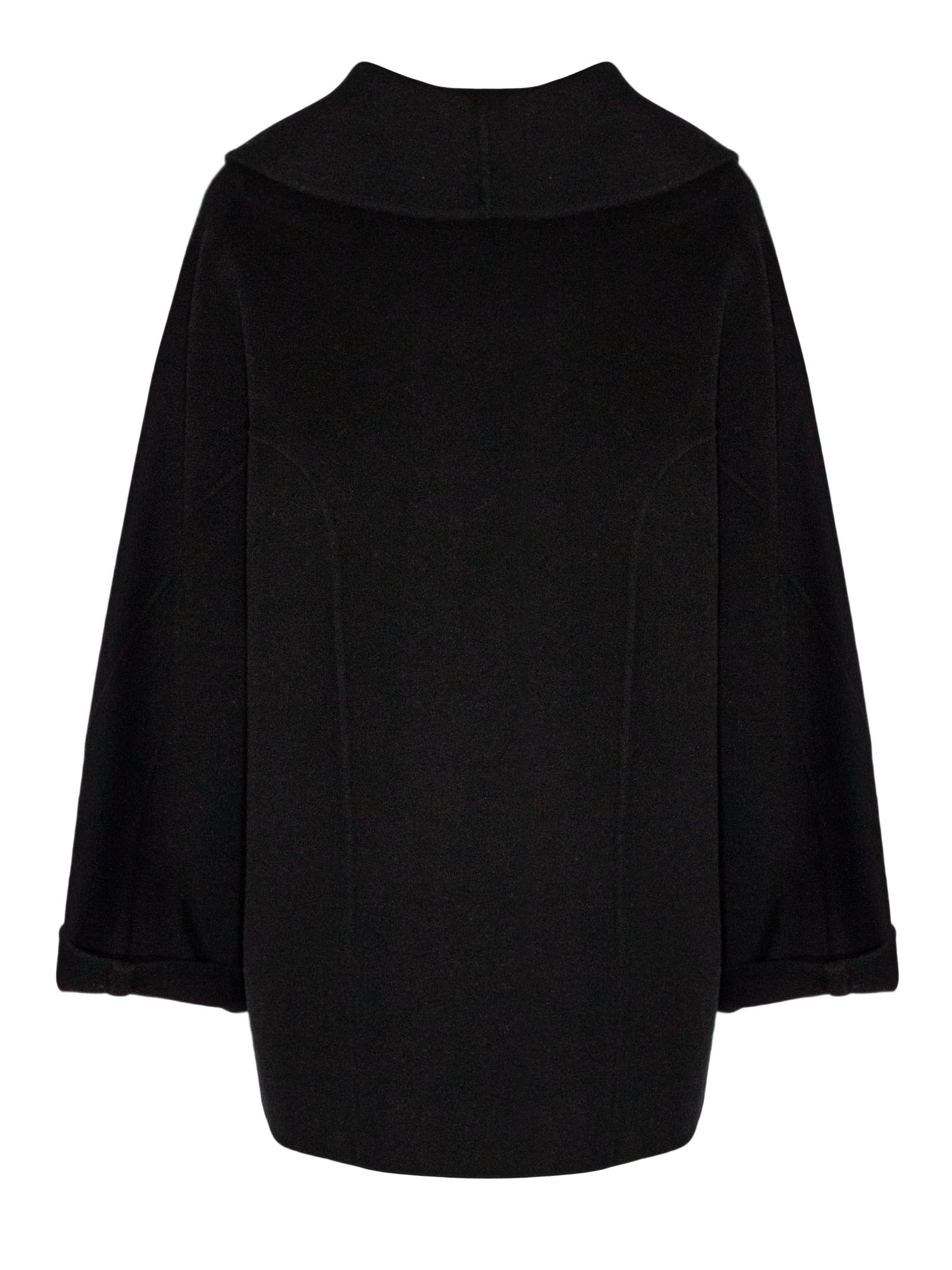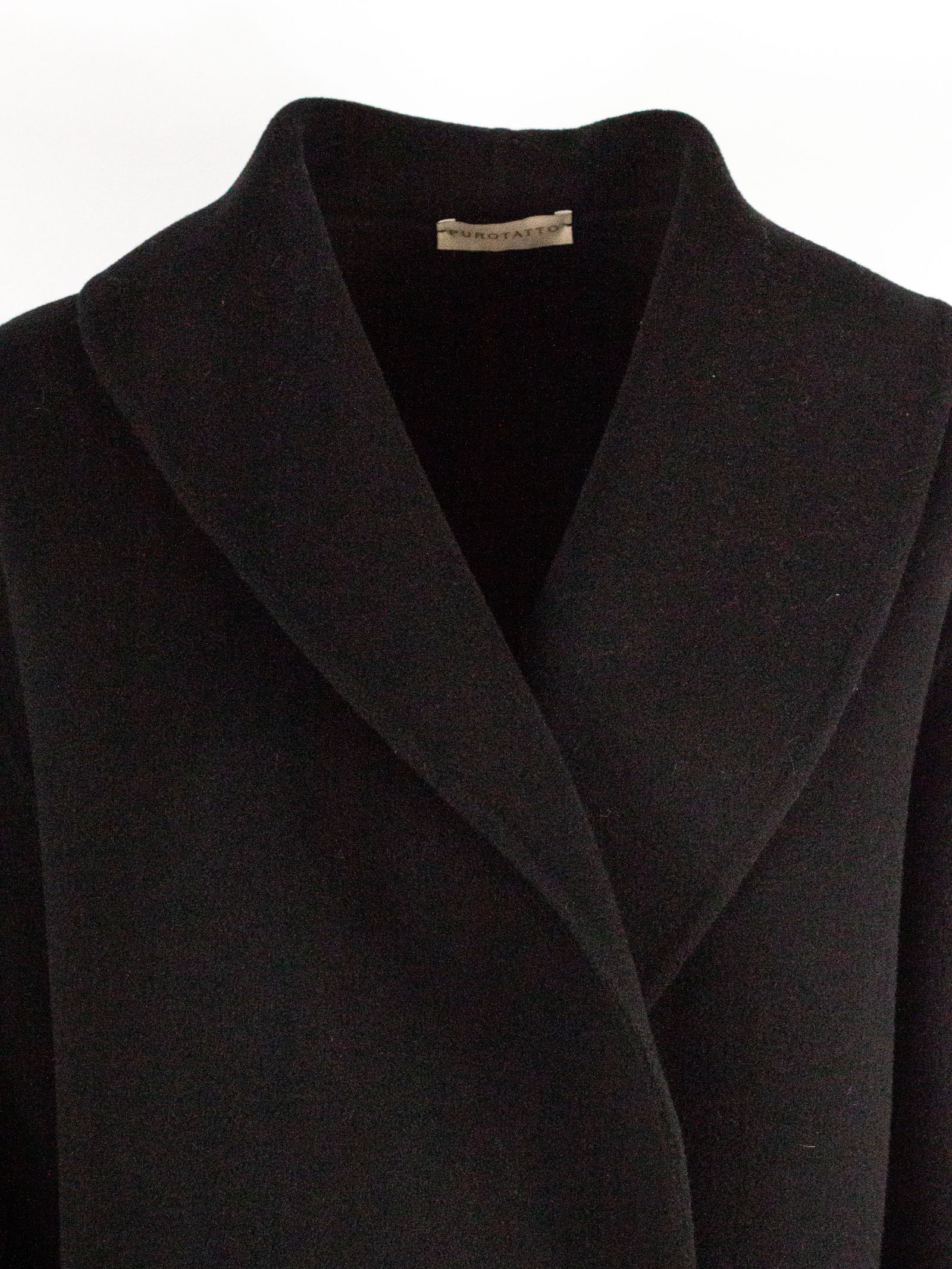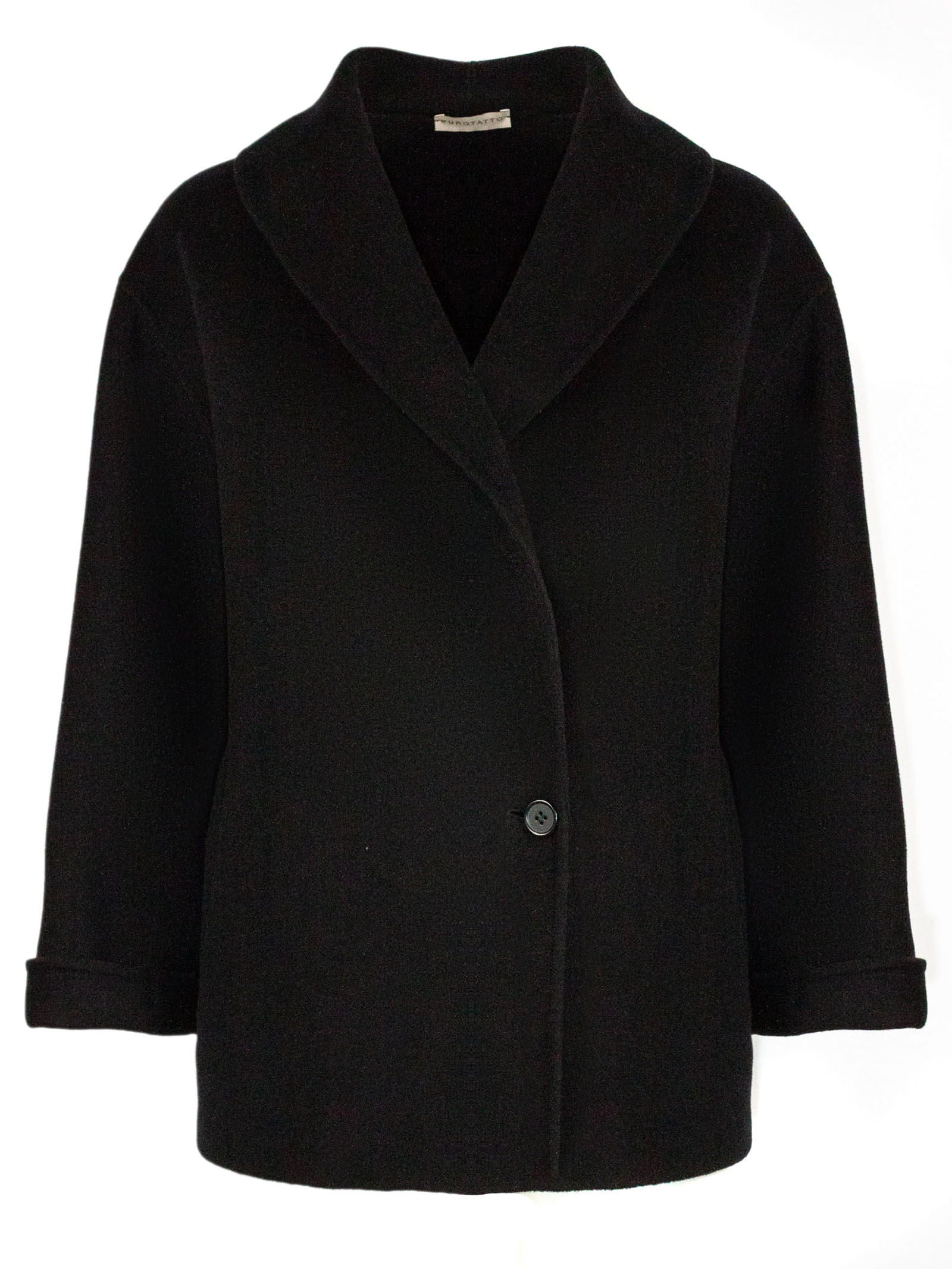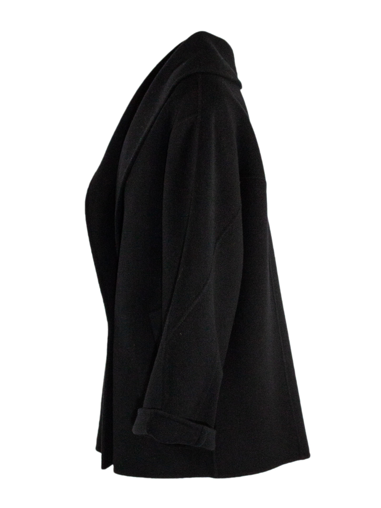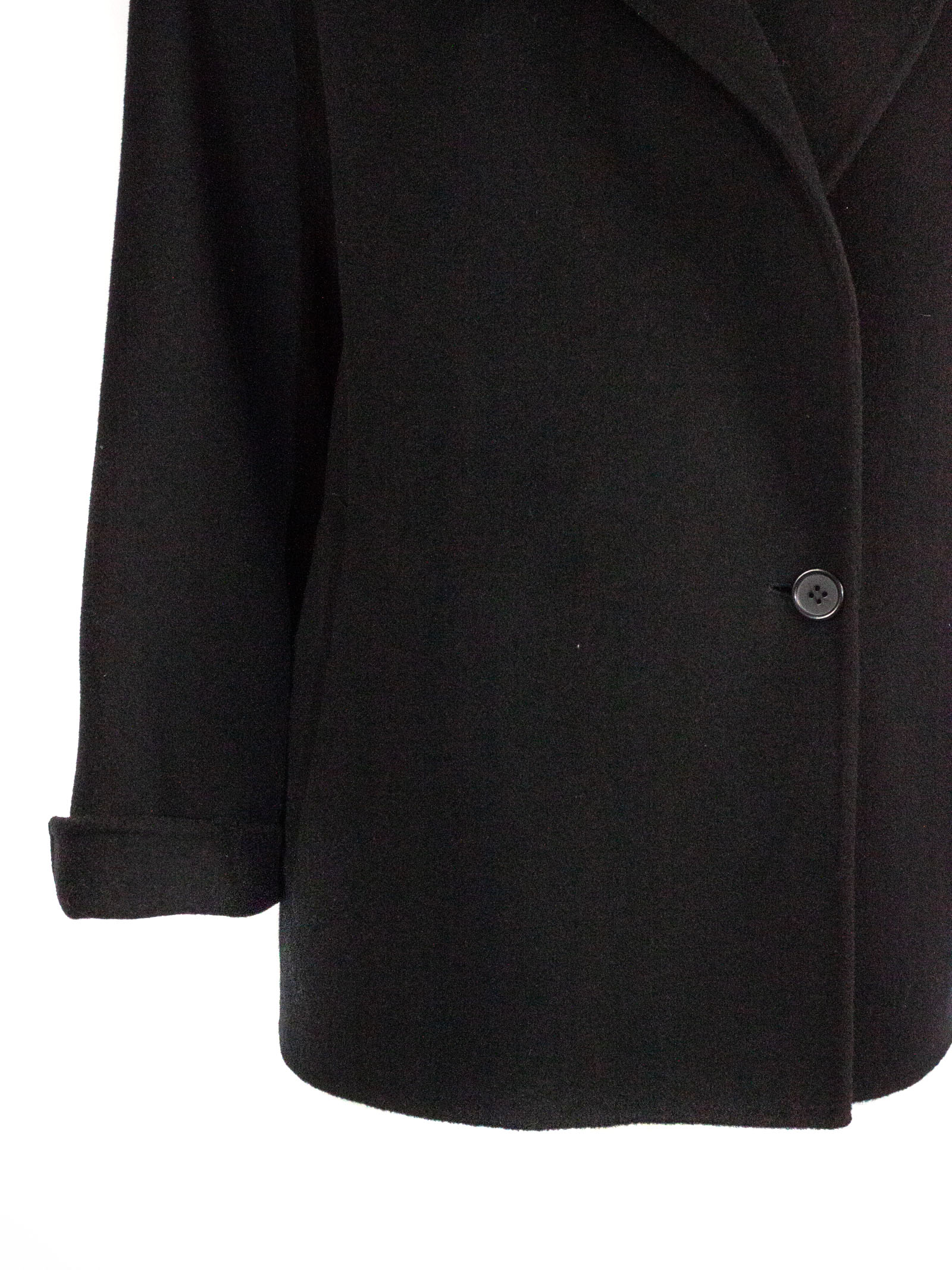 Black wool and cashmere blend coat, wide shawl collar, single button front closure, cuffed sleeves, unlined