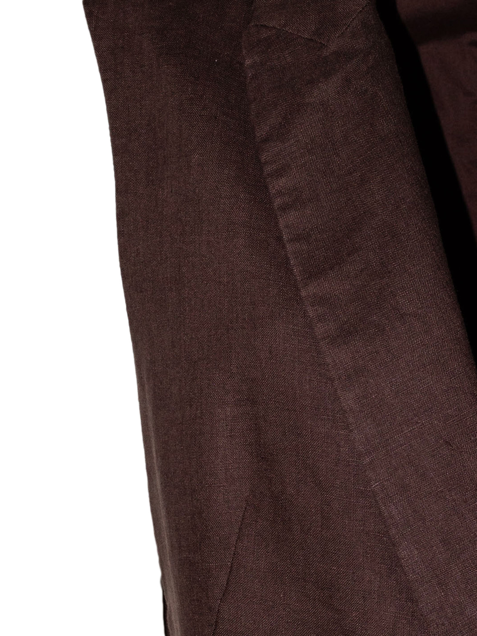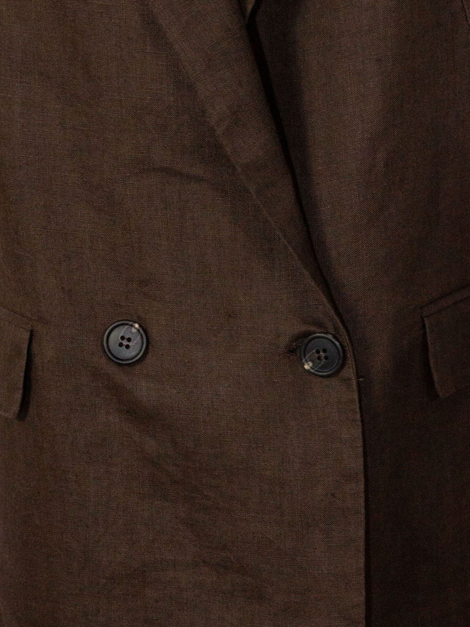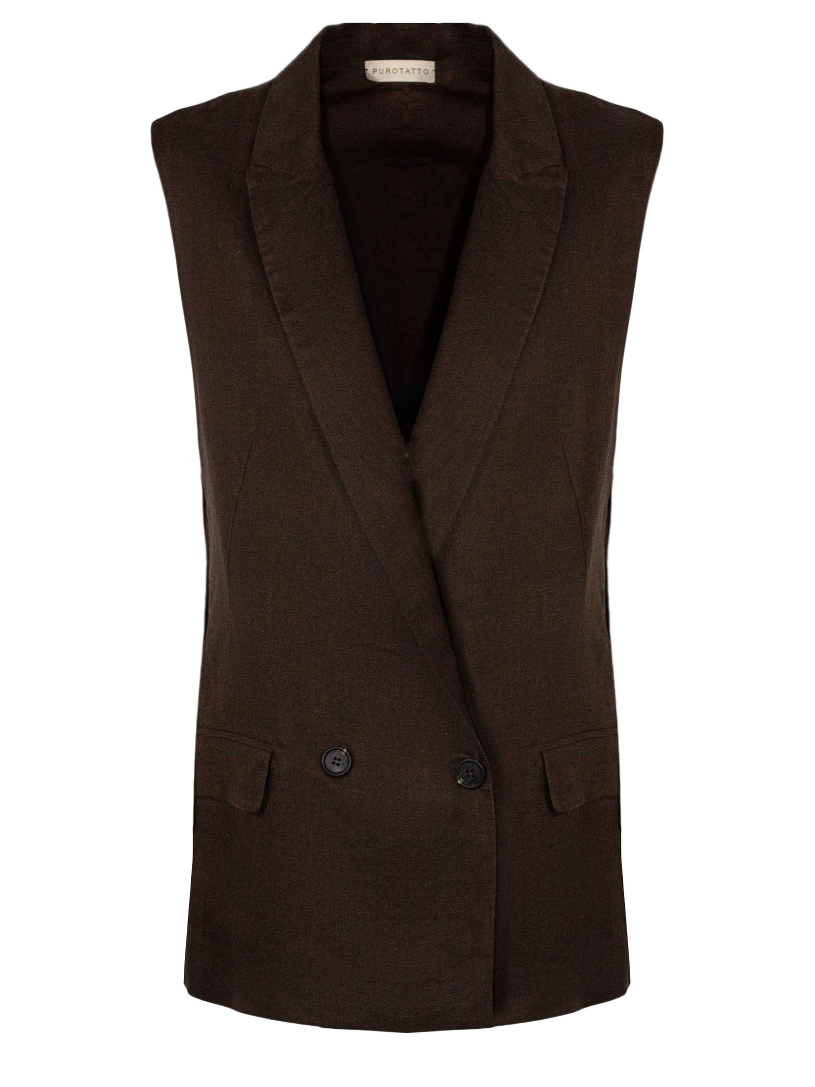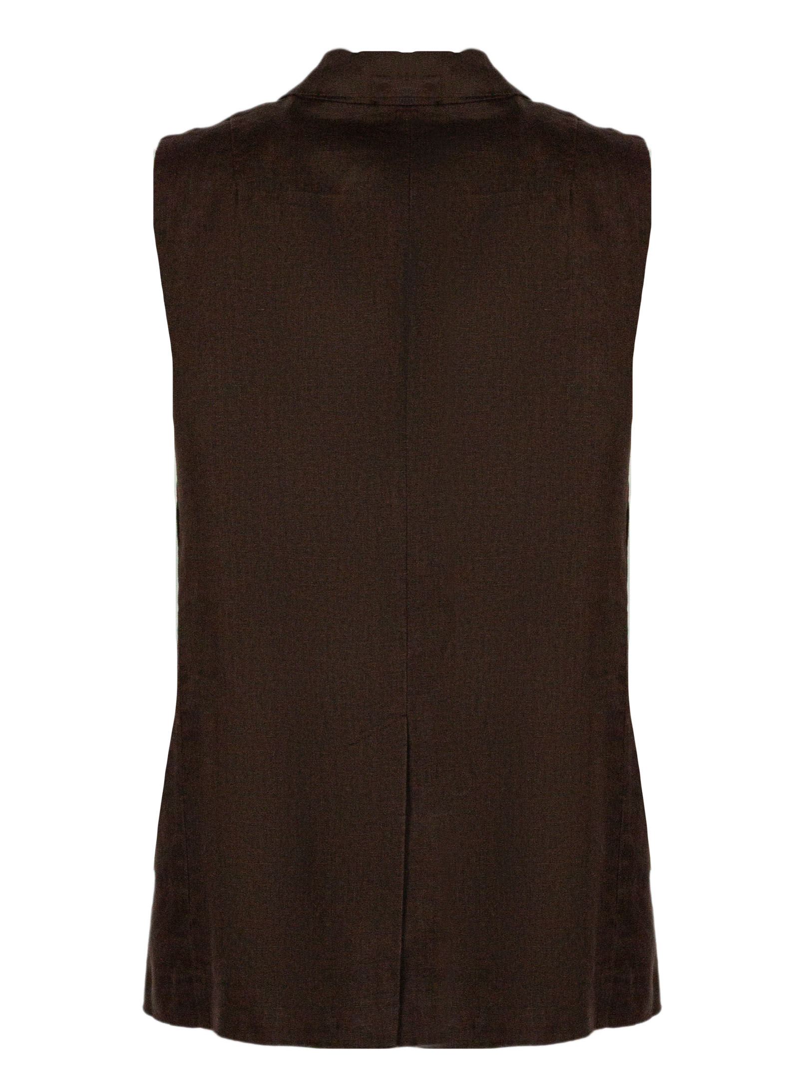 Dark brown linen-blend vest, sleeveless style, double-button front closure, classic elegant lapels, front flap pockets, straight and modern fit, lightweight and comfortable fabric