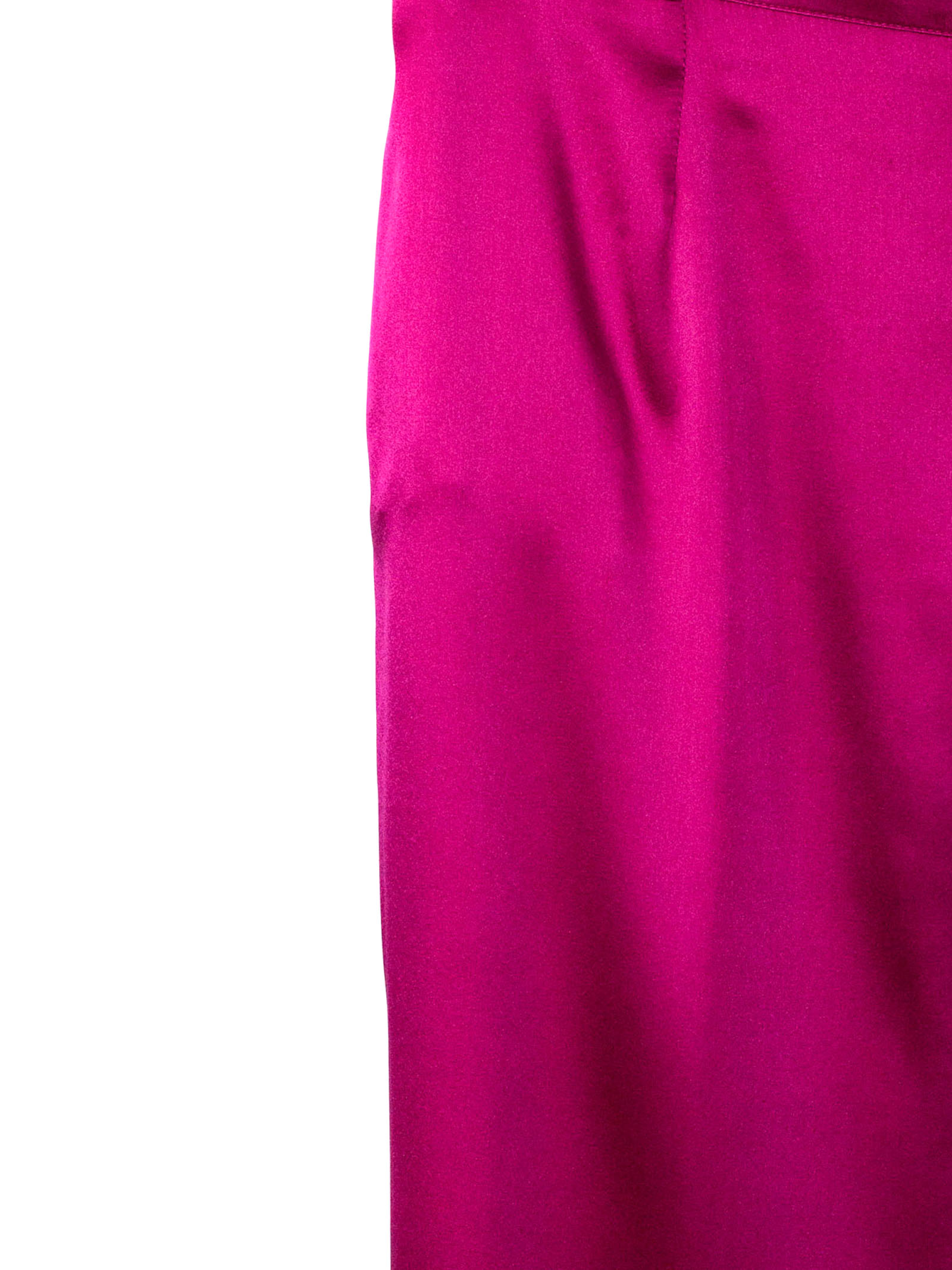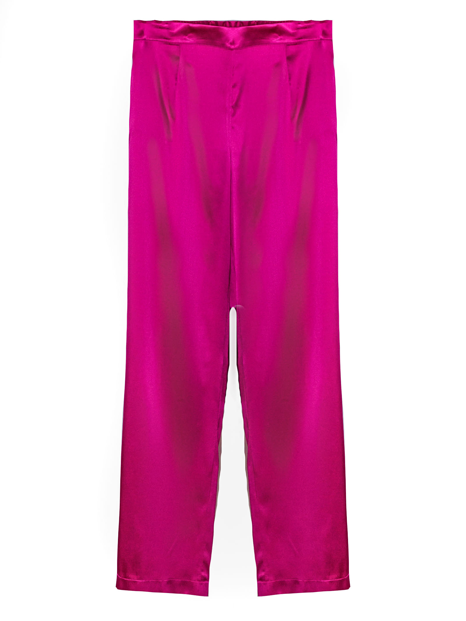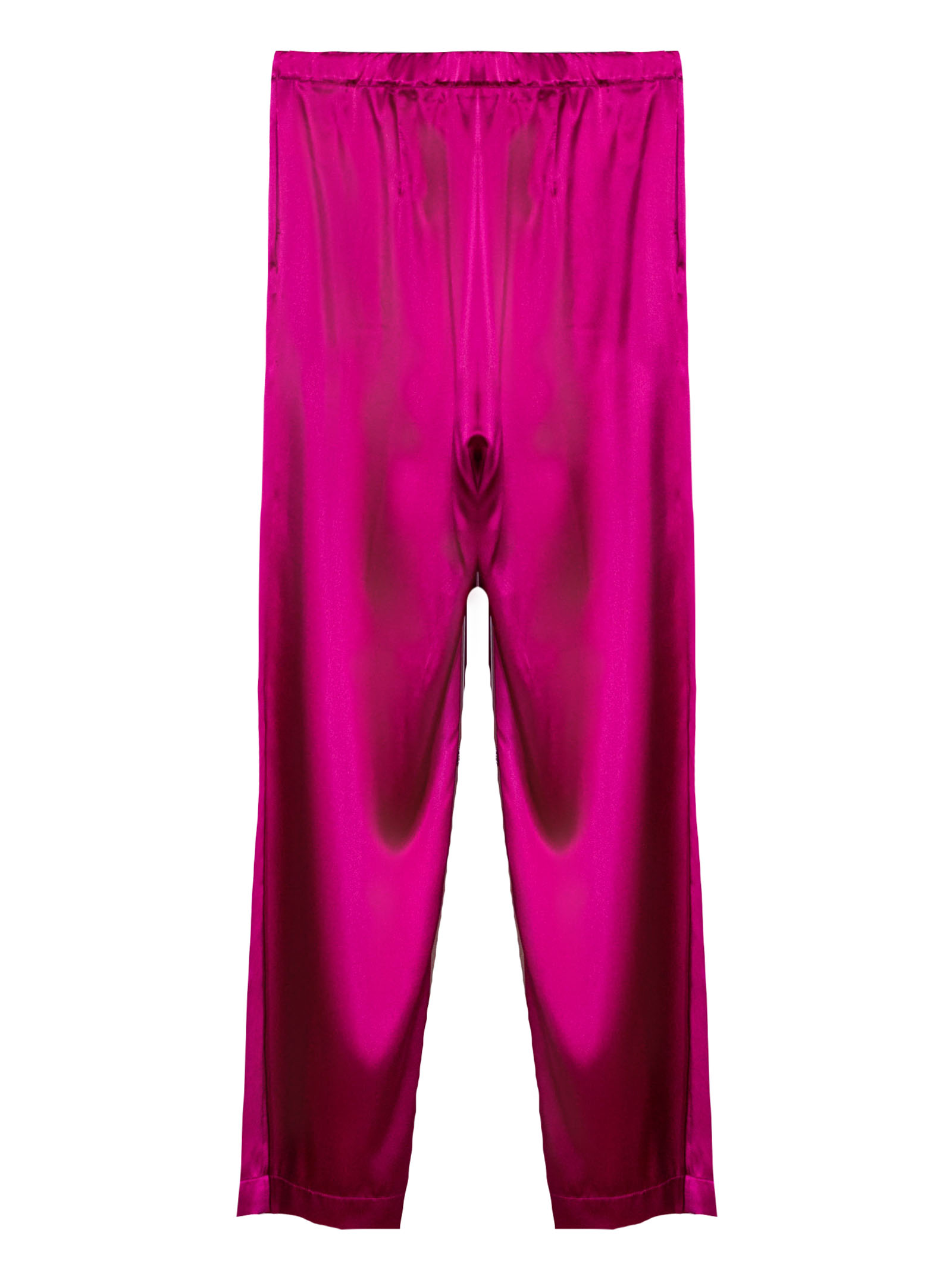 Fuchsia pants made from a silk blend, with a loose, flowing fit, an elastic waistband, lightweight, lustrous fabric, and an elegant silhouette with a soft drape