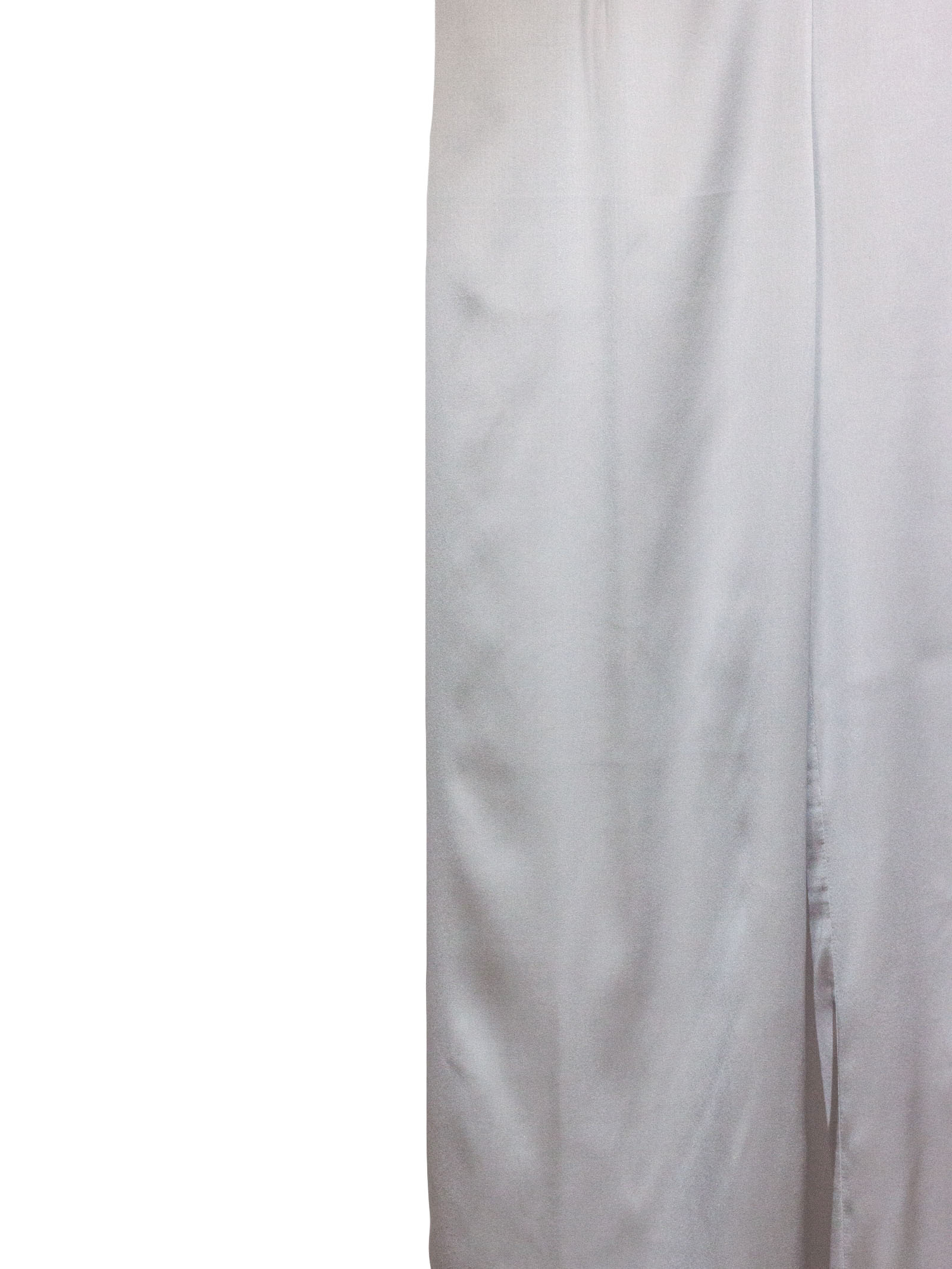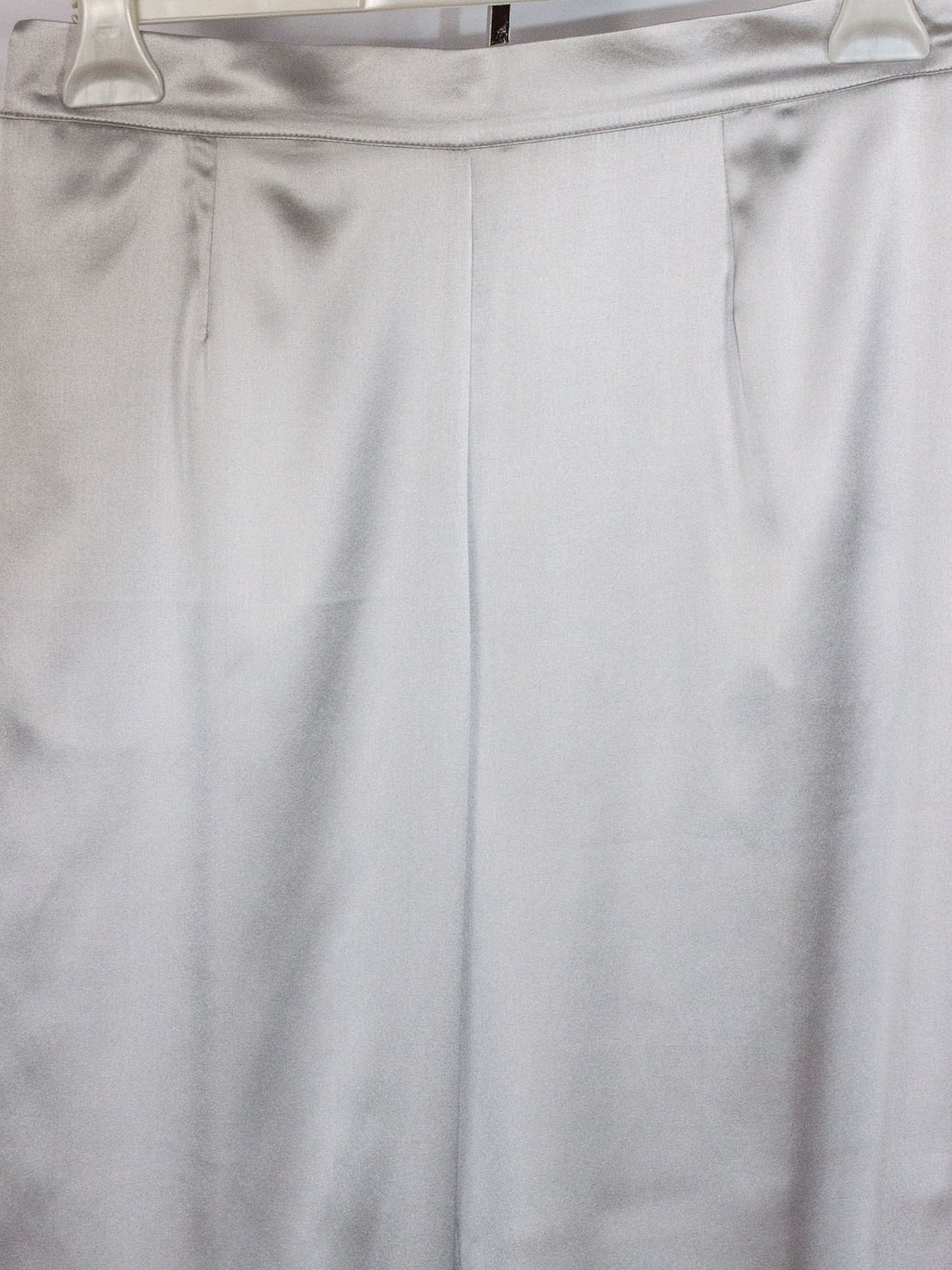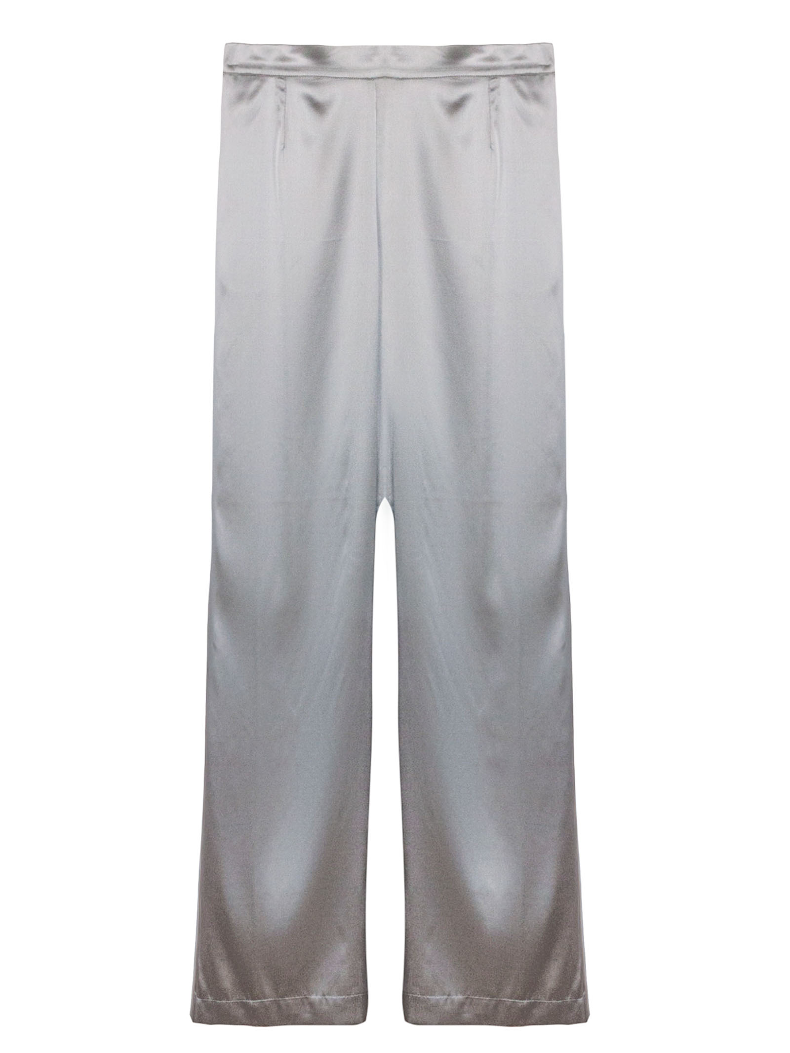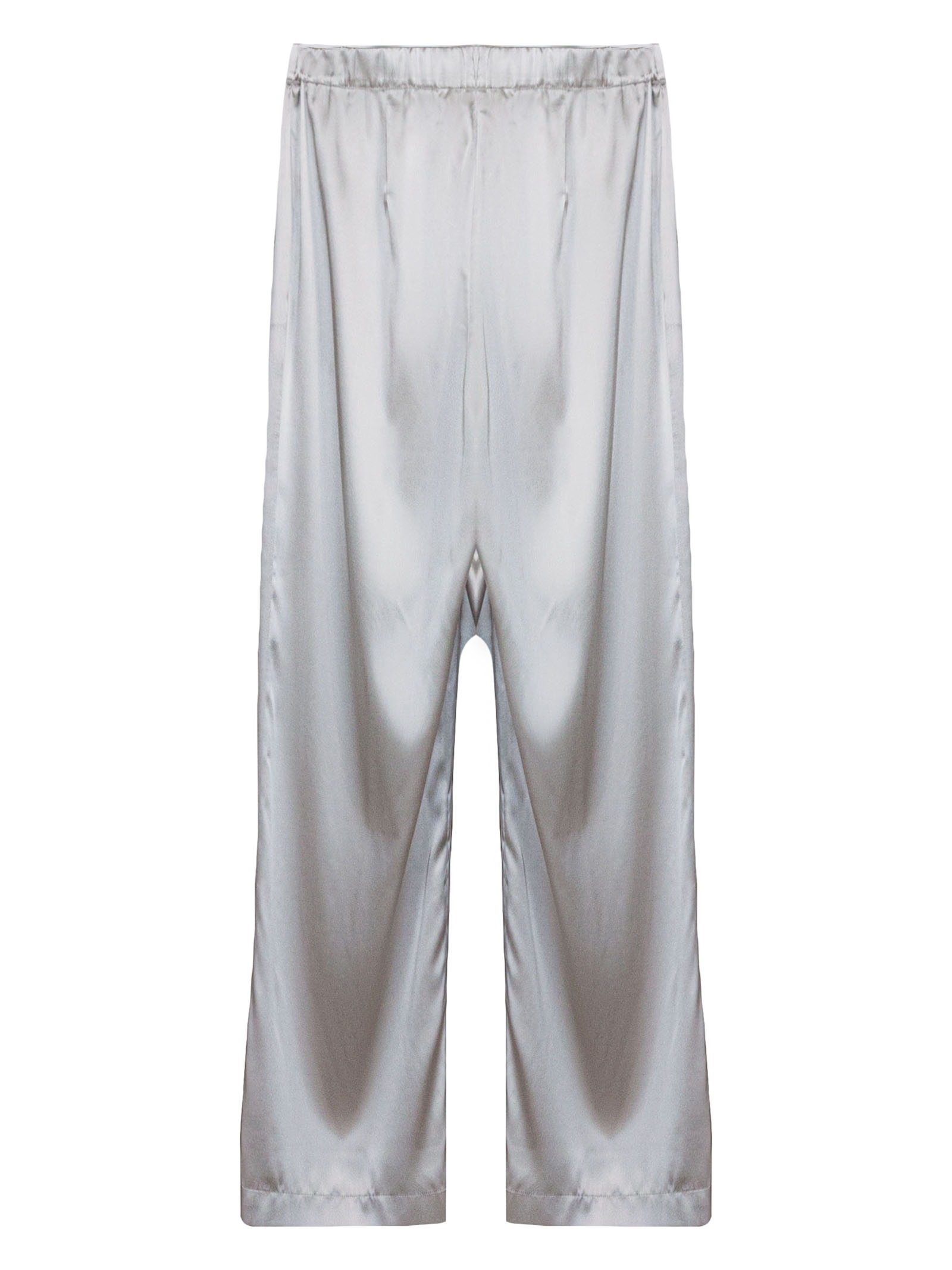 Grey pants made from a silk blend, with a loose, flowing fit, an elastic waistband, lightweight, lustrous fabric, and an elegant silhouette with a soft drape
