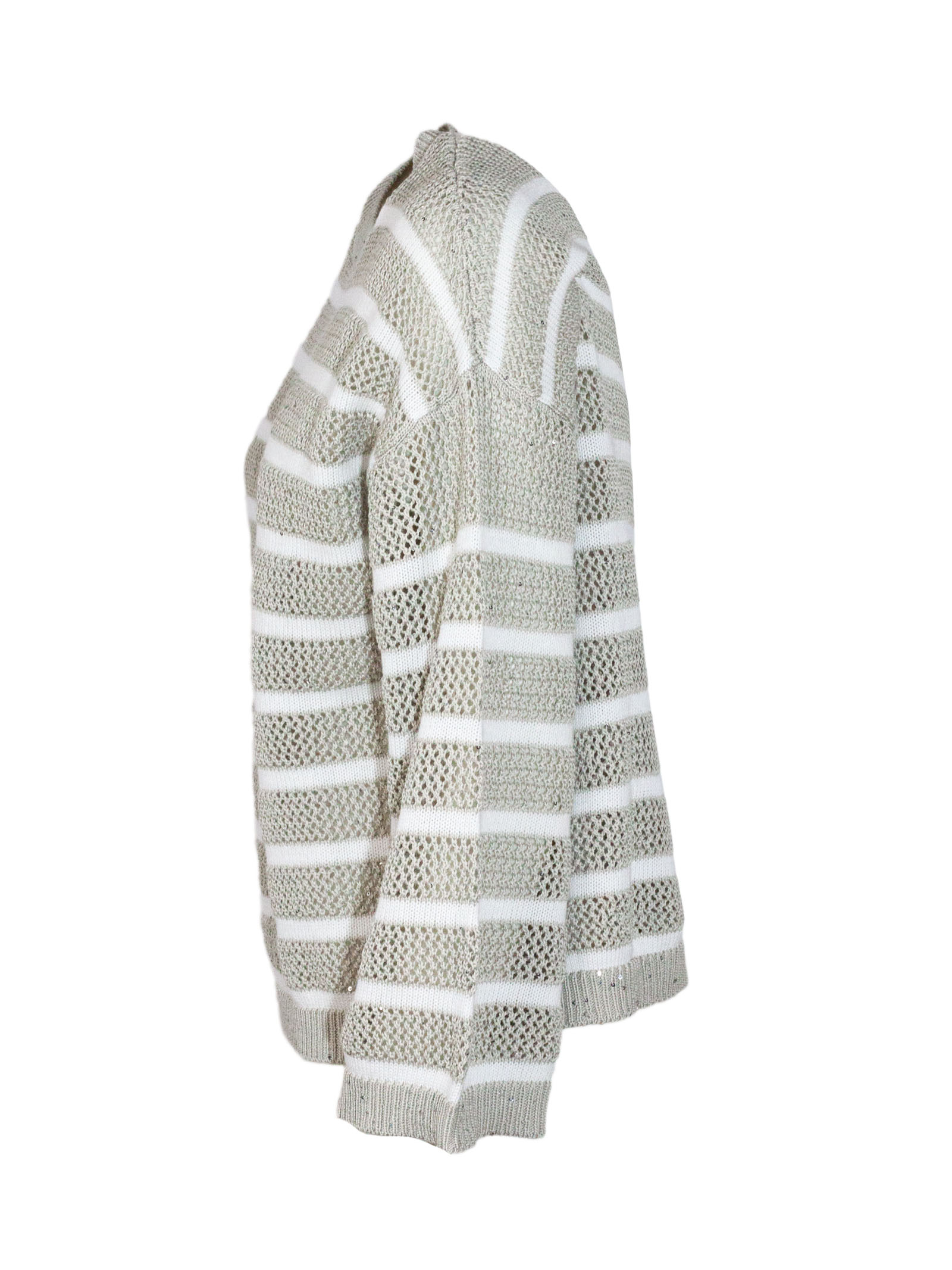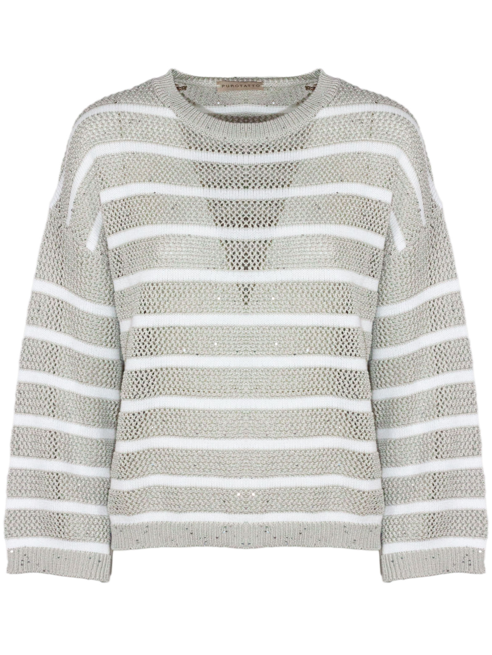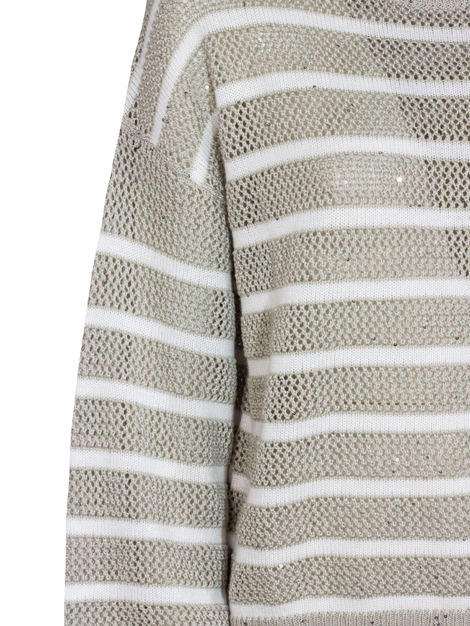 Striped cotton-blend sweater, lightweight fabric, long sleeves, round neckline, lurex details, gray and white