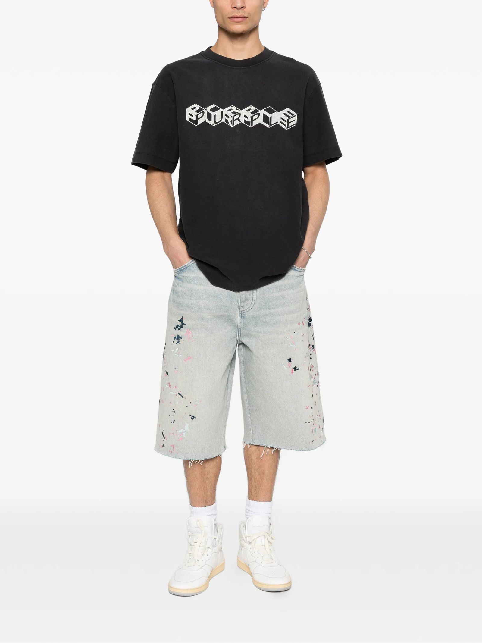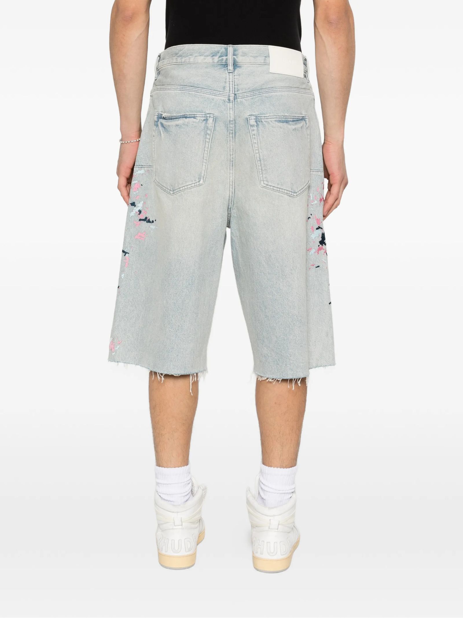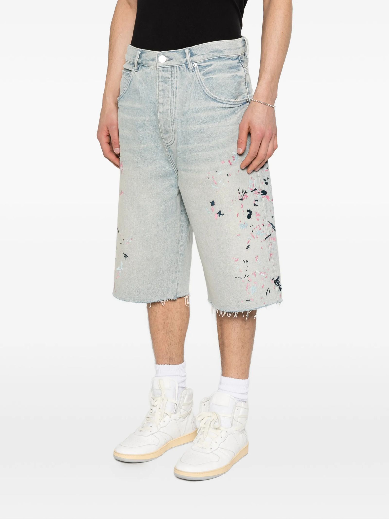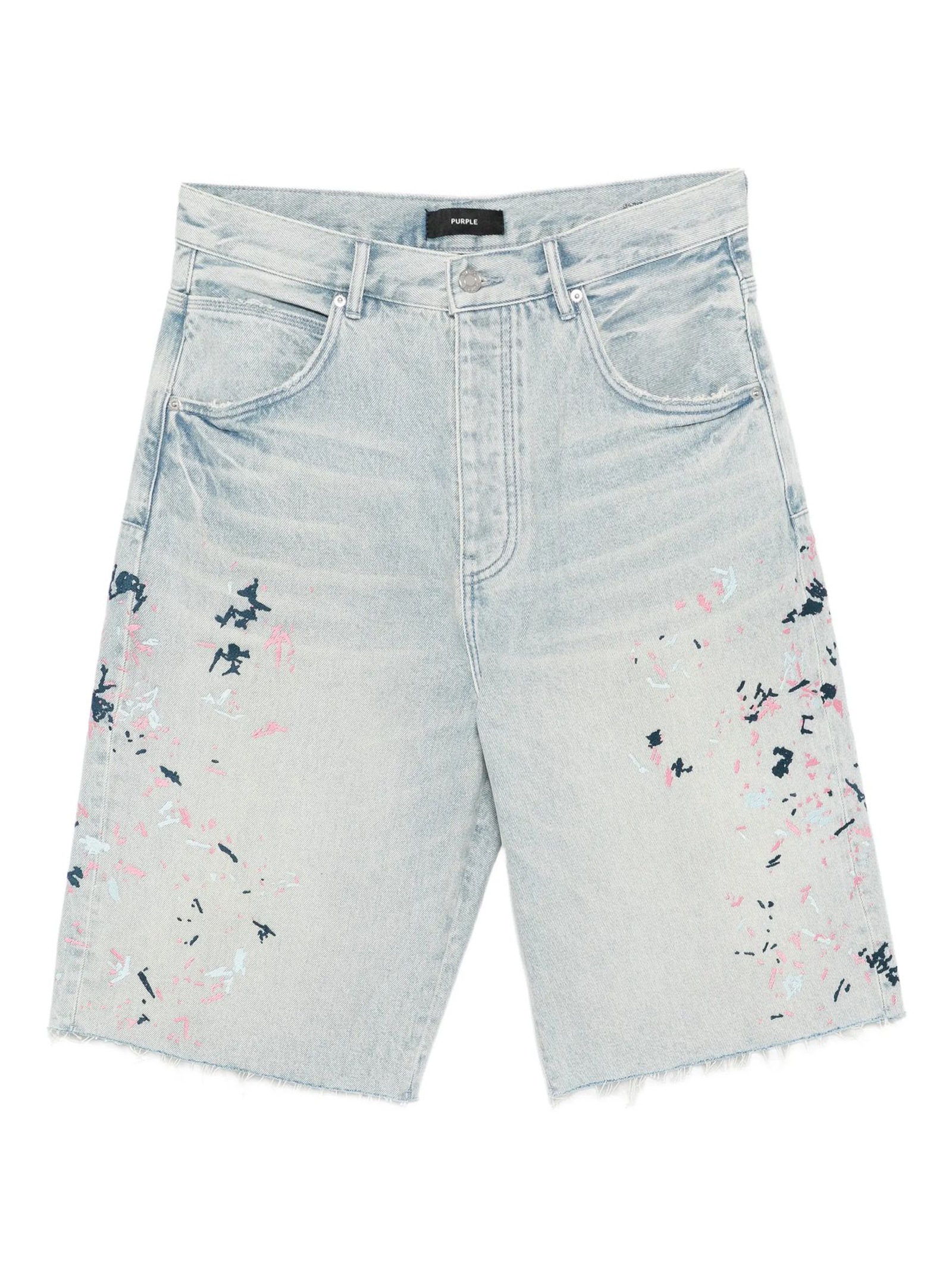 Light indigo cotton denim shorts with a patent-leather effect, frayed hem, five pockets, belt loops and button fastening