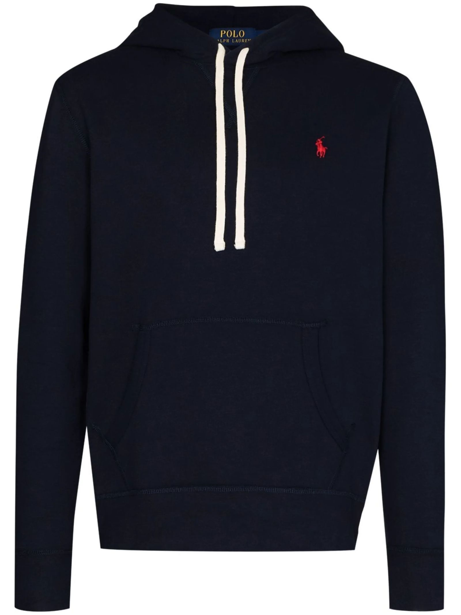 Blue cotton sweatshirt, drawstring hood with ribbed V-shaped insert, long sleeves with ribbed cuffs, kangaroo pocket, ribbed hem, exclusive embroidered pony on the left side of the chest.
