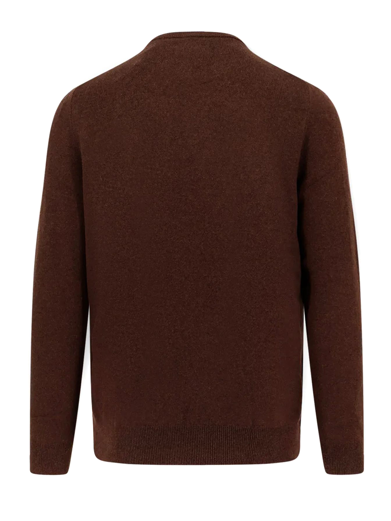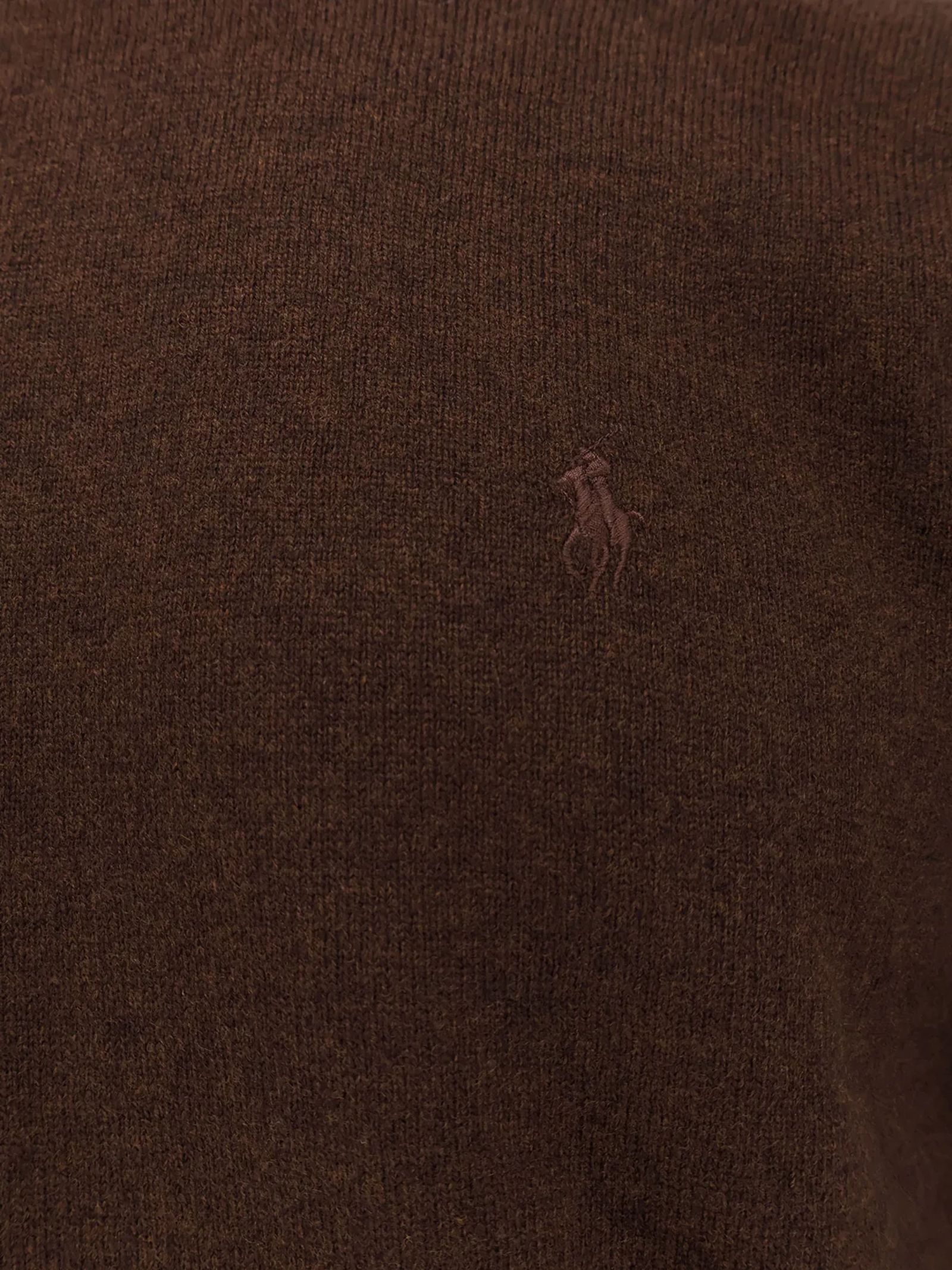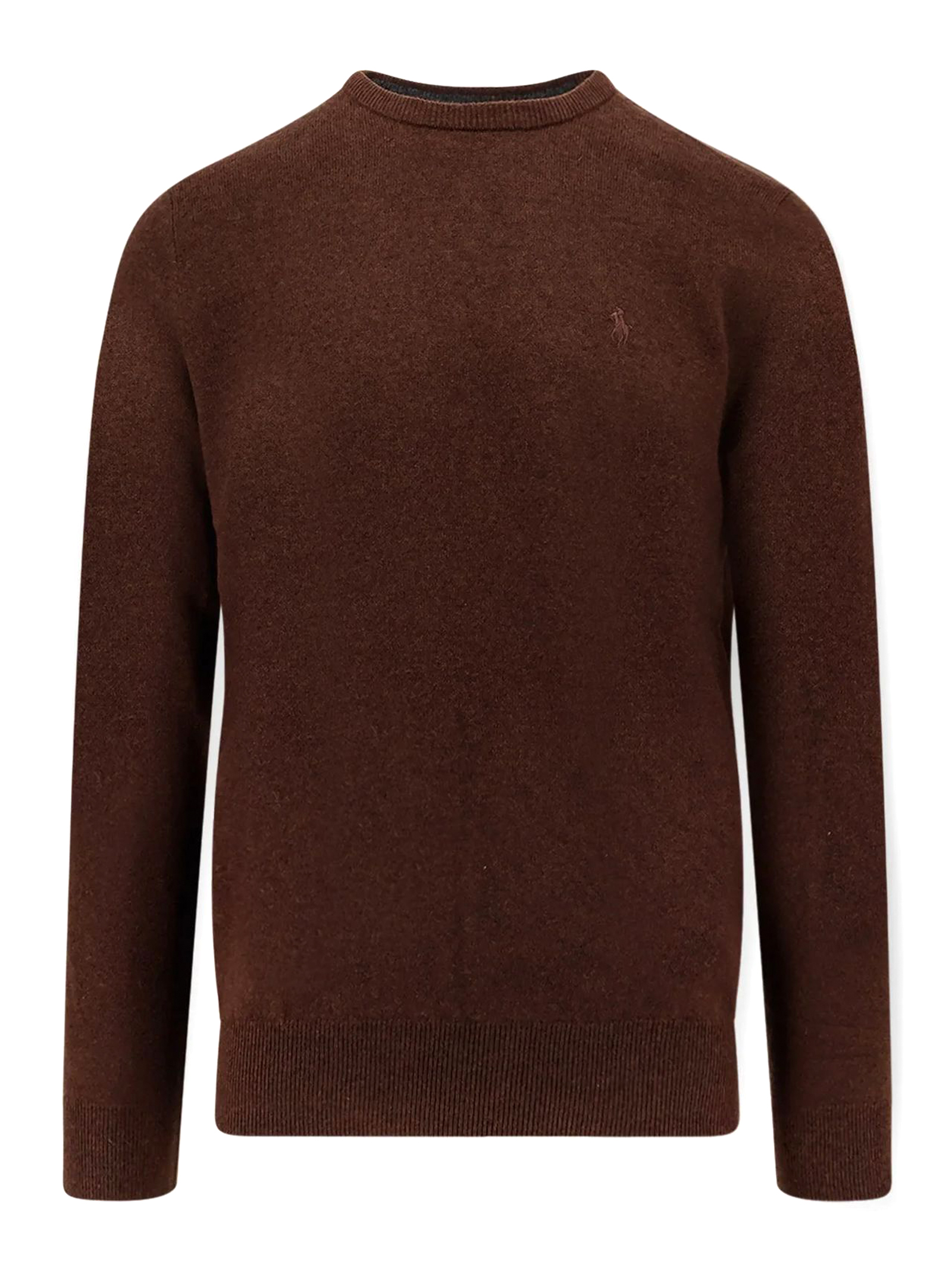 Brown wool sweater, ribbed neckline, embroidered logo, long sleeves, fitted cuffs