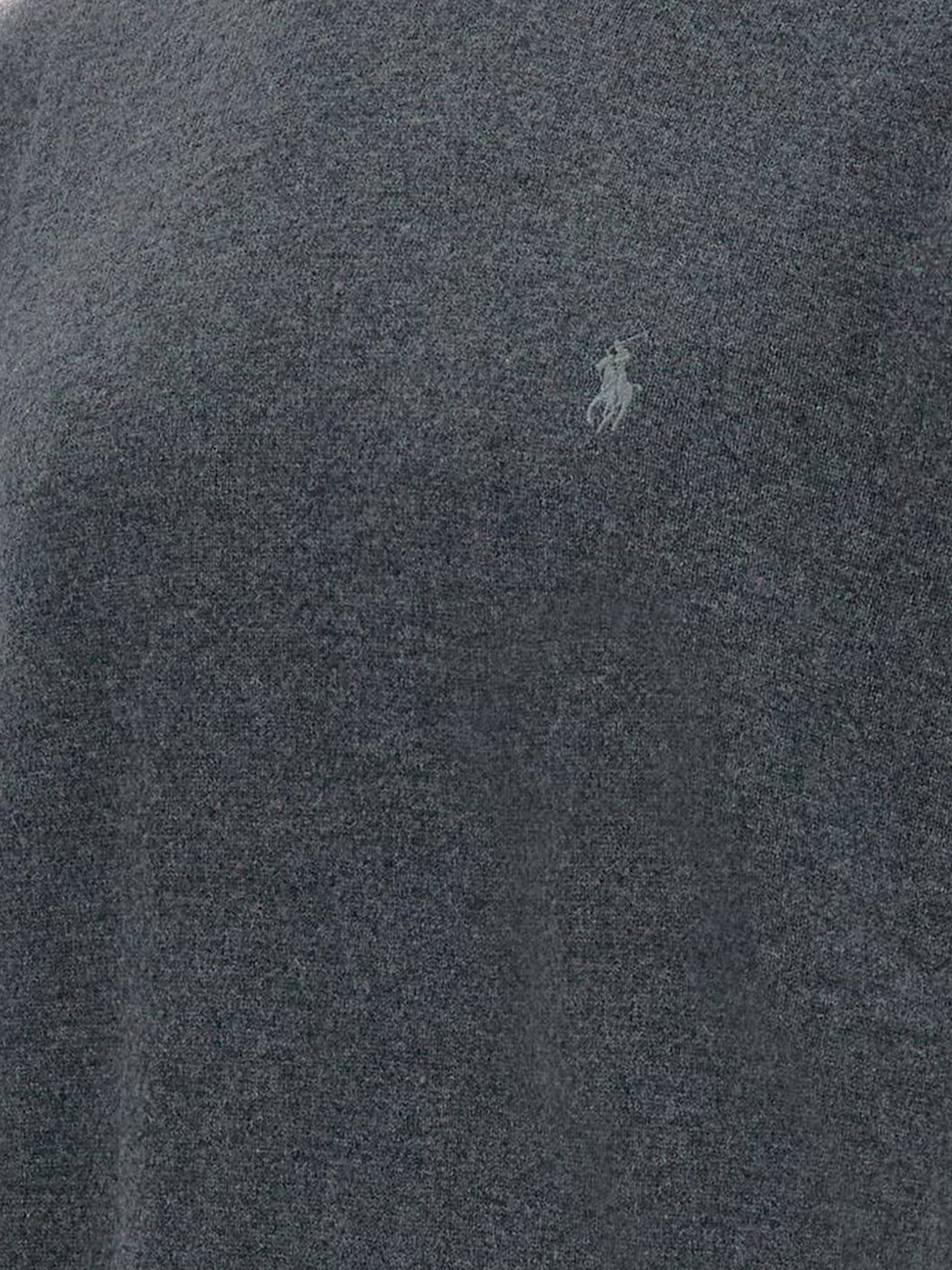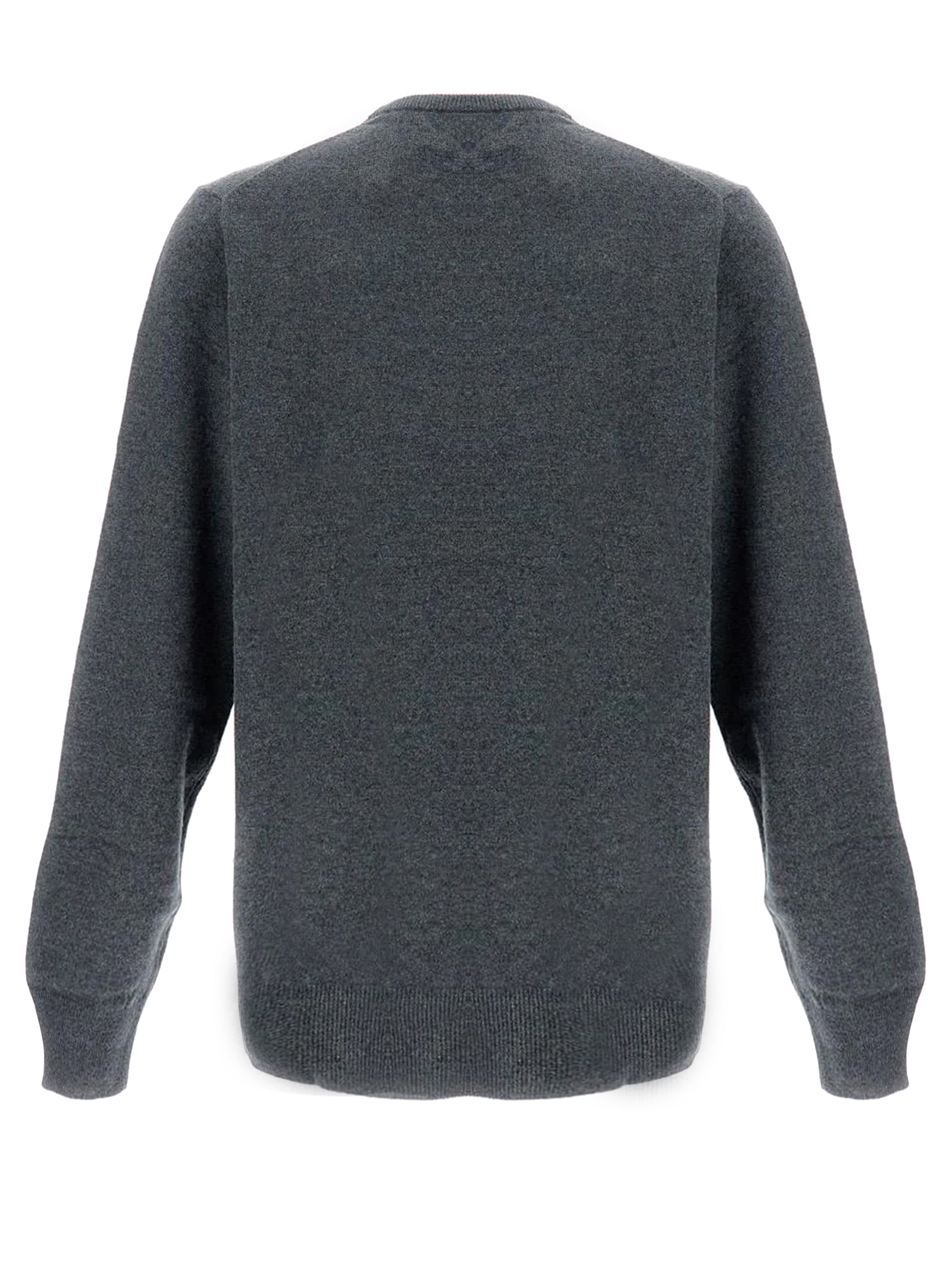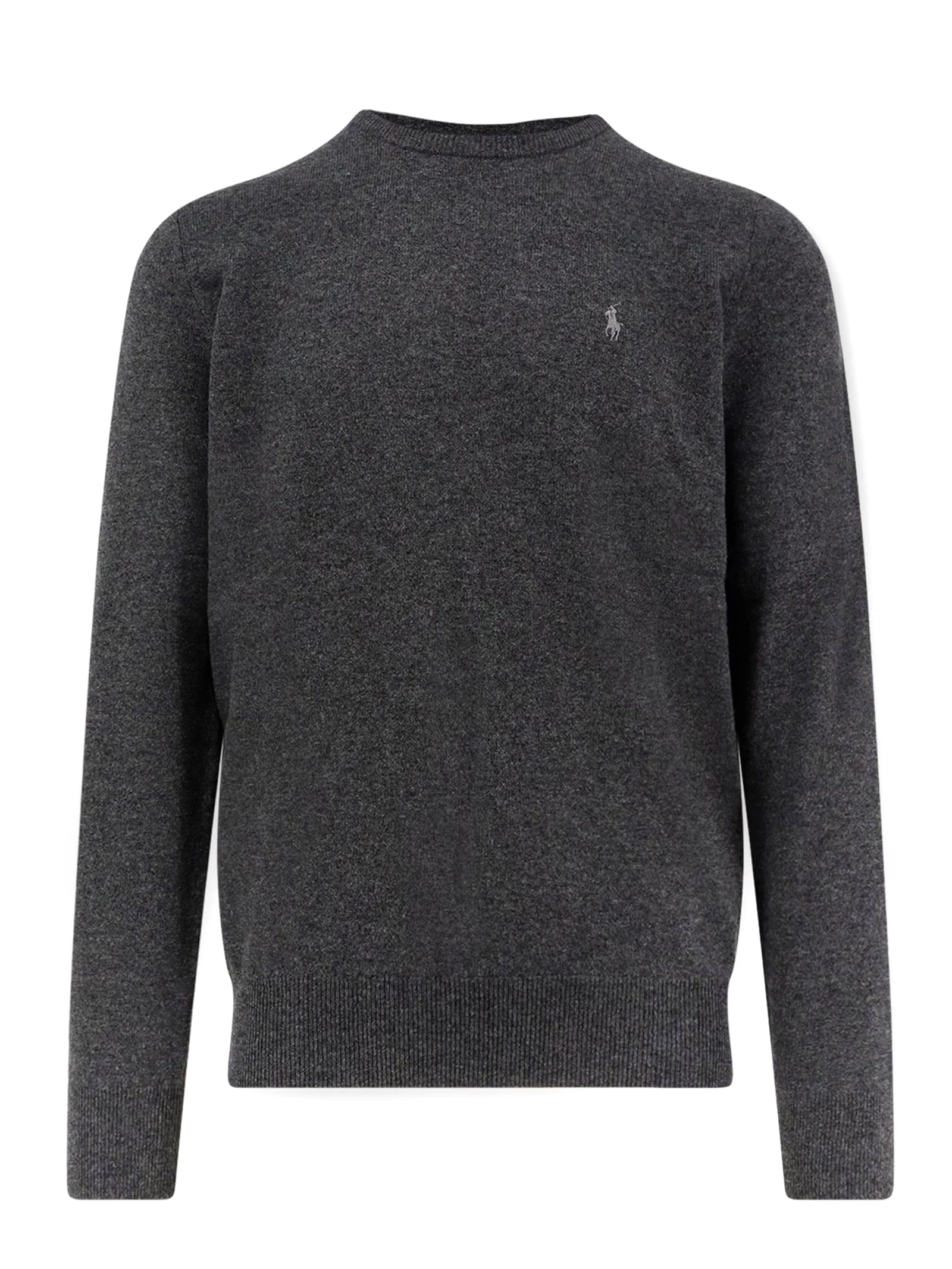 Grey merino wool sweater, crew neck, long sleeves, embroidered logo at the chest, straight hem