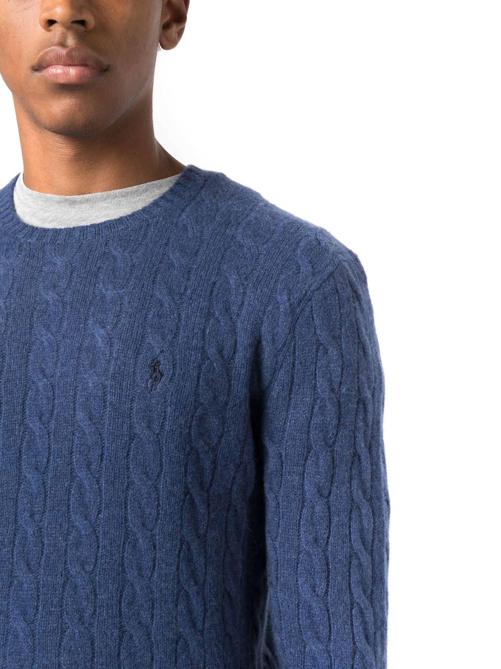 Navy blue wool blend sweater, cable knit, signature Polo Pony motif, crew neck, long sleeves, ribbed trim, straight hem