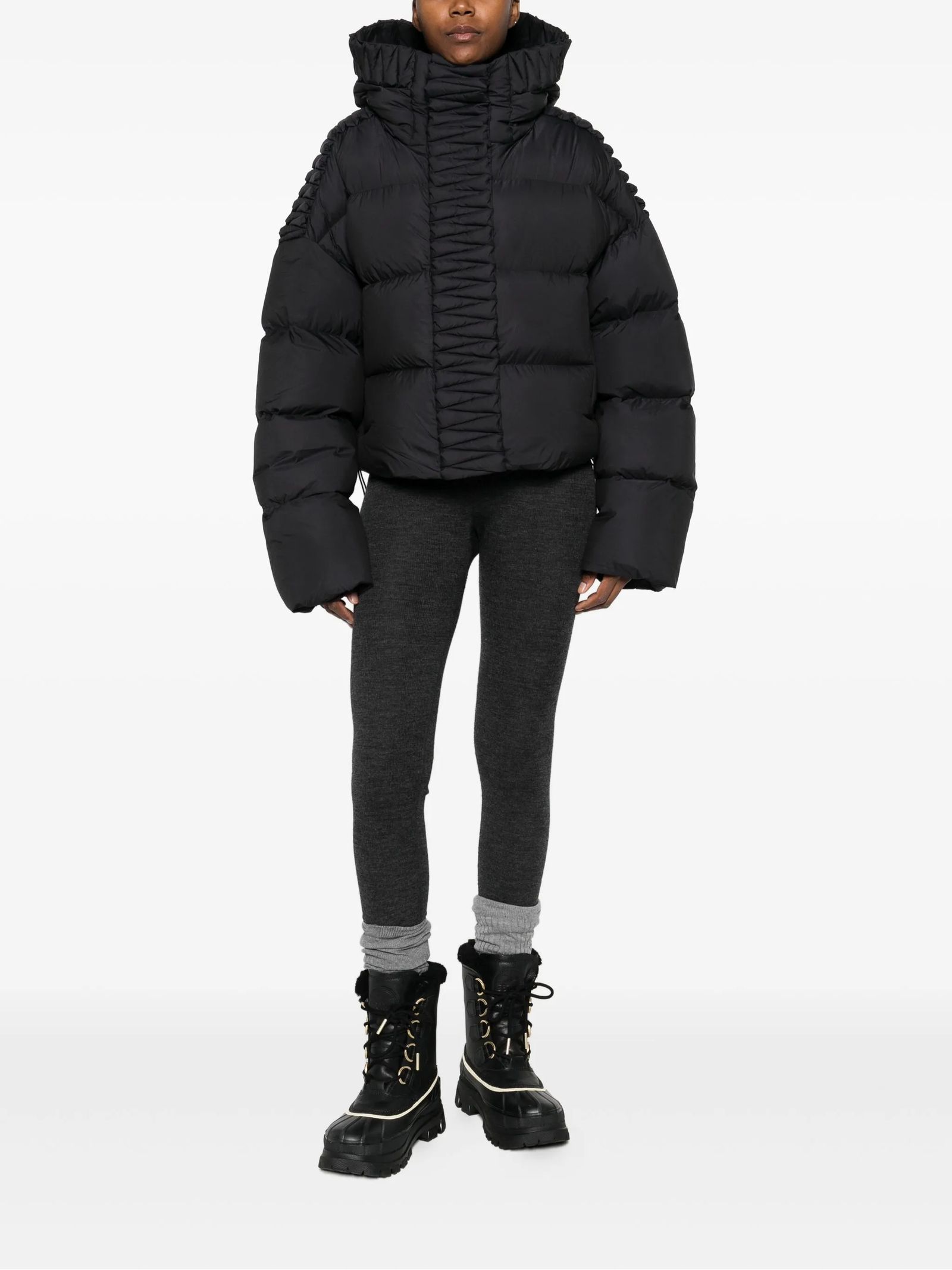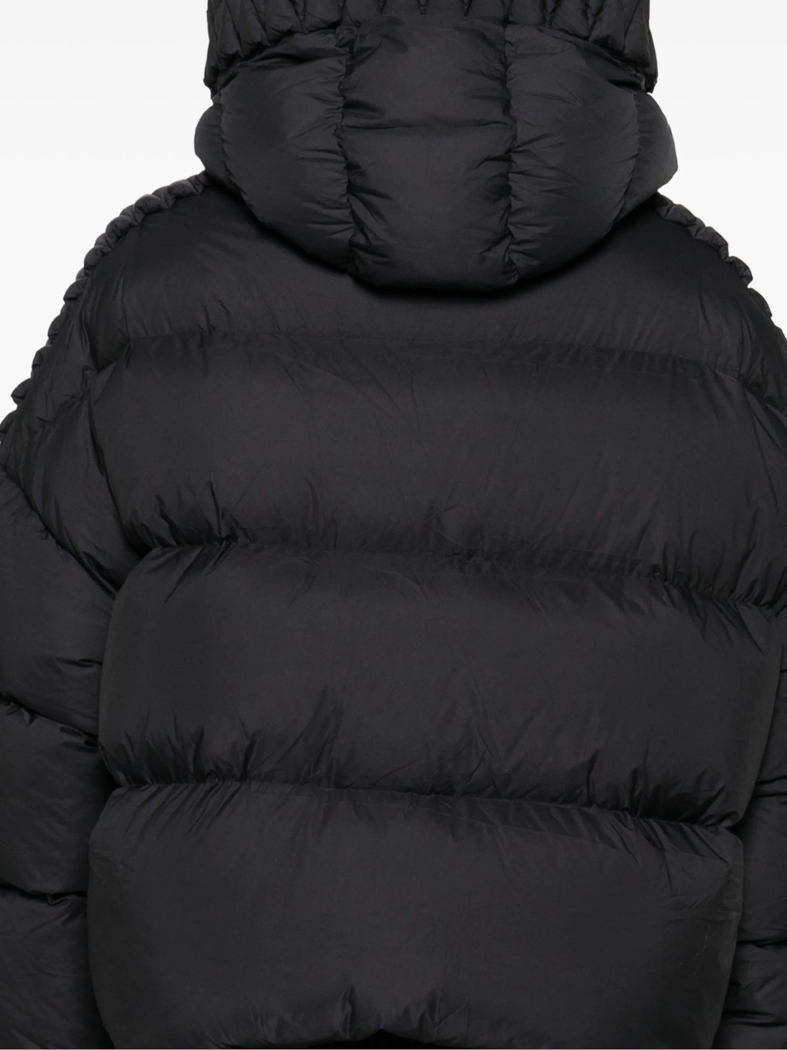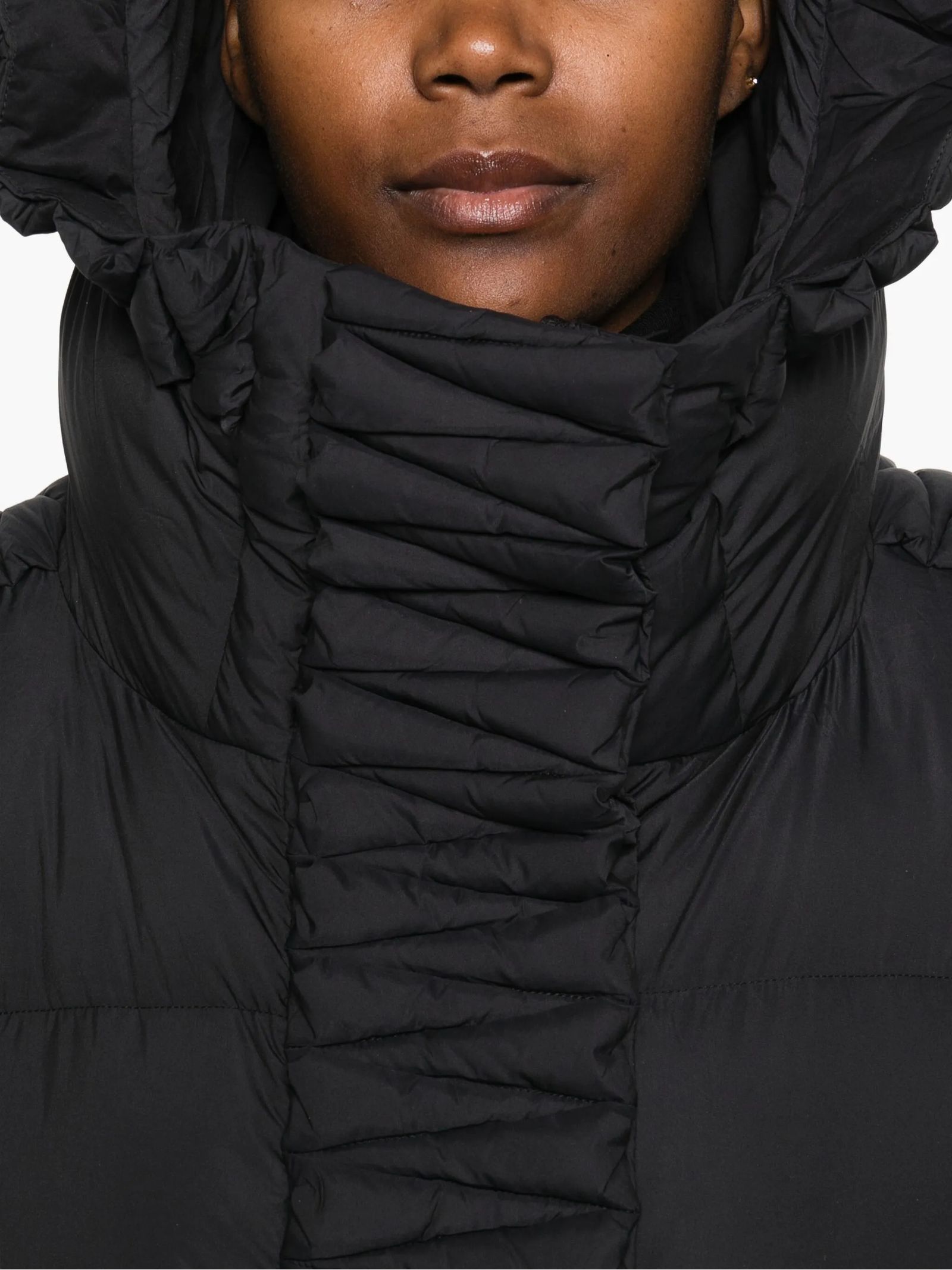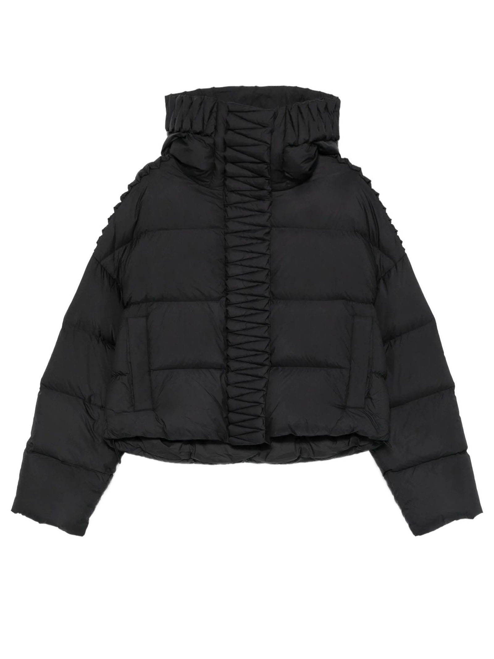 Black nylon down jacket, design trapuntato, classic hood, front concealed button closure, long sleeves with dropped shoulders