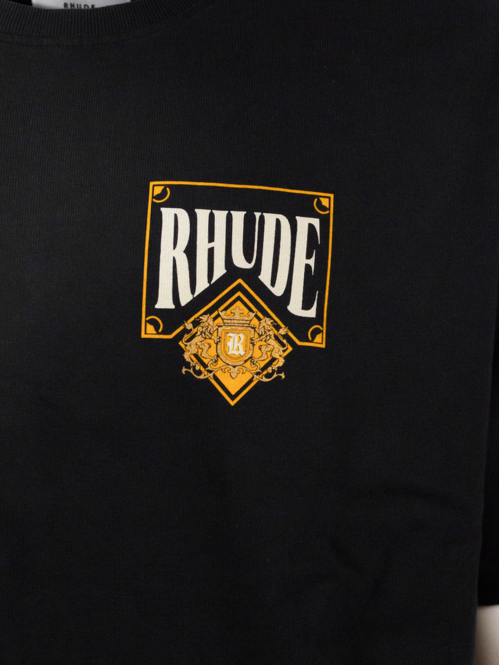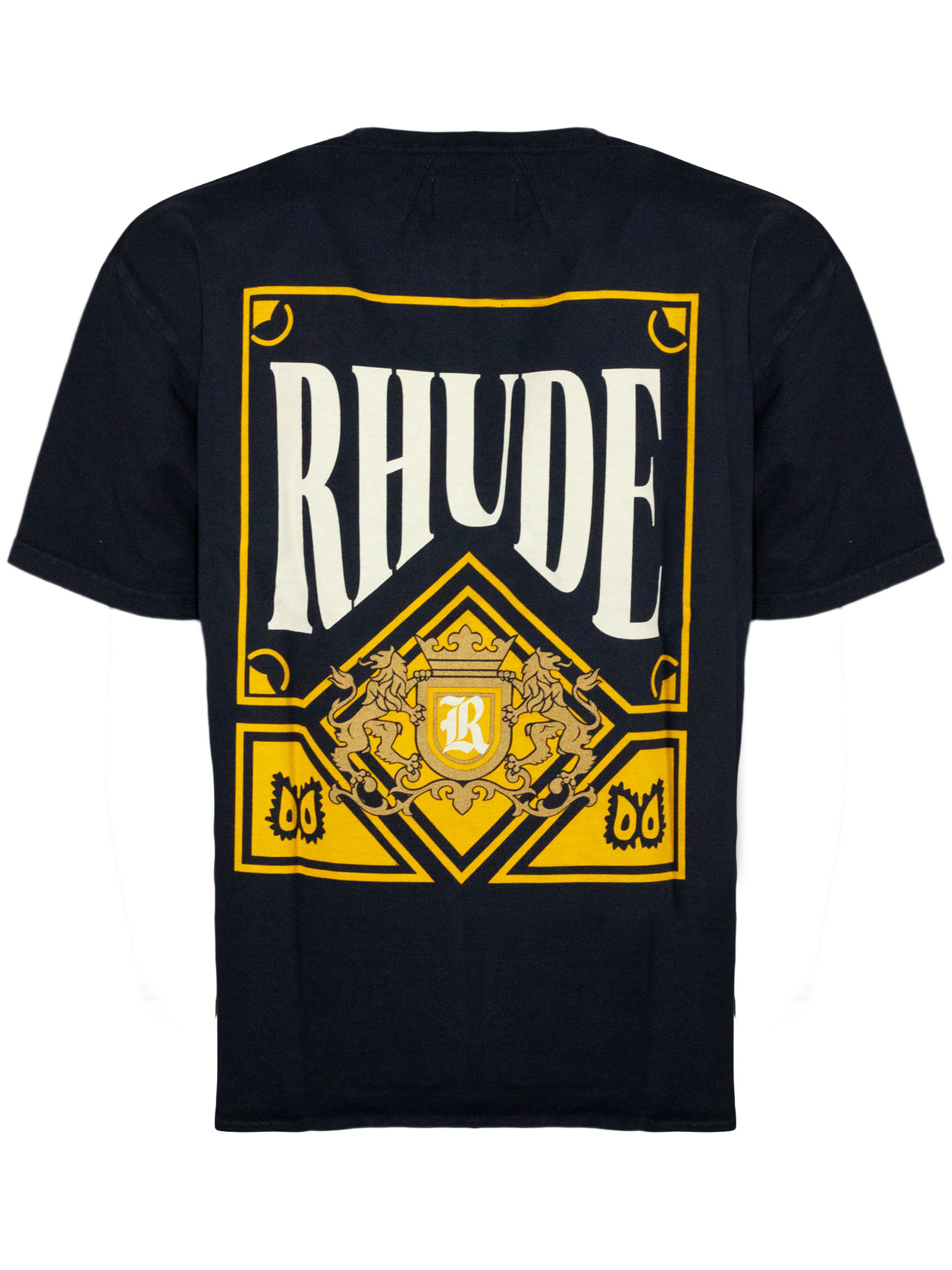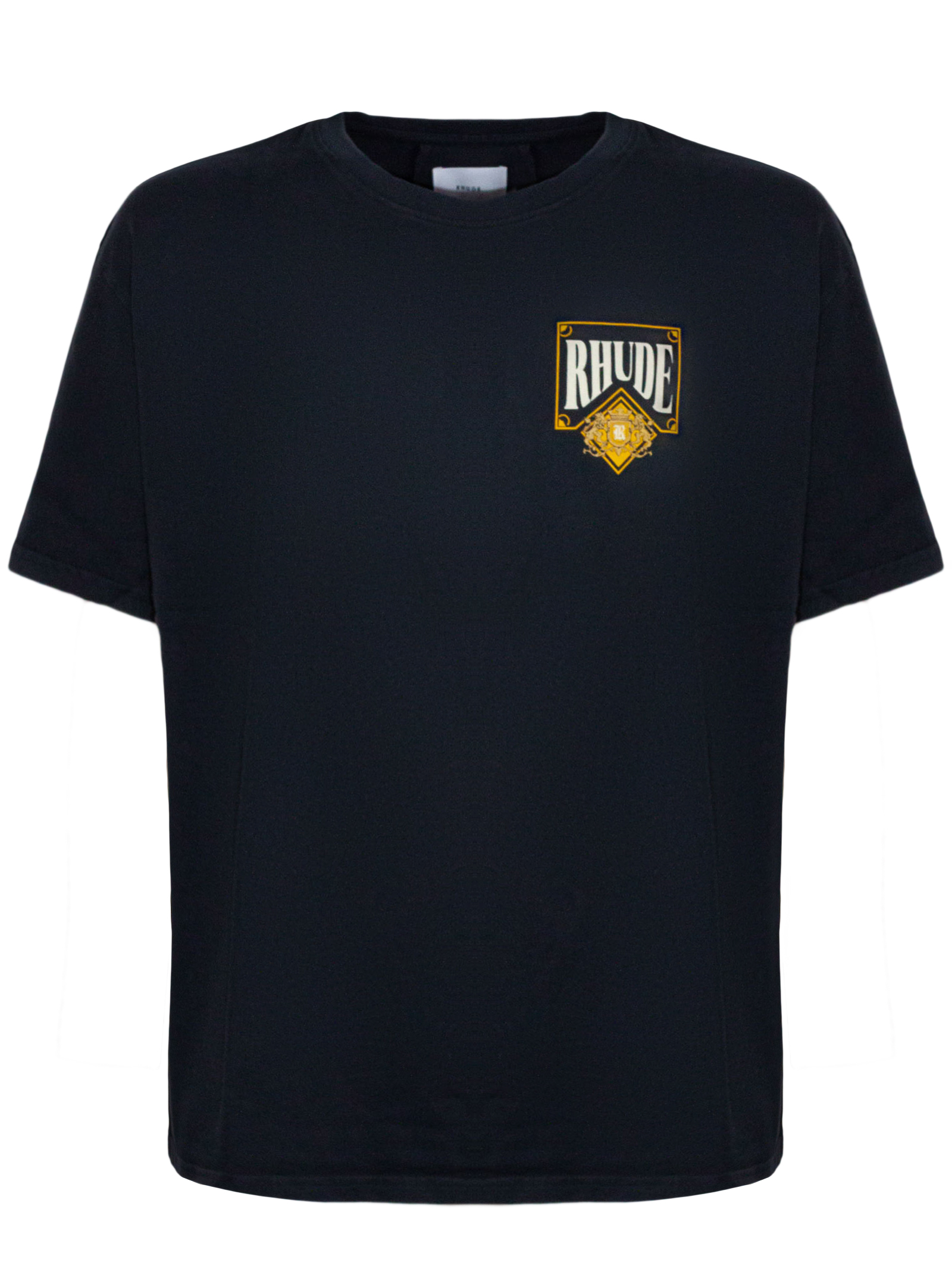 Black cotton T-shirt with front print, short sleeves, and a crew neck