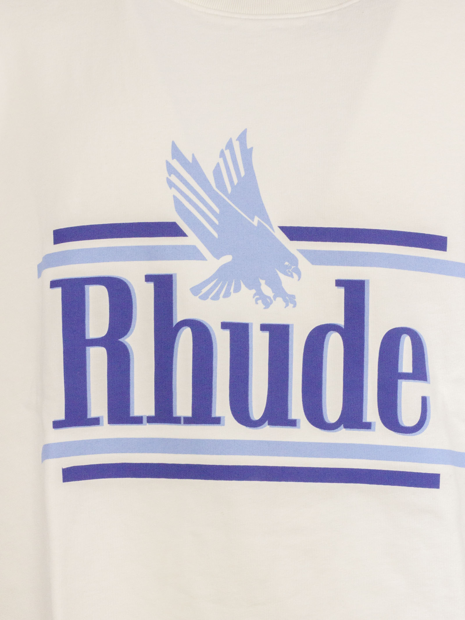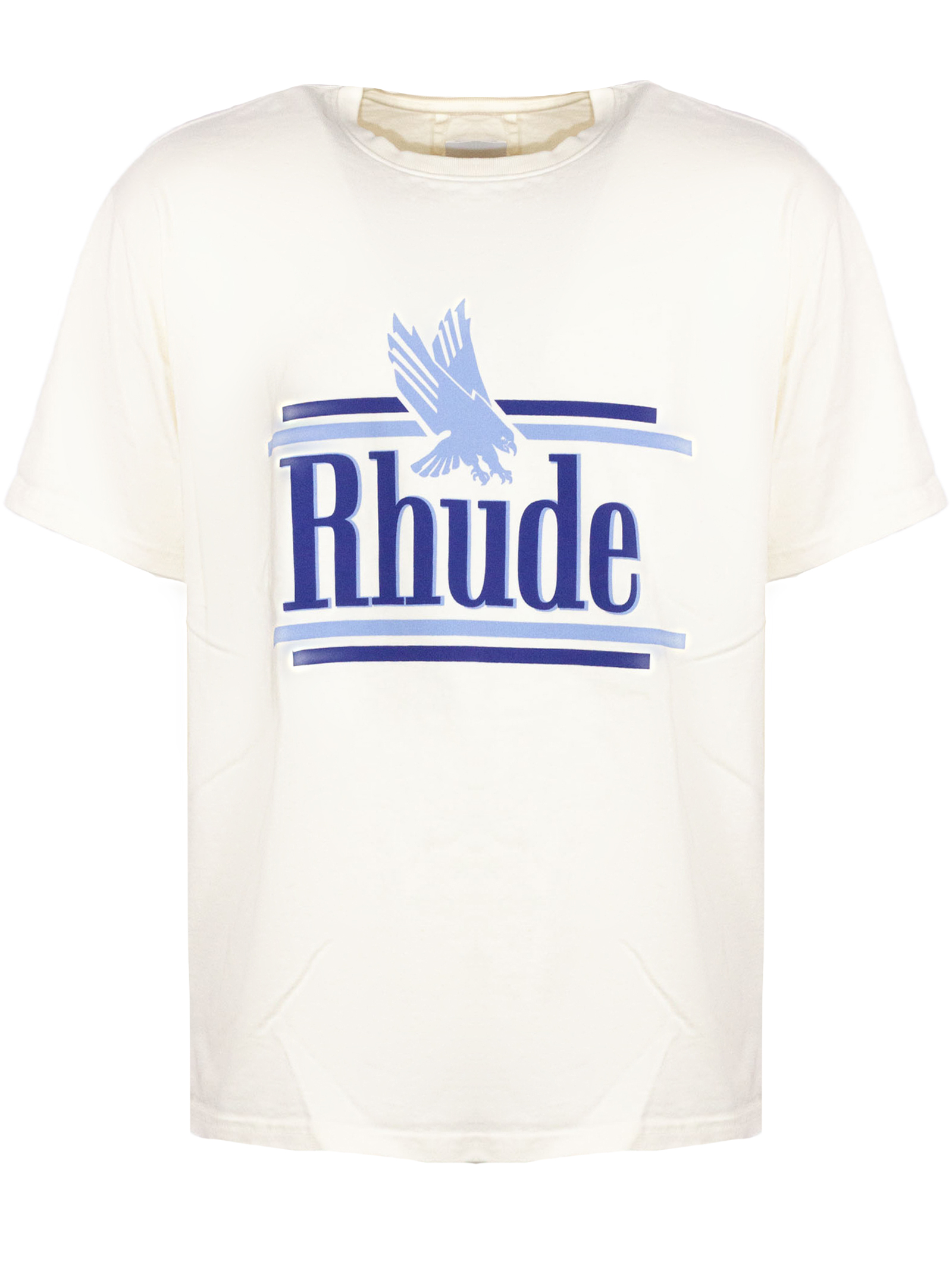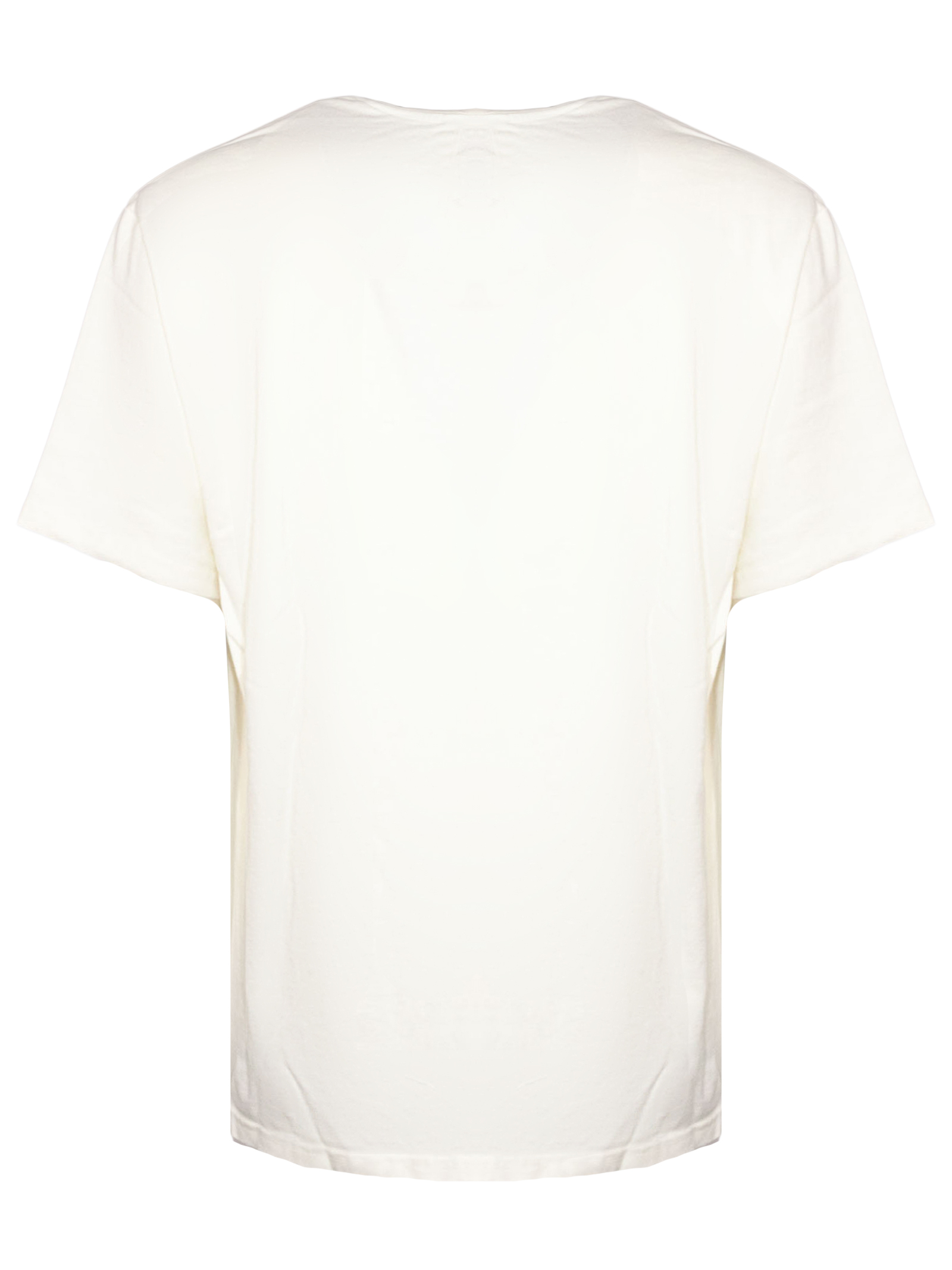 White cotton T-shirt with front print, short sleeves, and a crew neck