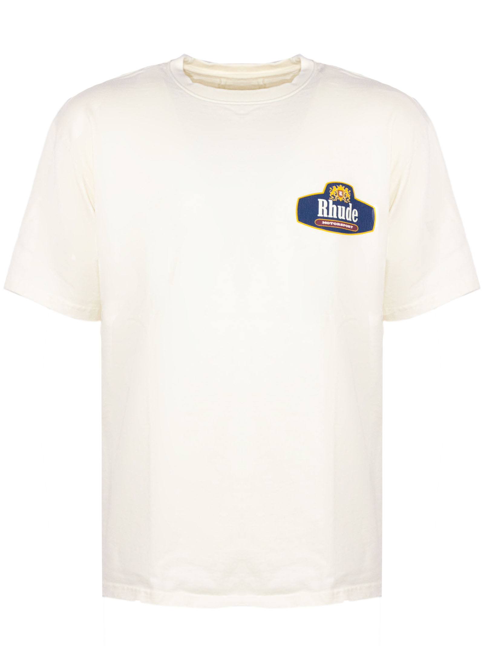 White cotton T-shirt with front print, short sleeves, and a crew neck