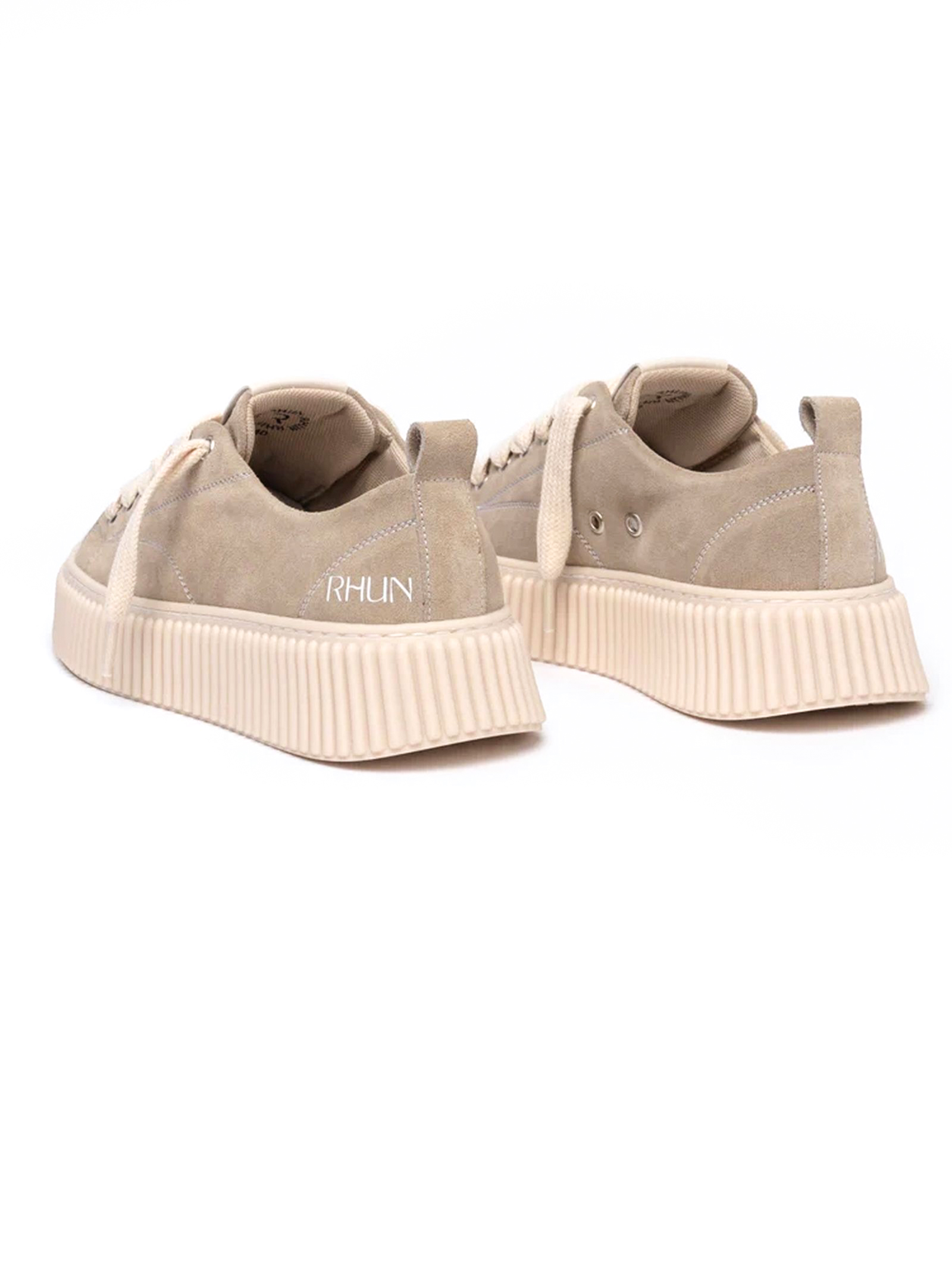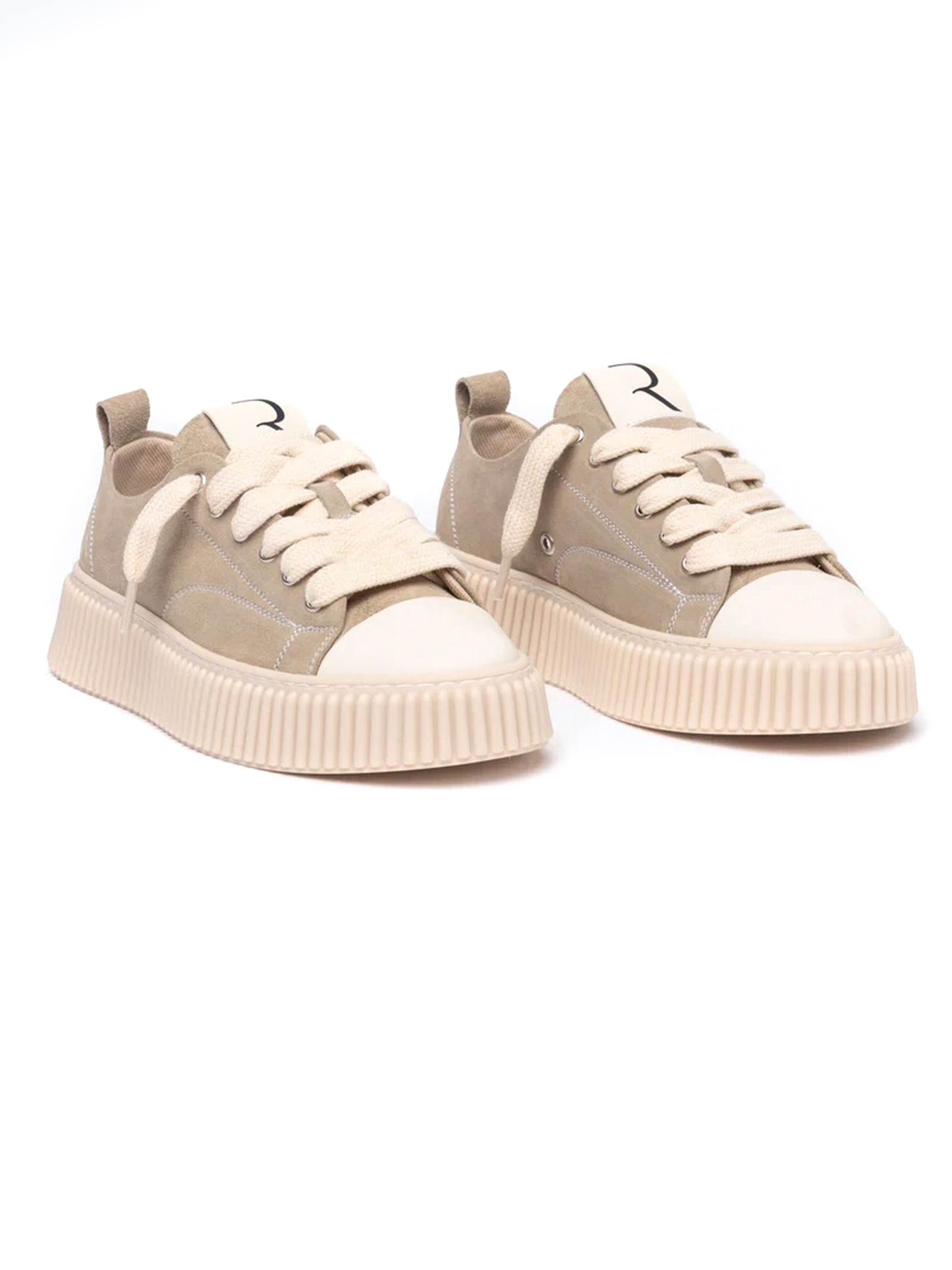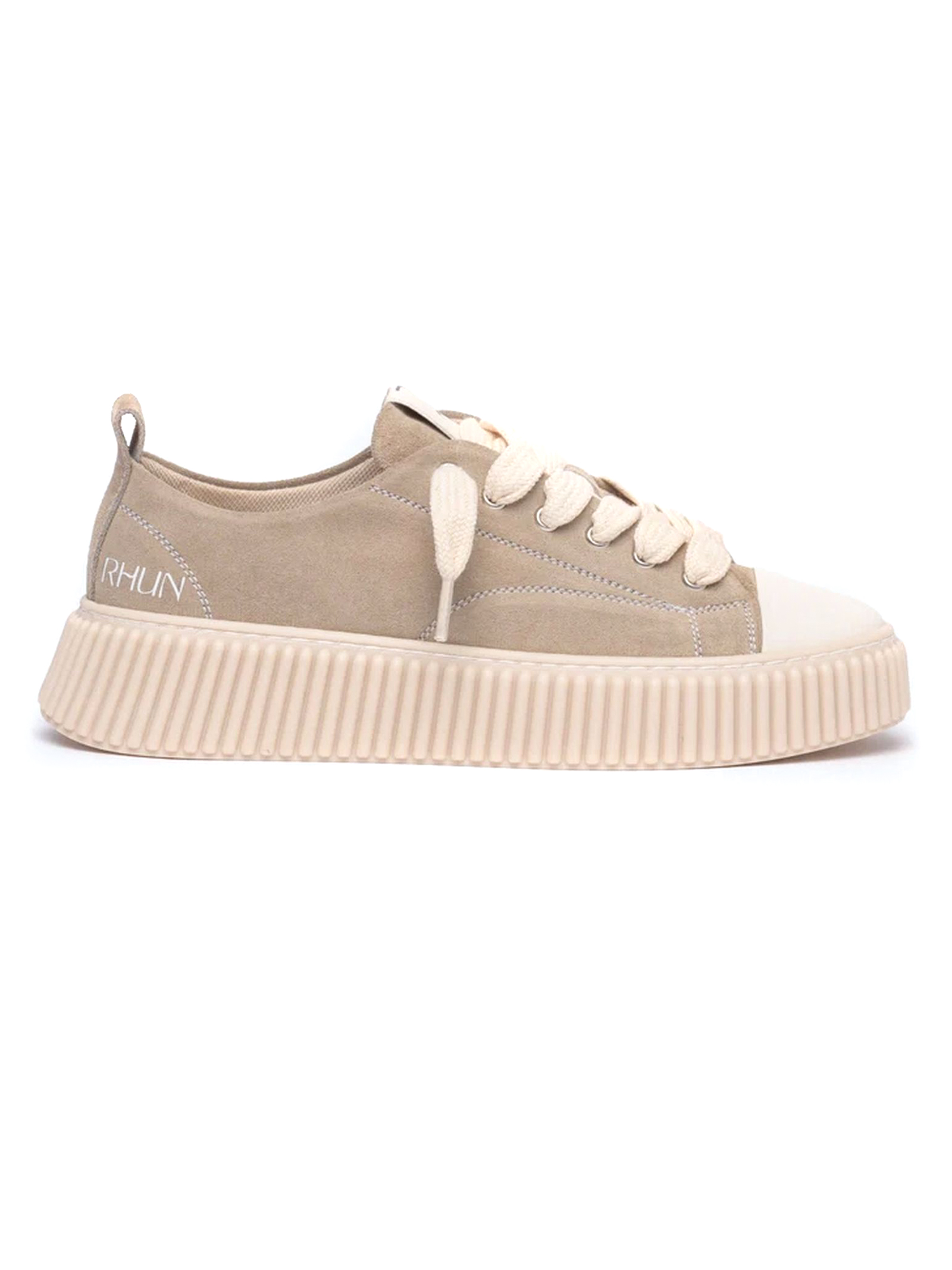 Low-top sneakers in beige suede with white stitching. Upper with six eyelets and thick laces. Featuring embossed logo on the tongue and heel. Chunky beige rubber sole with embossed stripe design
