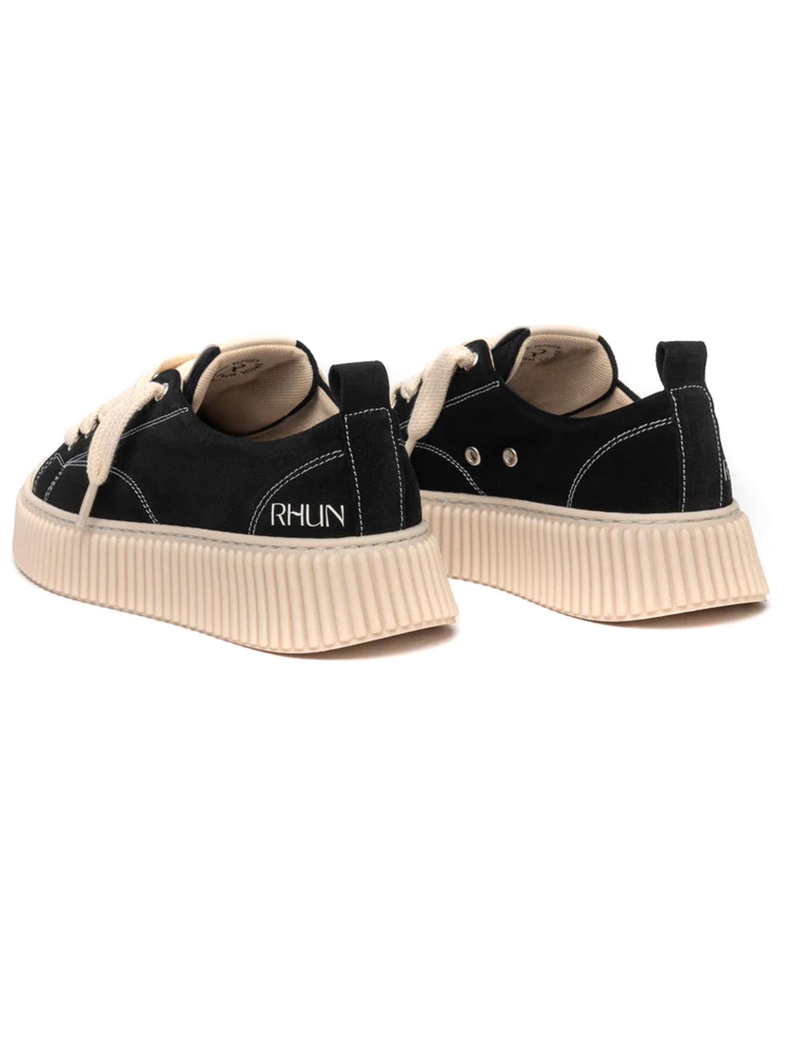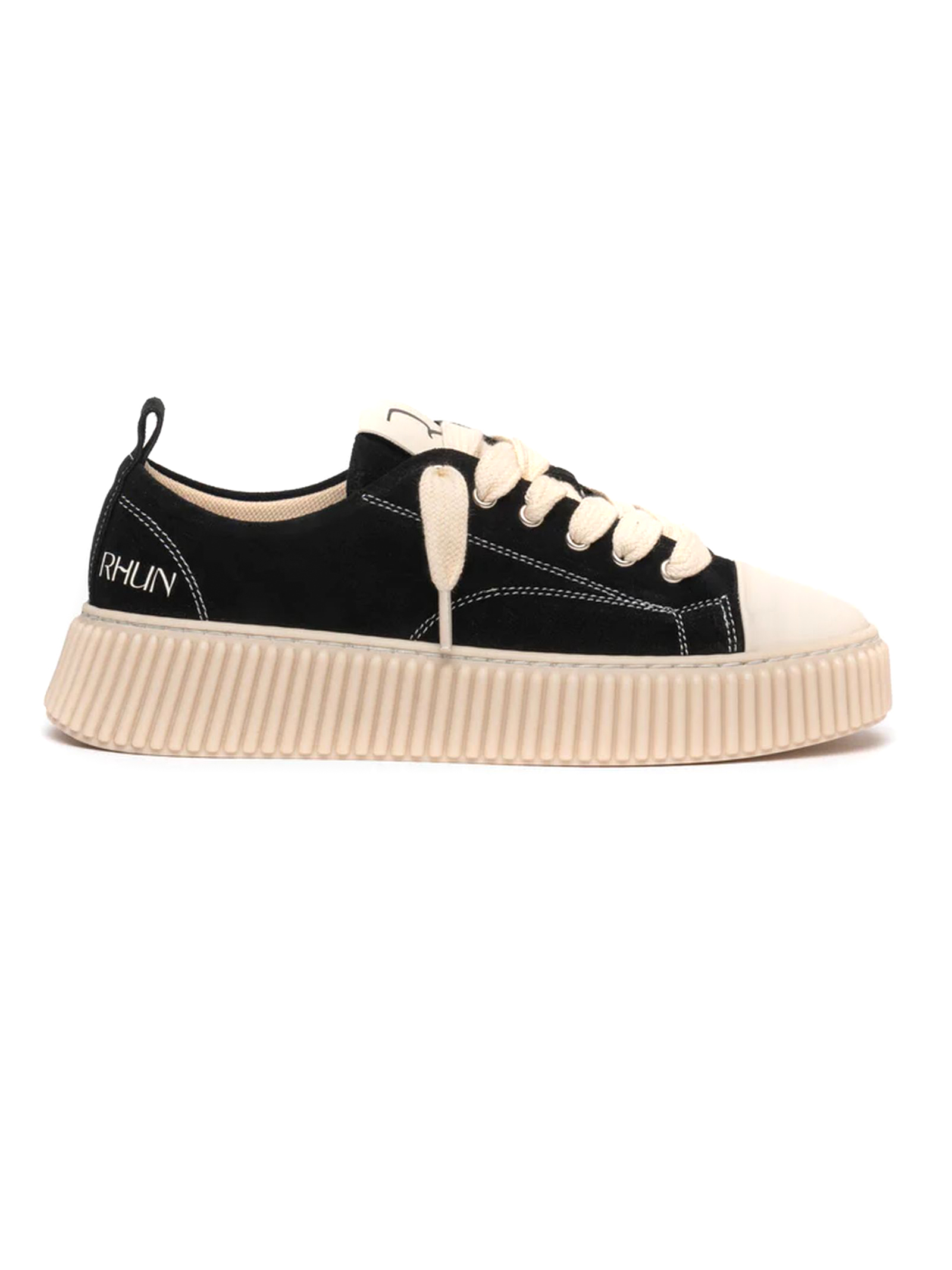 Low-top sneakers in black suede with white stitching. Upper with six eyelets and thick laces. Featuring embossed logo on the tongue and heel. Chunky beige rubber sole with embossed stripe design