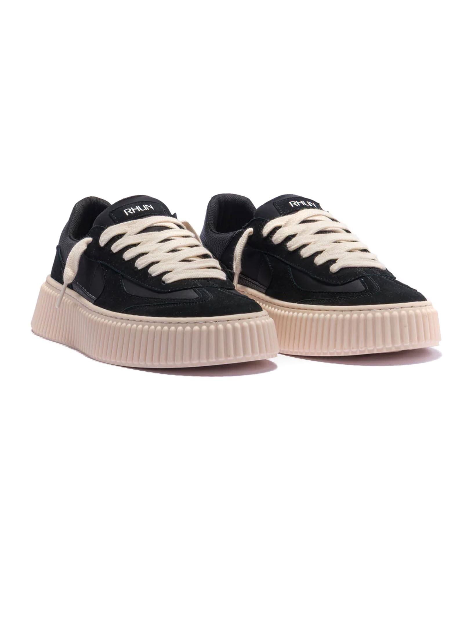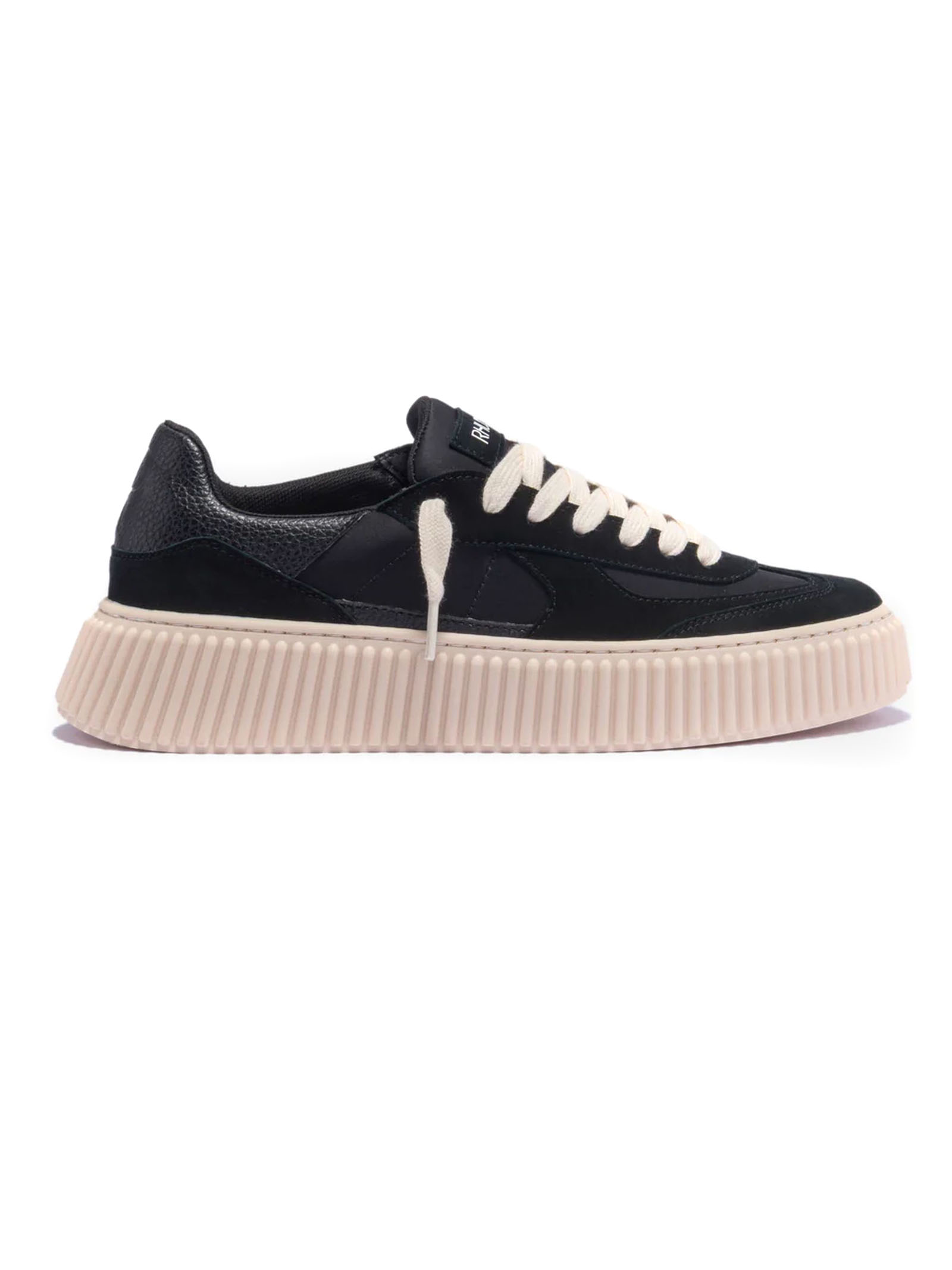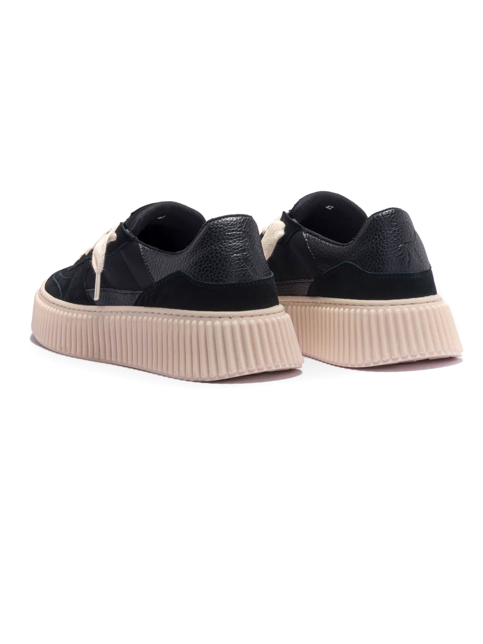 Sneakers 1989 Treble Black Leather, Suede and Nylon Inserts, and Black Stitching. Six Eyelets and Thin Laces. Embossed Logo on the Tongue and Heel. Chunky Beige Rubber Sole and Embossed Stripe Design.