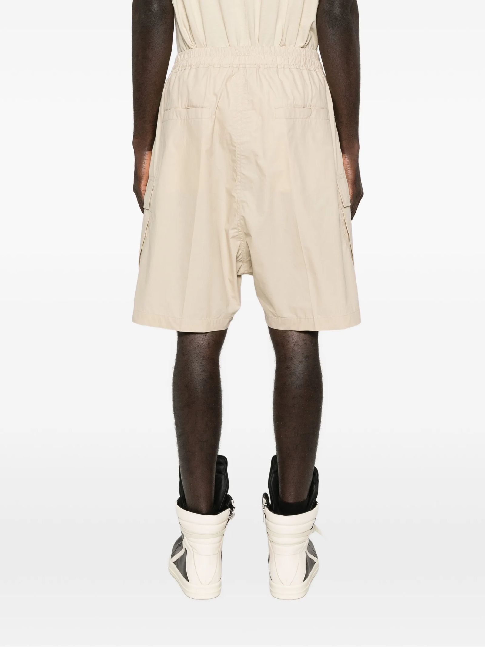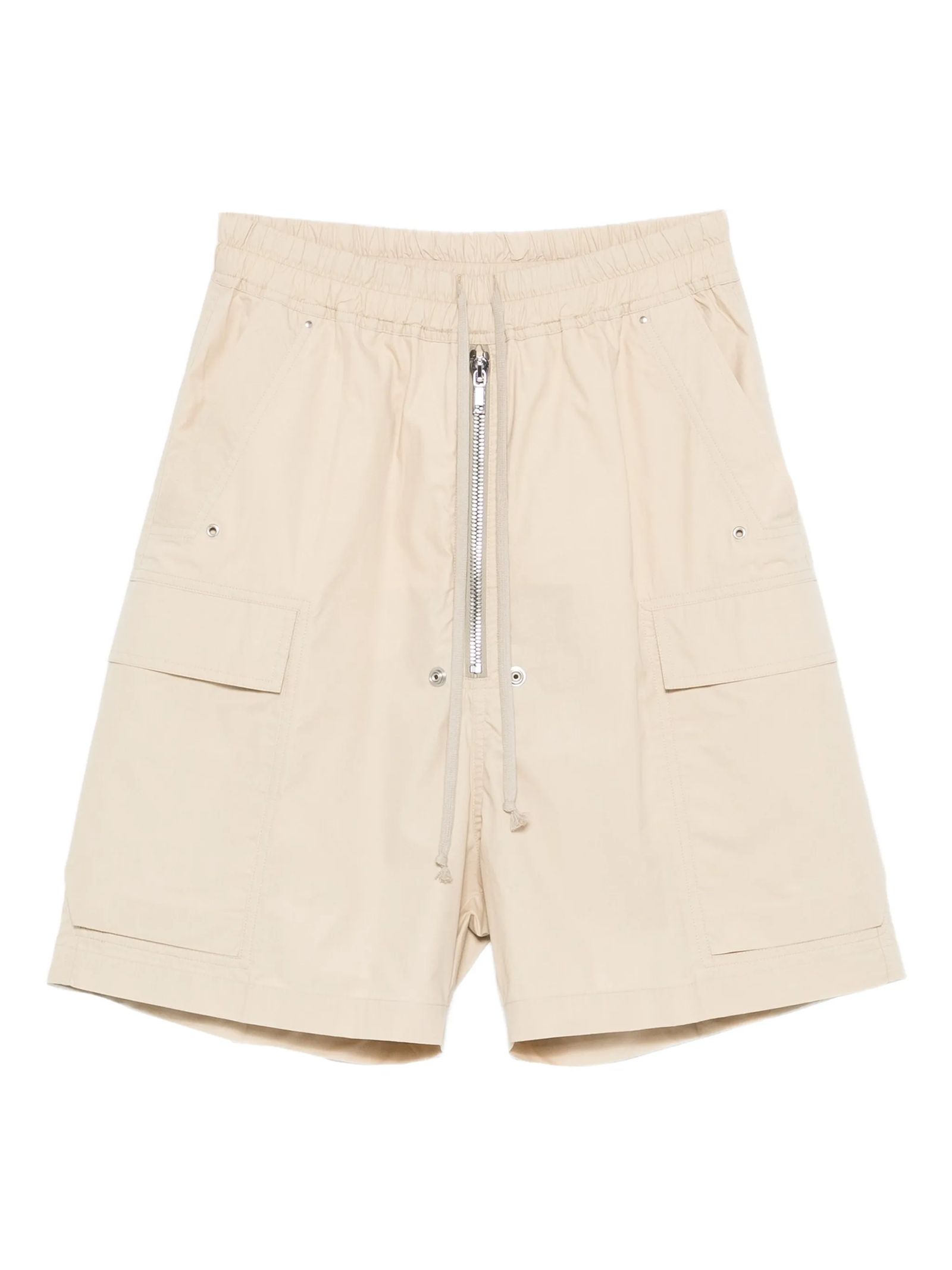 Beige cotton drawstring zip-up shorts, front zip fastening, drawstring fastening, side flap pockets, rear welt pockets