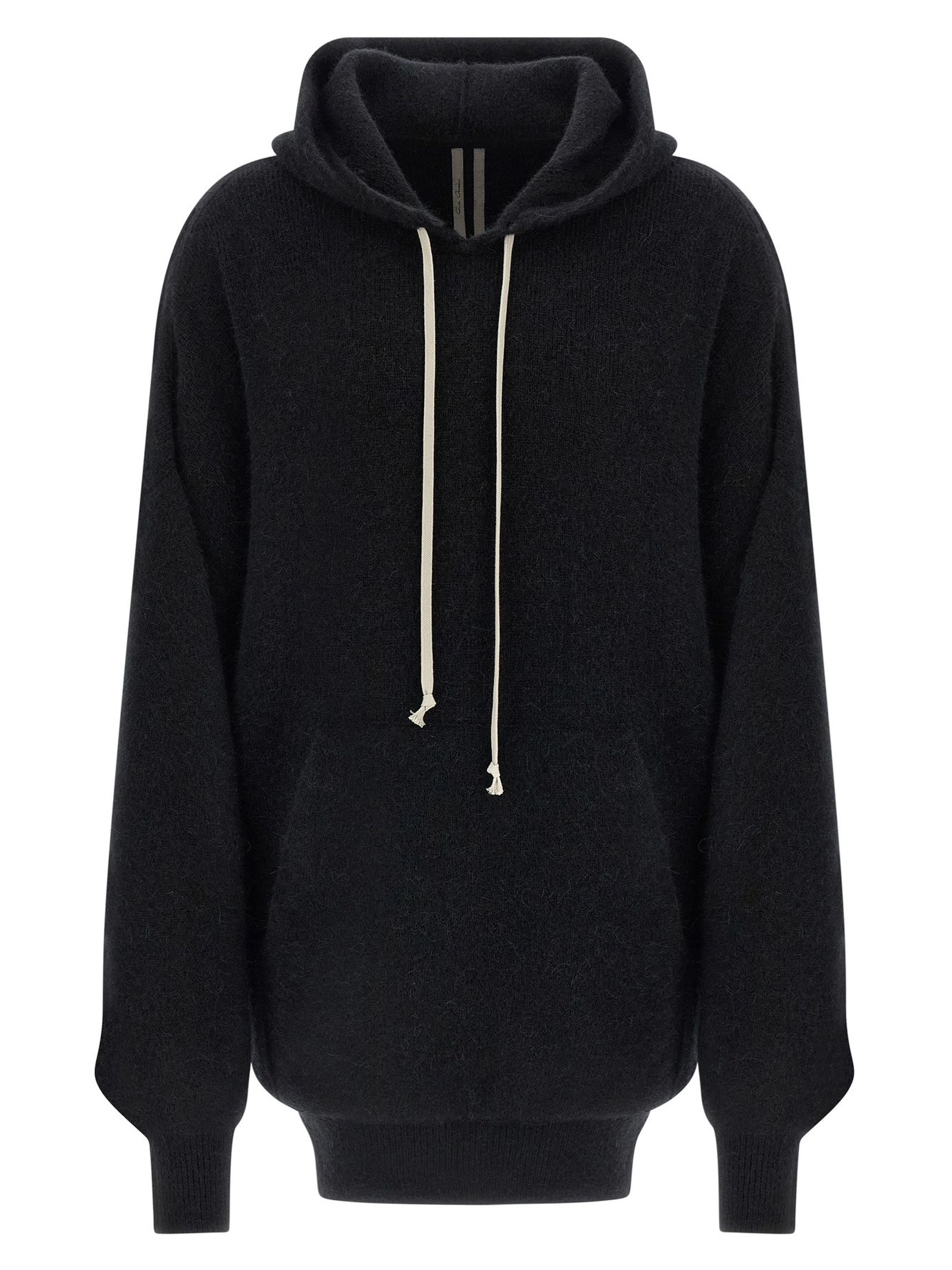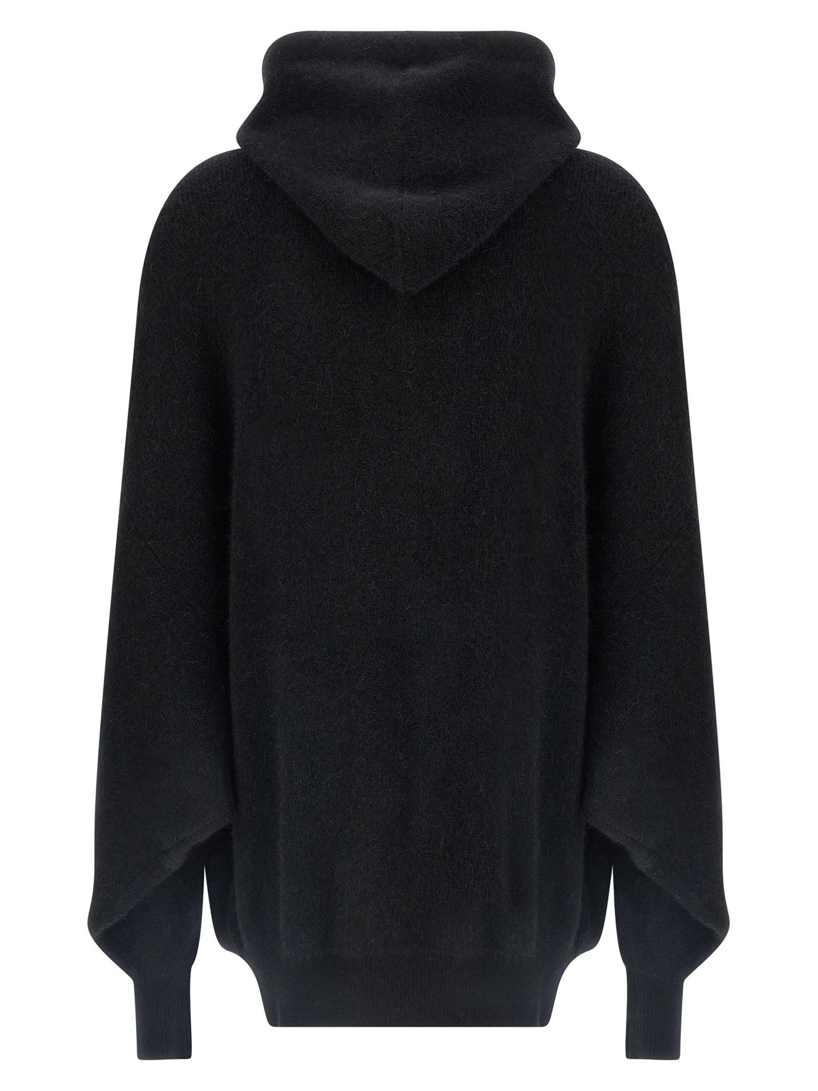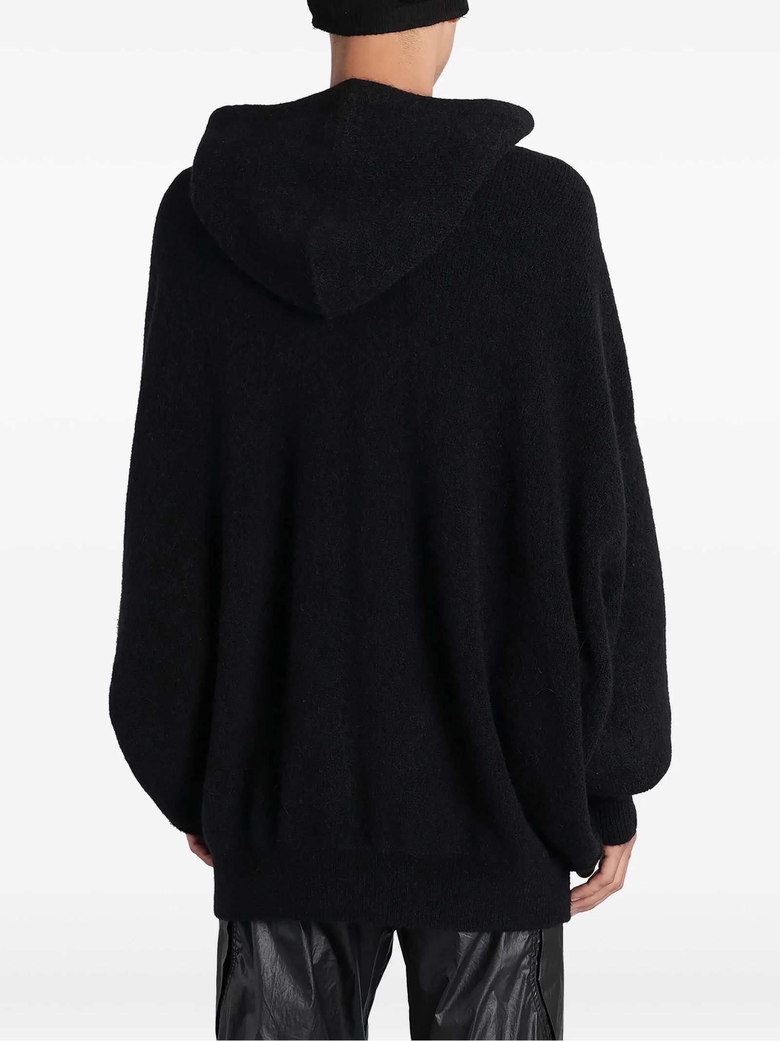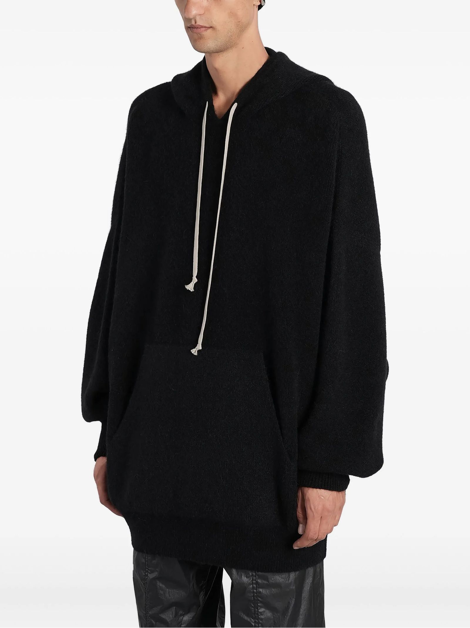 Black alpaca wool blend hoodie, drawstring hood, kangaroo pocket, dropped shoulder, long sleeves