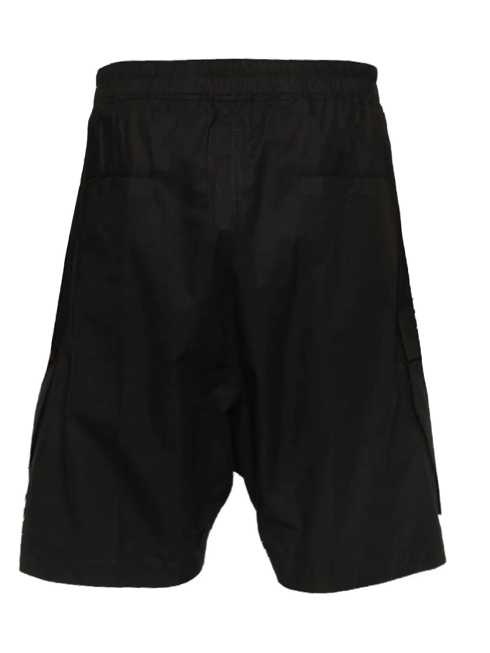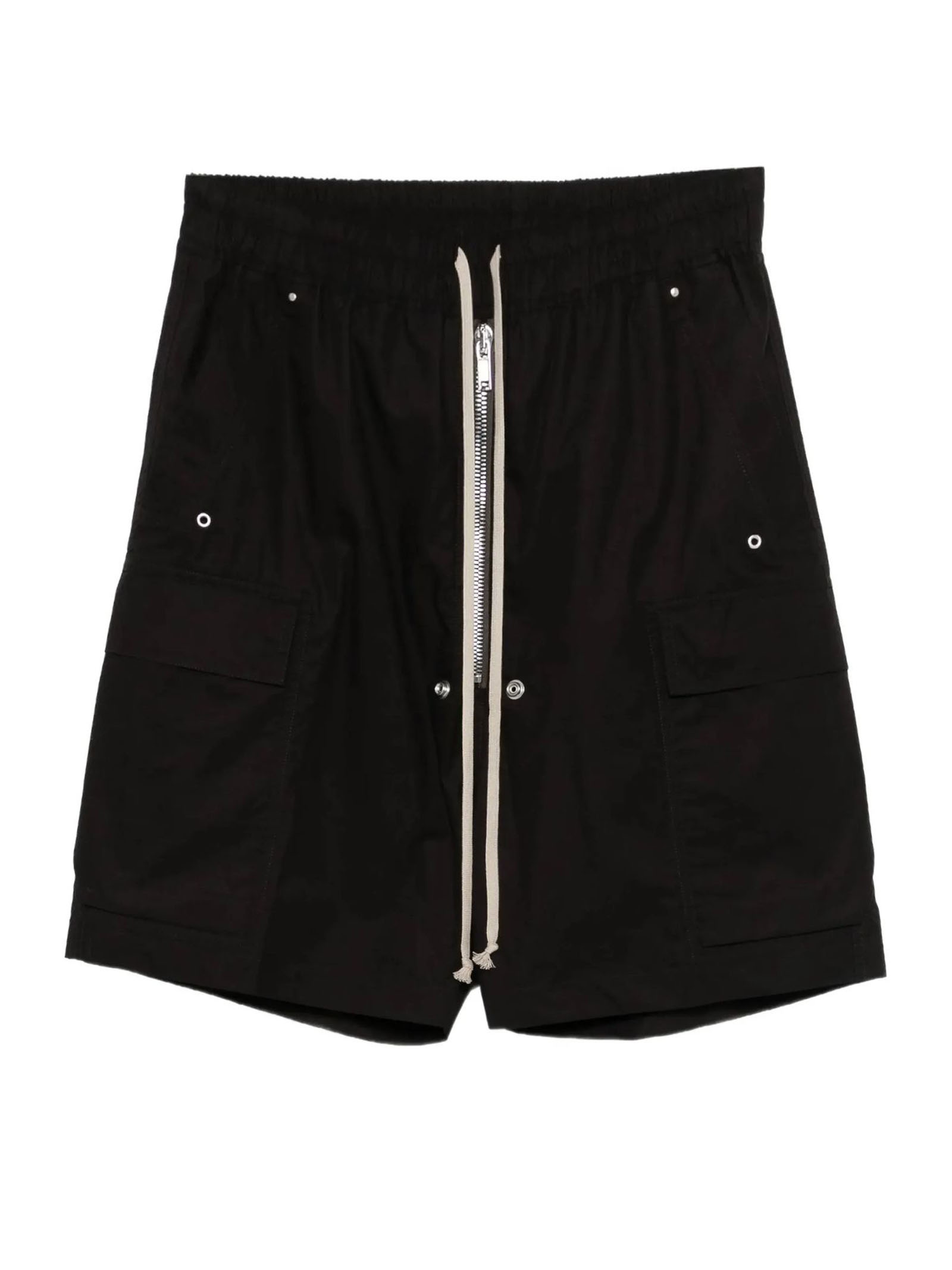 Black cotton drawstring zip-up shorts, front zip fastening, drawstring fastening, side flap pockets, rear welt pockets