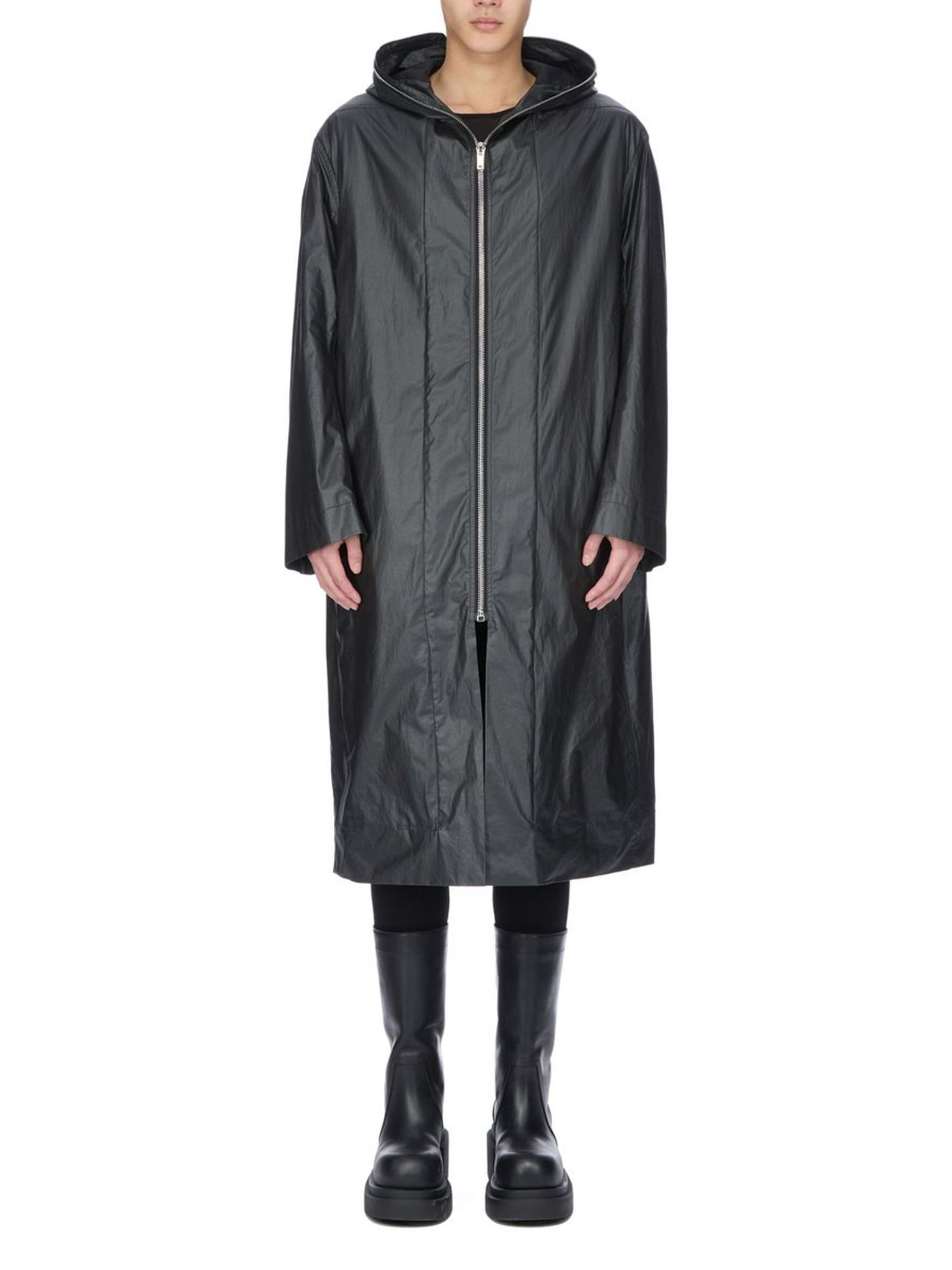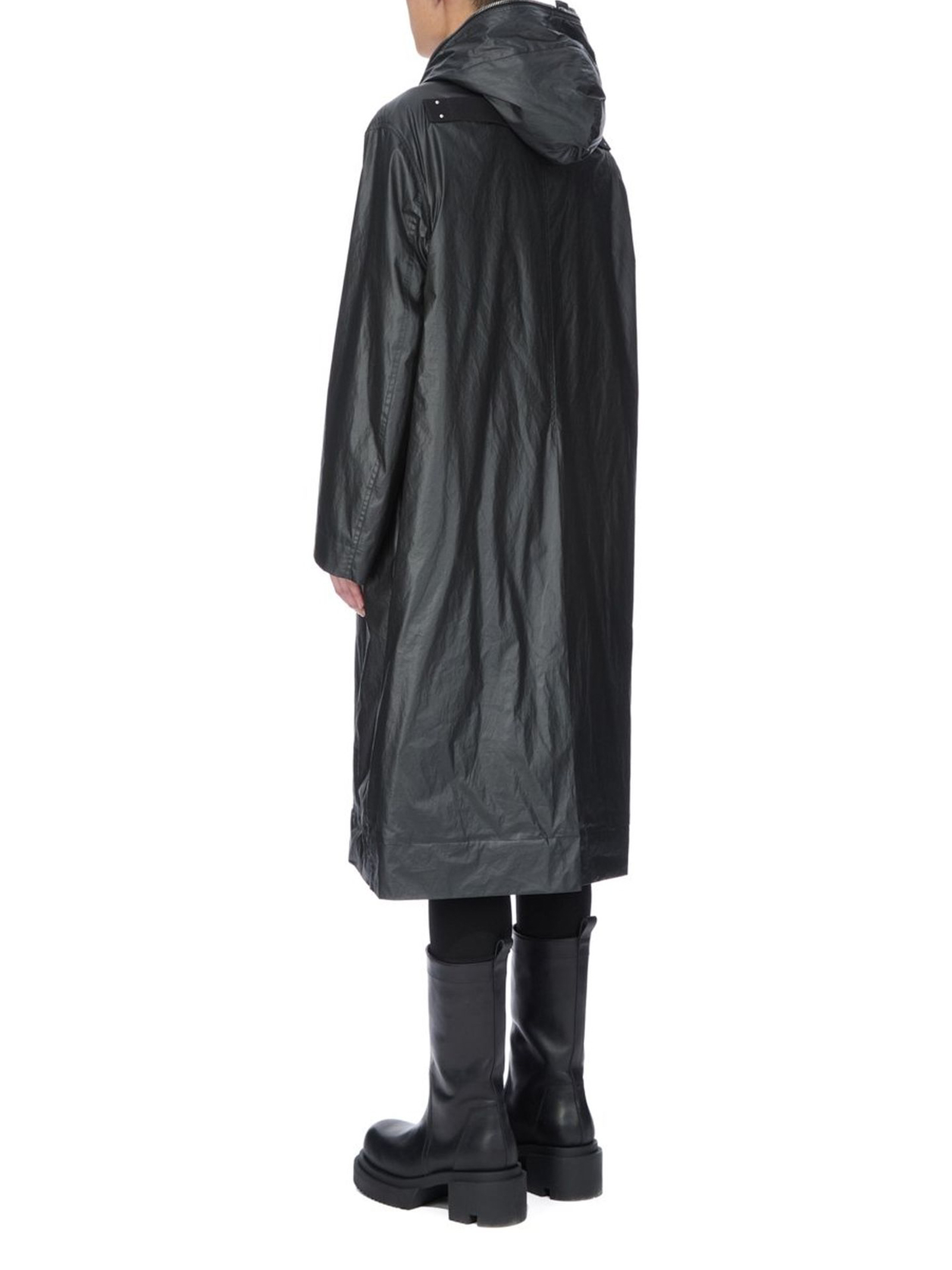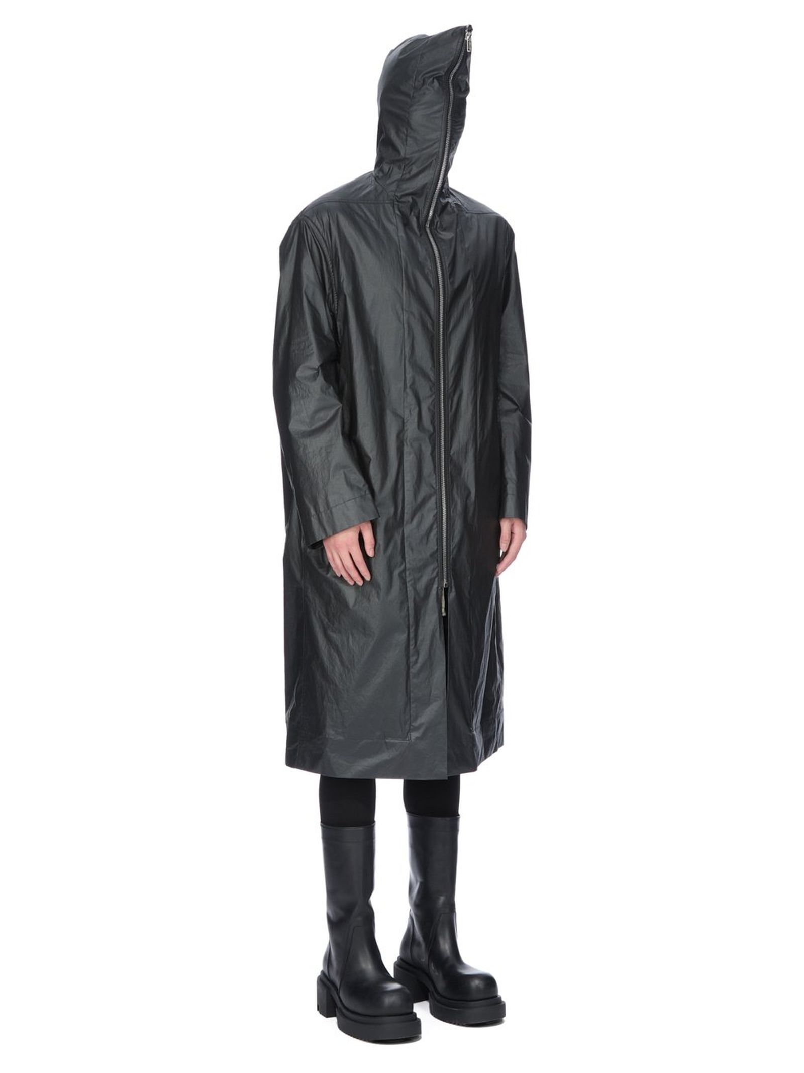 Black Gimp Mac Is Below Knee Length With Long Loose Sleeves. It Has A Large Hood, Level Shoulder Seams And Concealed Side Seam Pockets. It Features A Front Zipper Closure That Runs From Below Hip Length, Up All The Way Up Through The Hood, Allowing It To Be Zipped Completely Closed Over The Face. It Has A Cotton Webbing Strap With Rivet Detail On The Back Yoke. It Is Fully Lined And Has Two Internal Zippered Pockets