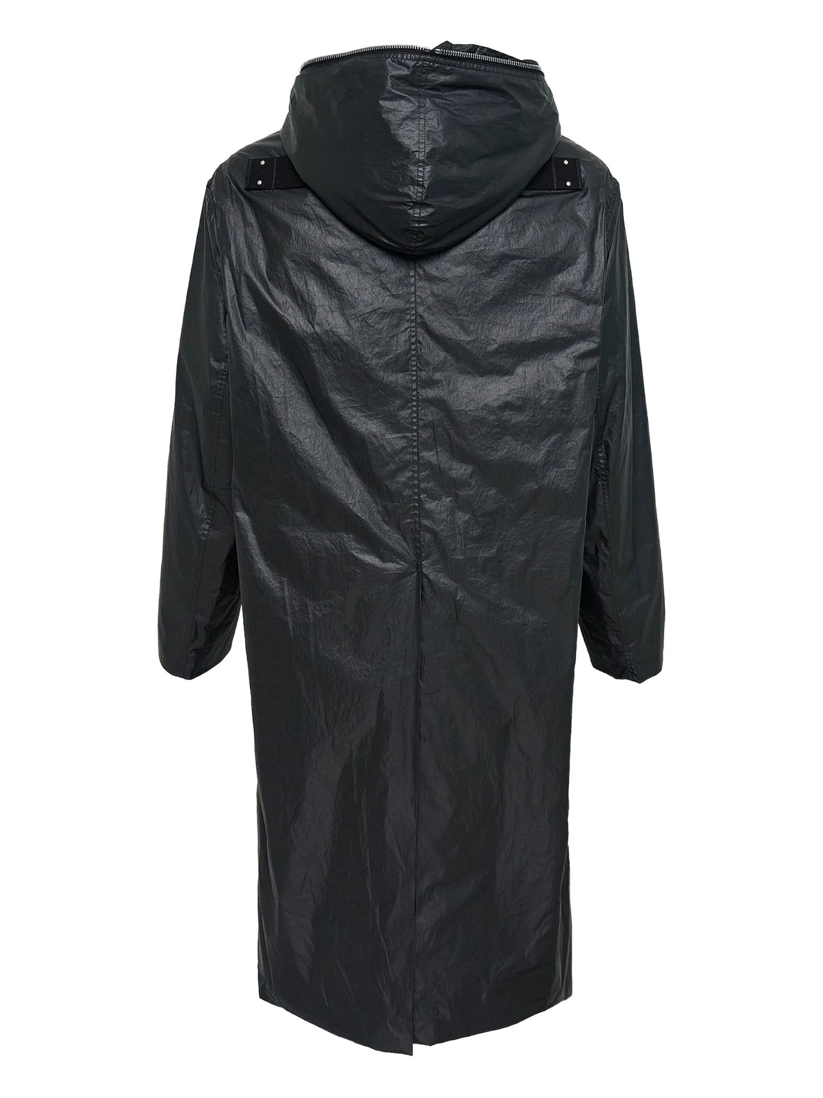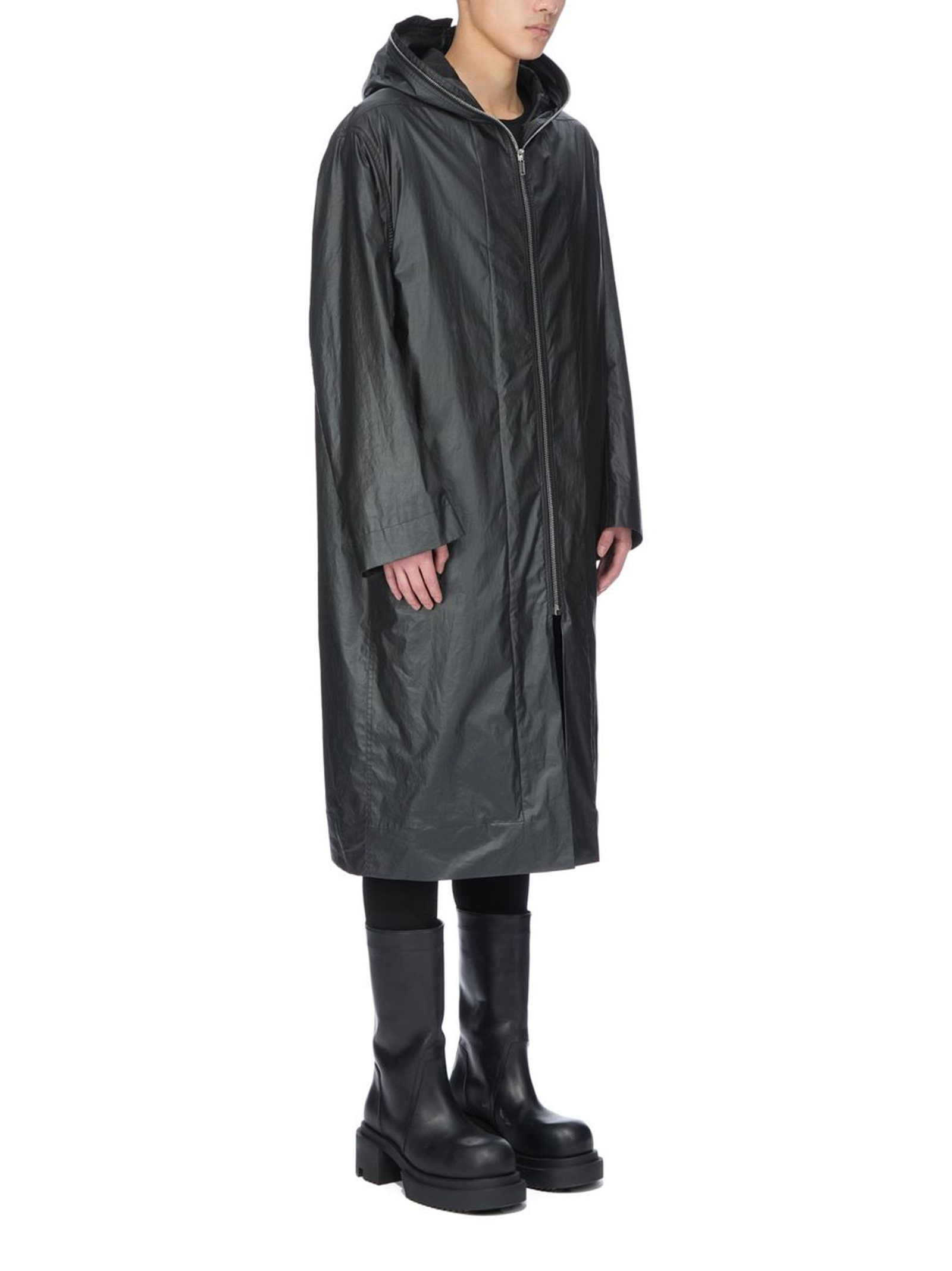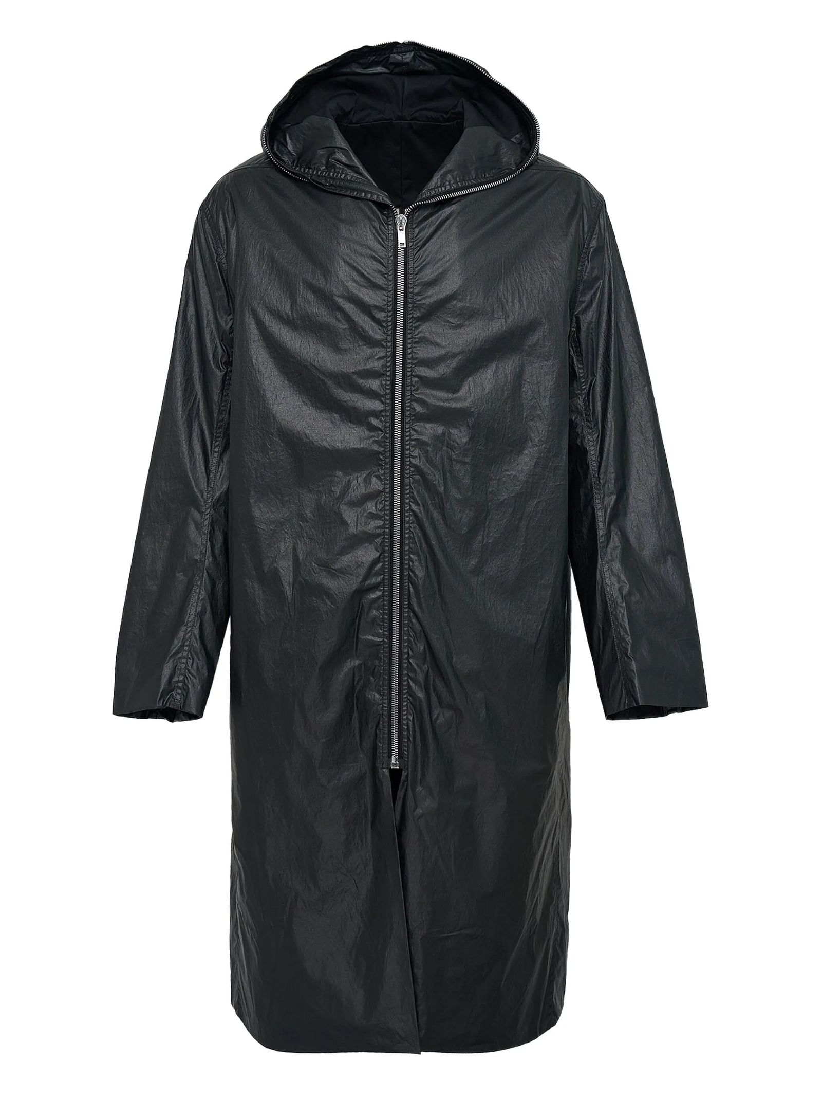 Black Gimp Mac Is Below Knee Length With Long Loose Sleeves. It Has A Large Hood, Level Shoulder Seams And Concealed Side Seam Pockets. It Features A Front Zipper Closure That Runs From Below Hip Length, Up All The Way Up Through The Hood, Allowing It To Be Zipped Completely Closed Over The Face. It Has A Cotton Webbing Strap With Rivet Detail On The Back Yoke. It Is Fully Lined And Has Two Internal Zippered Pockets