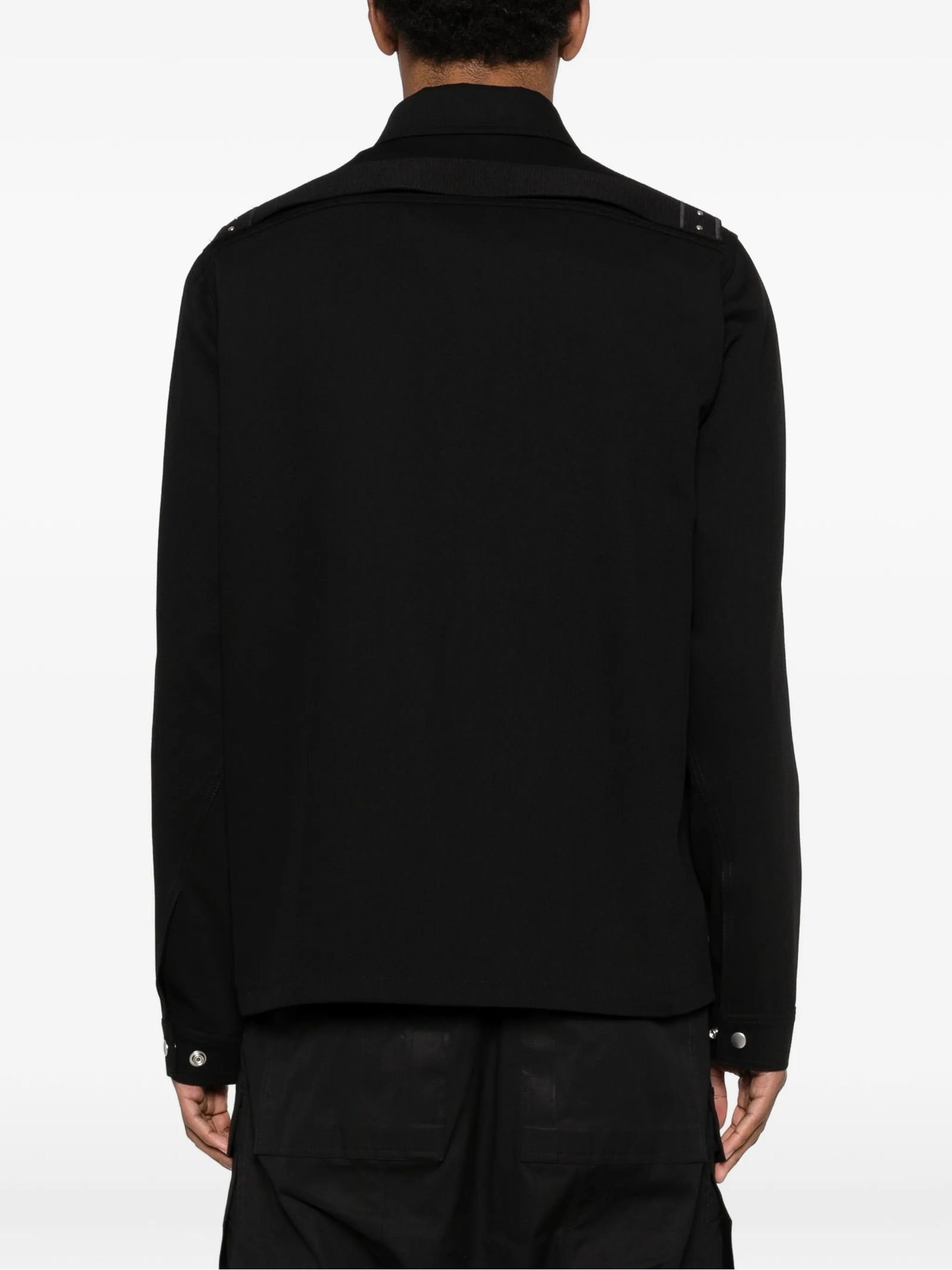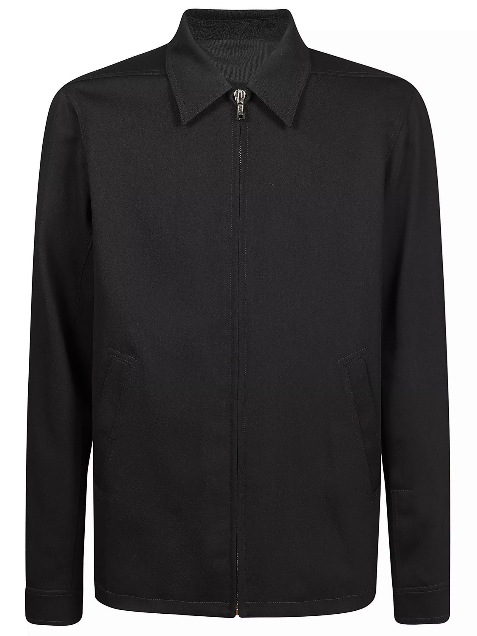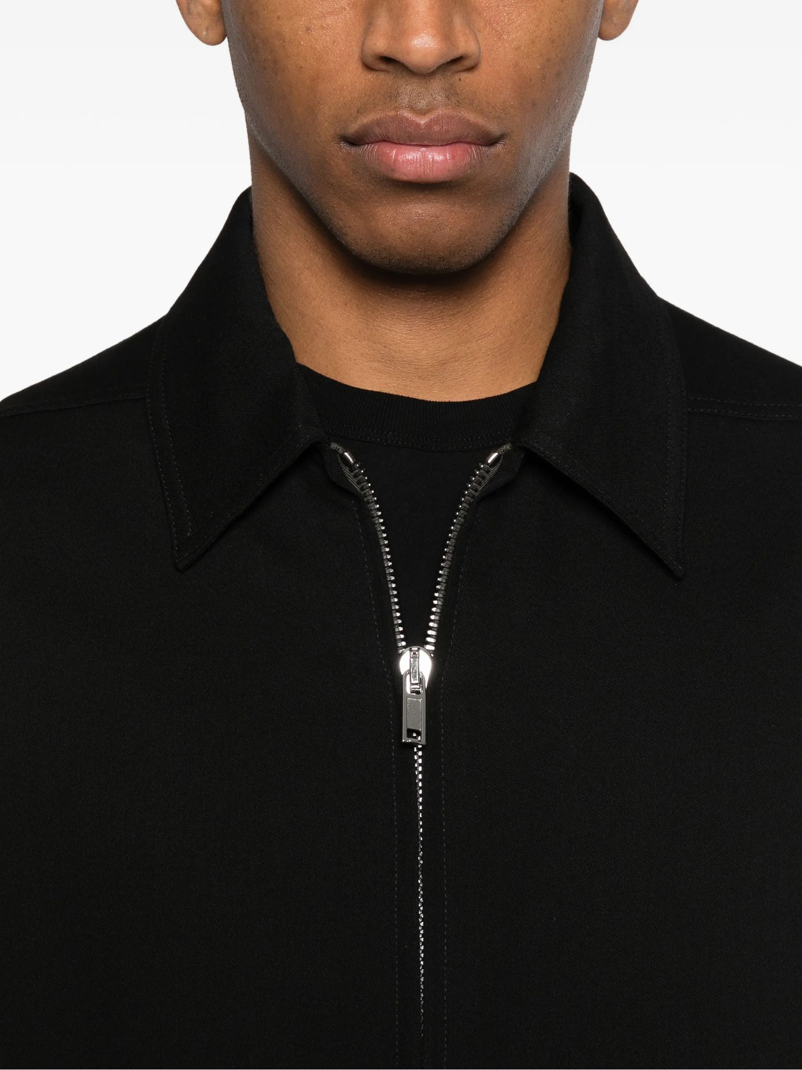 Black wool bomber jacket, pointed collar, zip closure, grosgrain detail on the back, long sleeves with snap closure cuffs