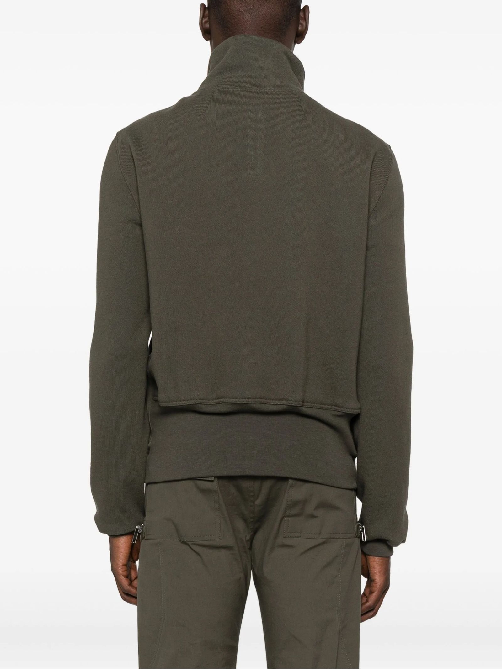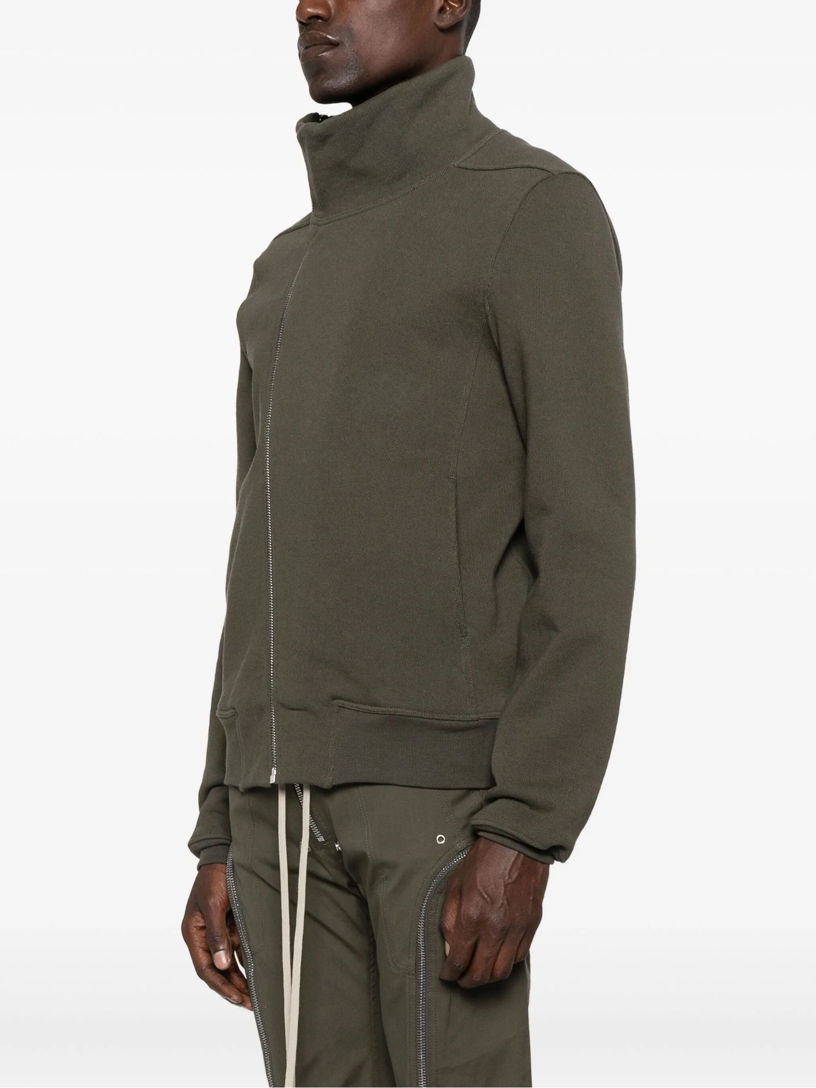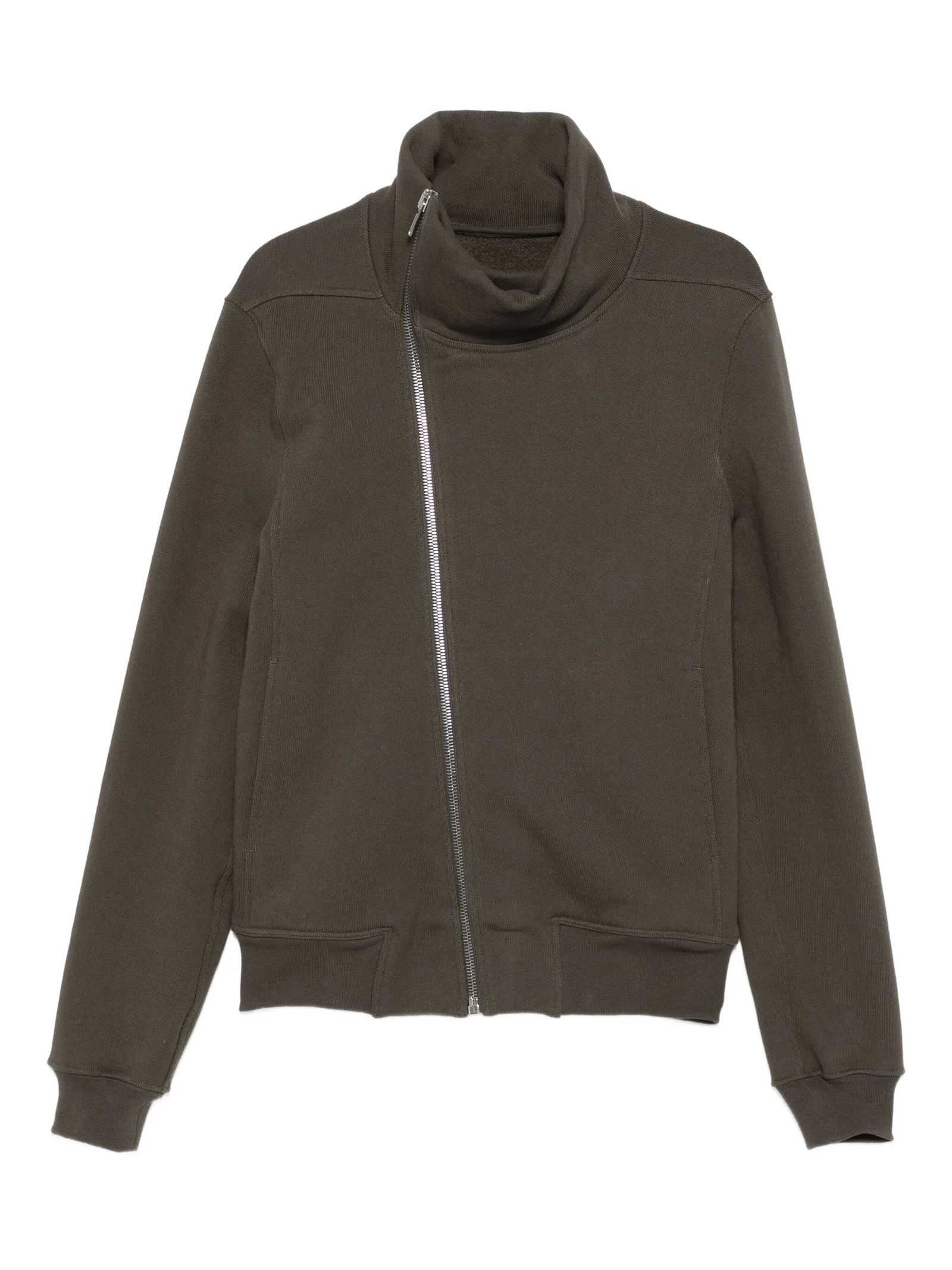 Dark brown cotton jacket, high neck, zip front, long sleeves, asymmetrical zip, ribbed hem