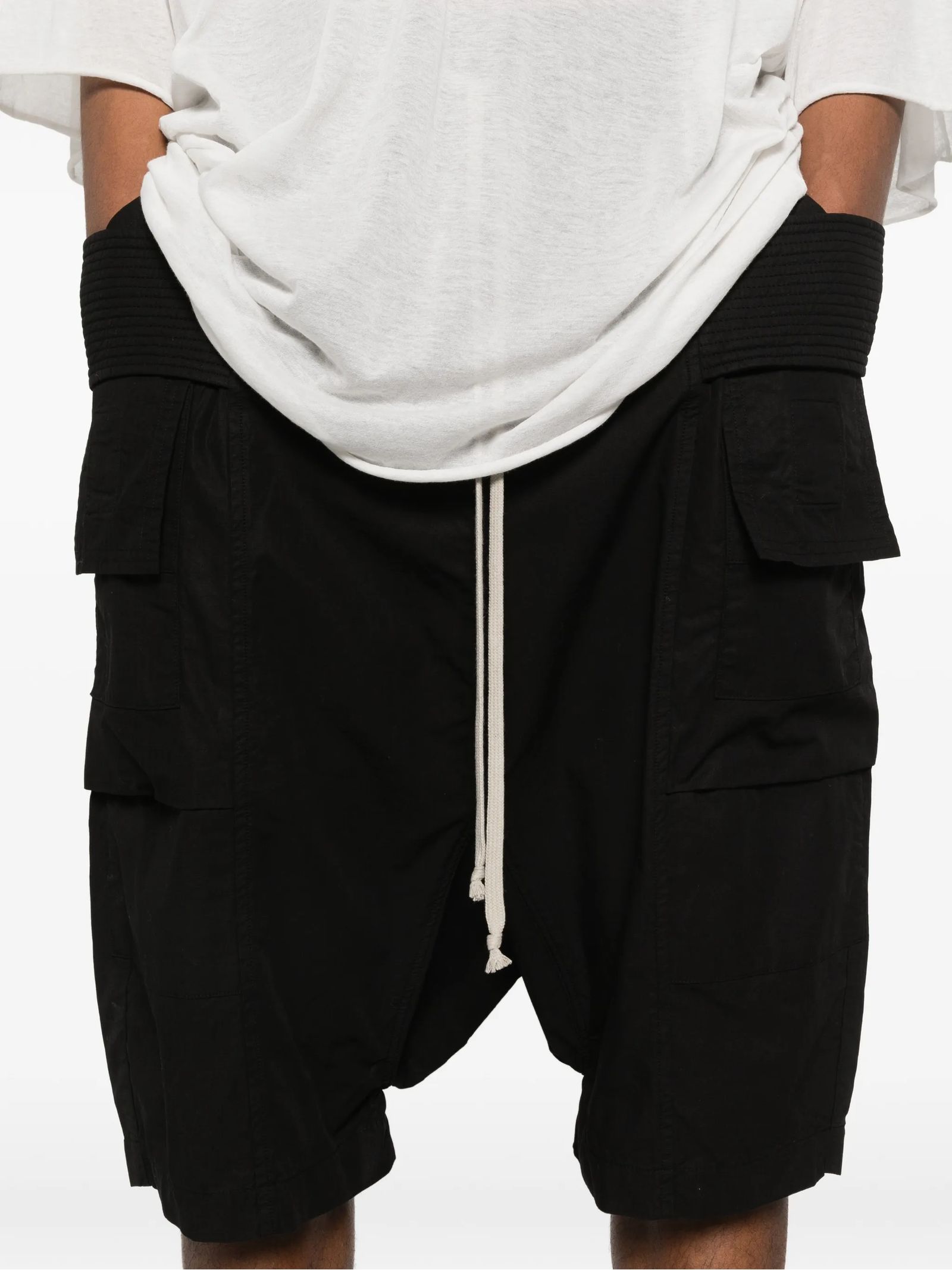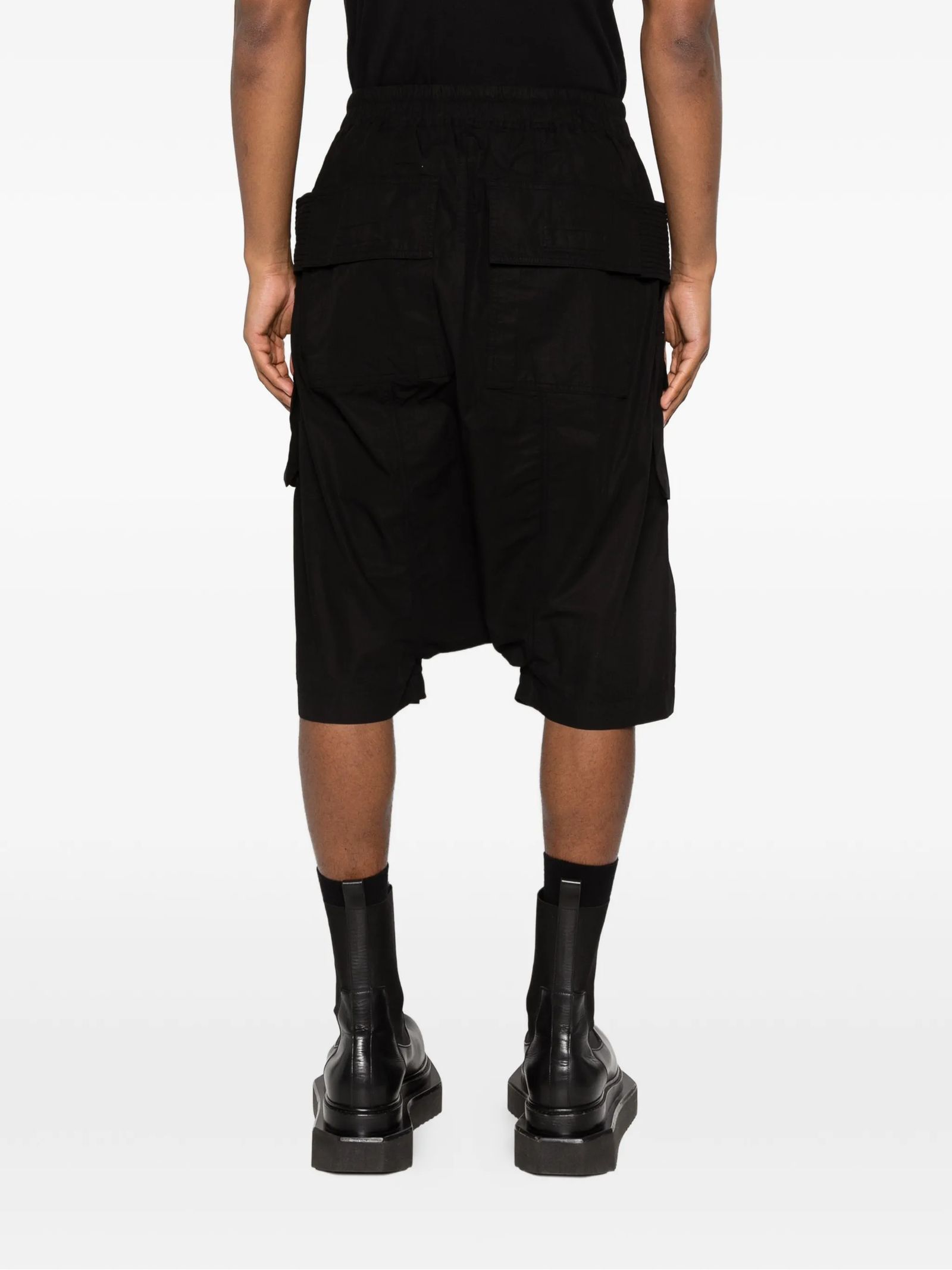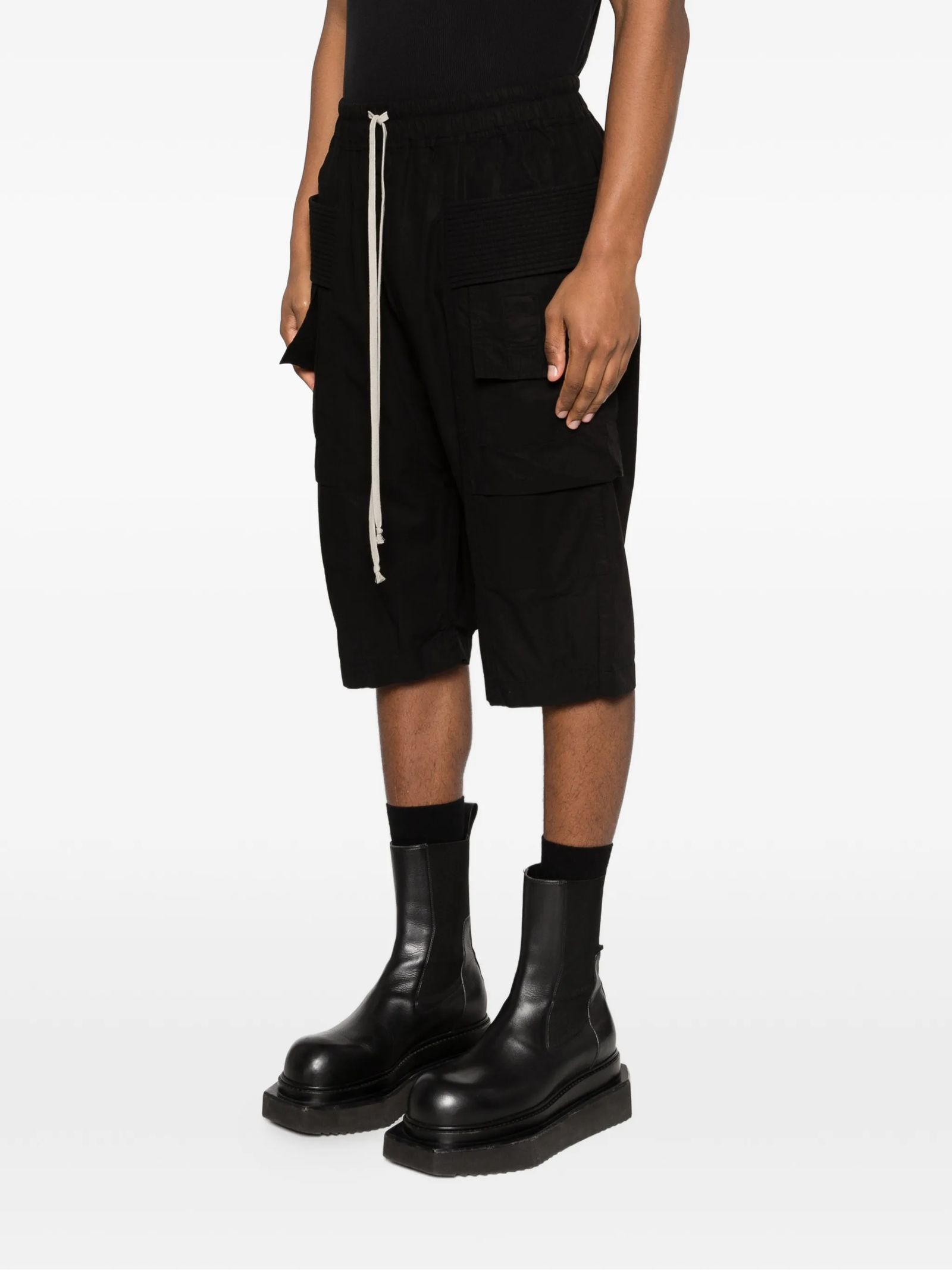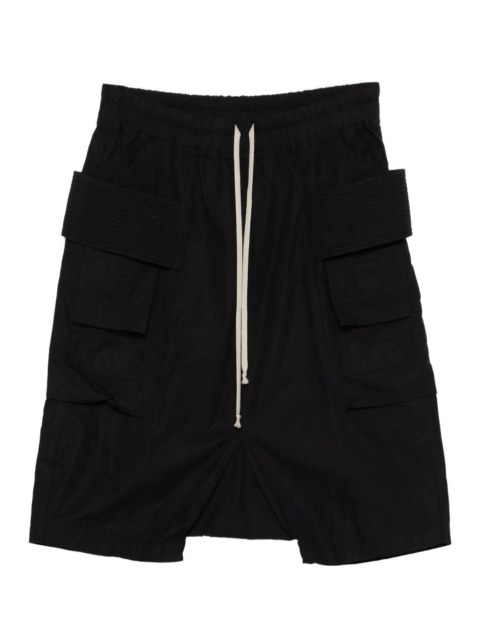 Creatch black cotton cargo shorts, front pockets, elasticated waist, drawstring fastening