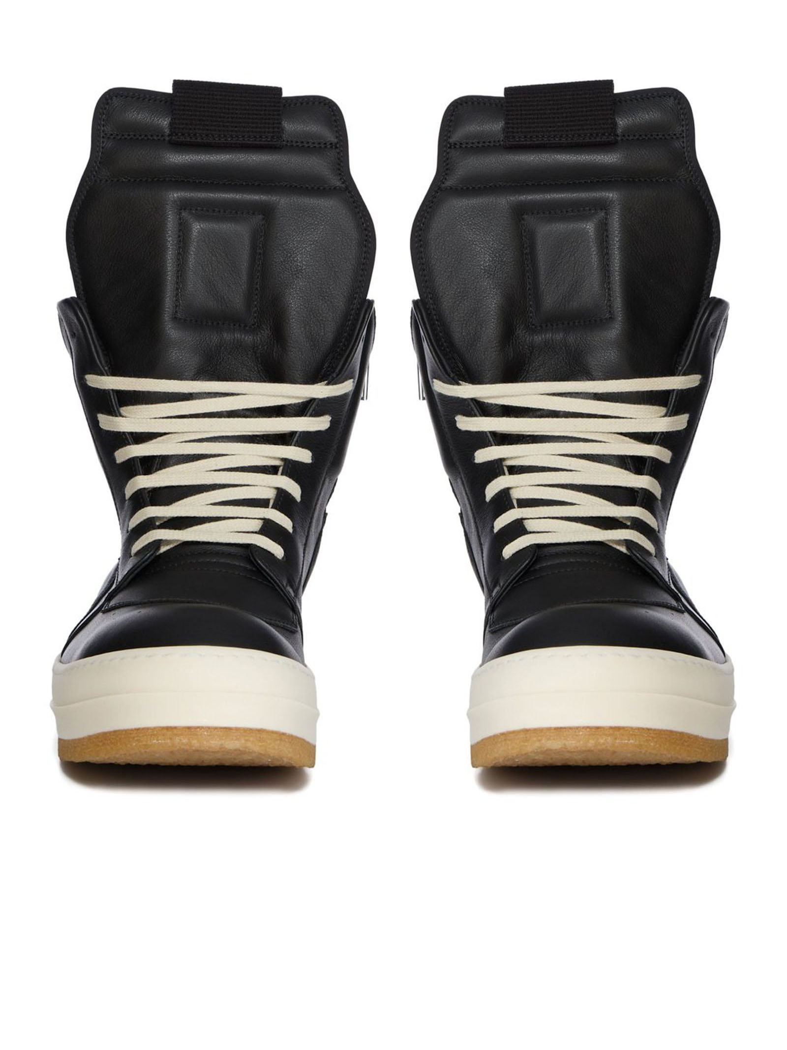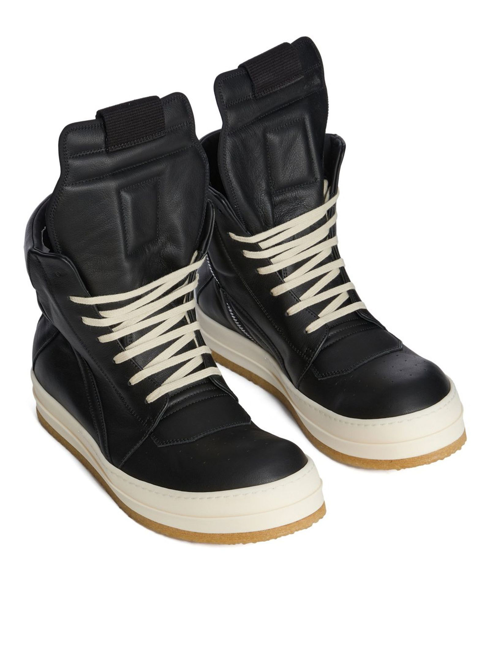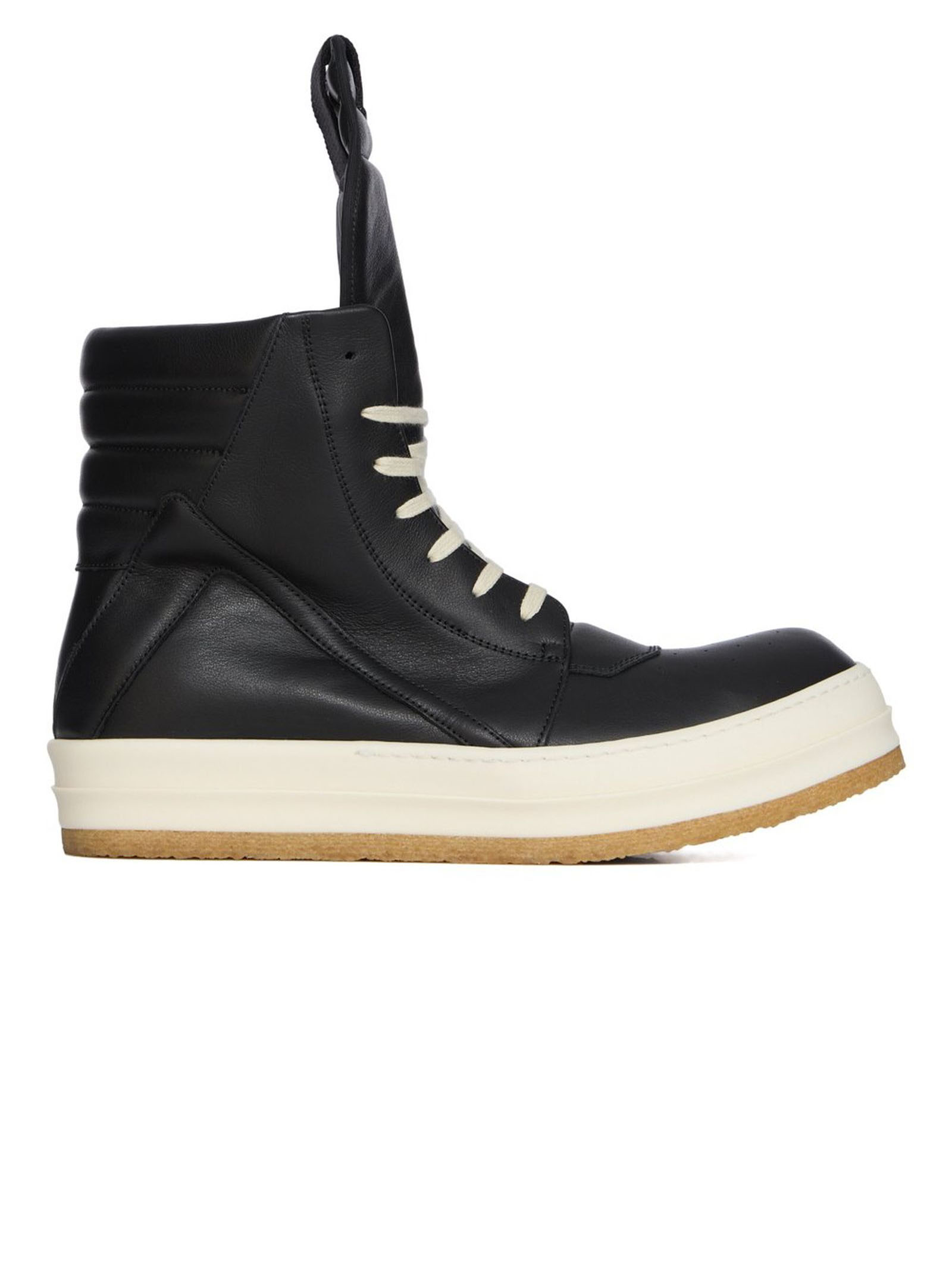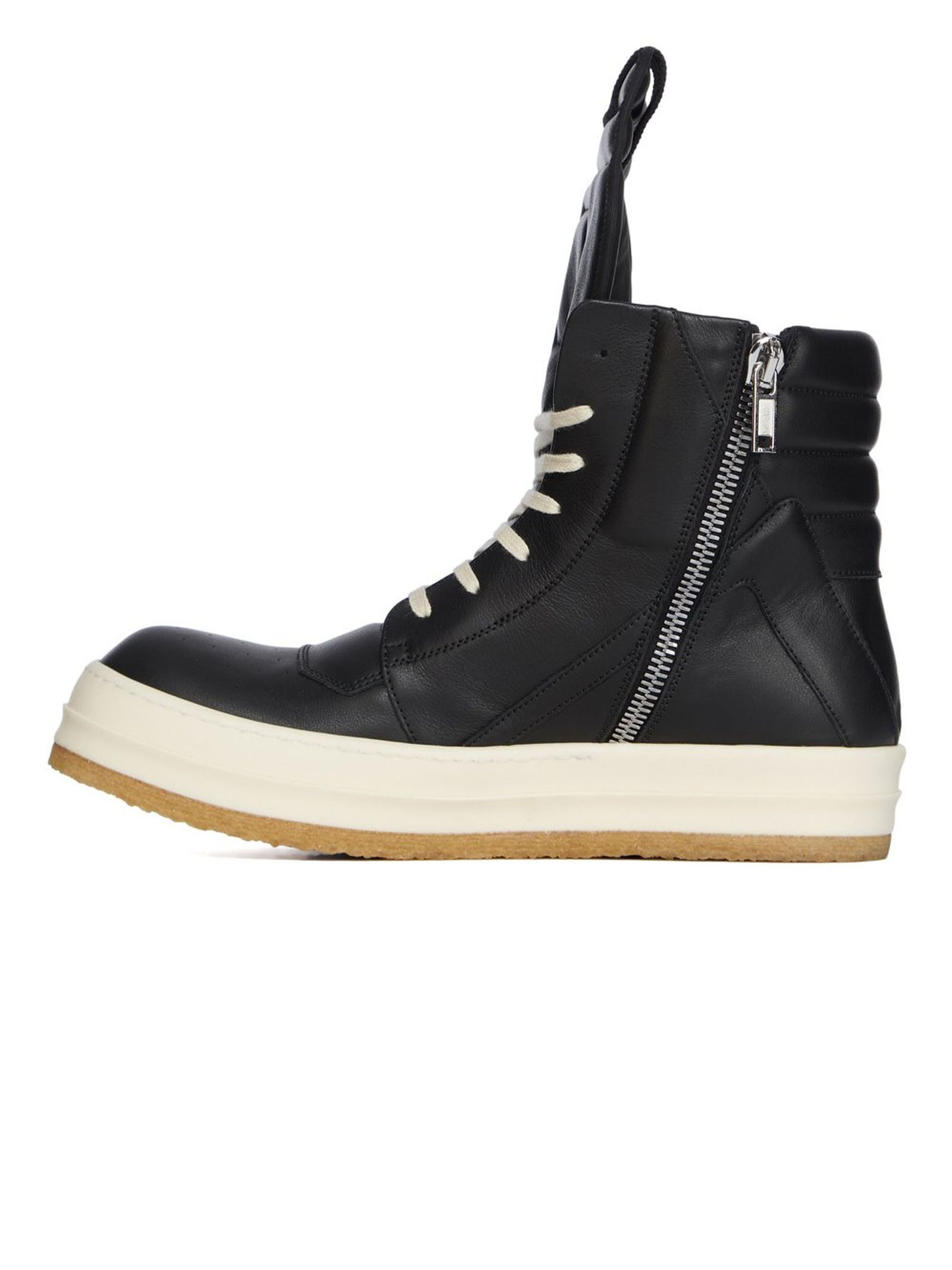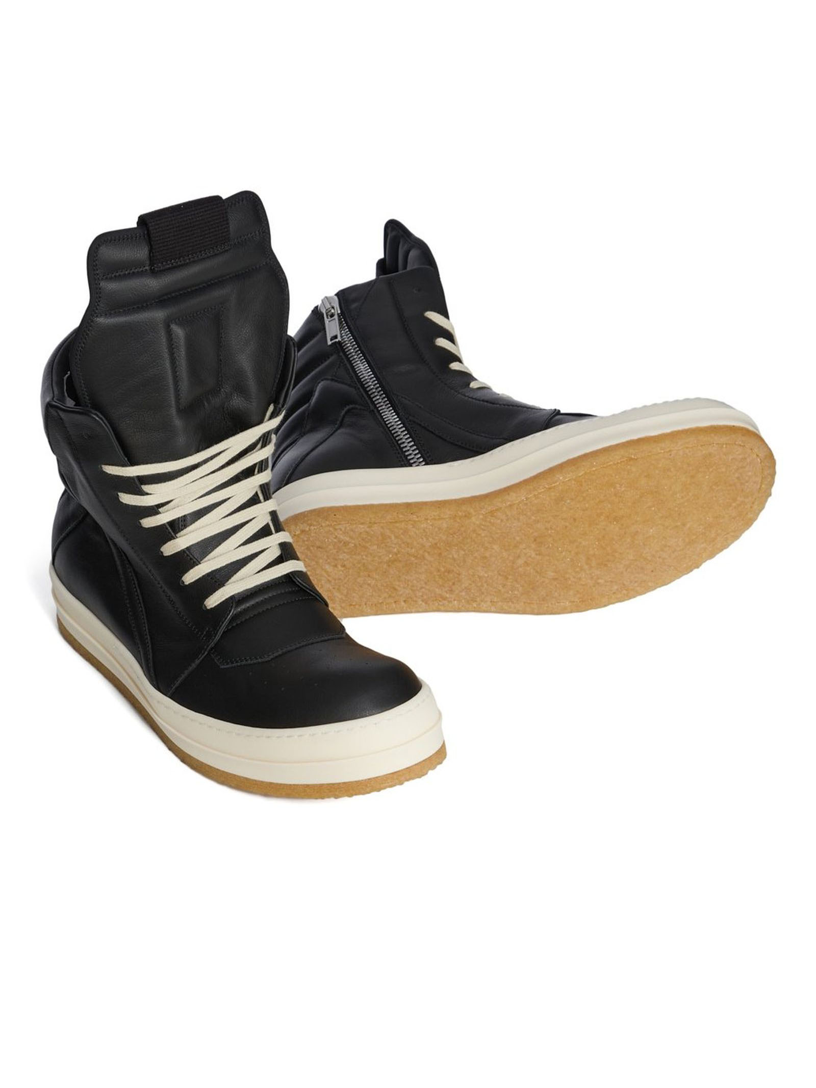 Geobasket In Black/Milk Full Grain Cow Leather, Above-Ankle Height, Extended Tongue With Webbing Tab, Signature Geometric Panels And A Padded Back Counter With Lines Of Topstitching, Contrast Laces, A Zipper On The Inside Ankle For Easy Fastening, And Our Natural Creeper Sole