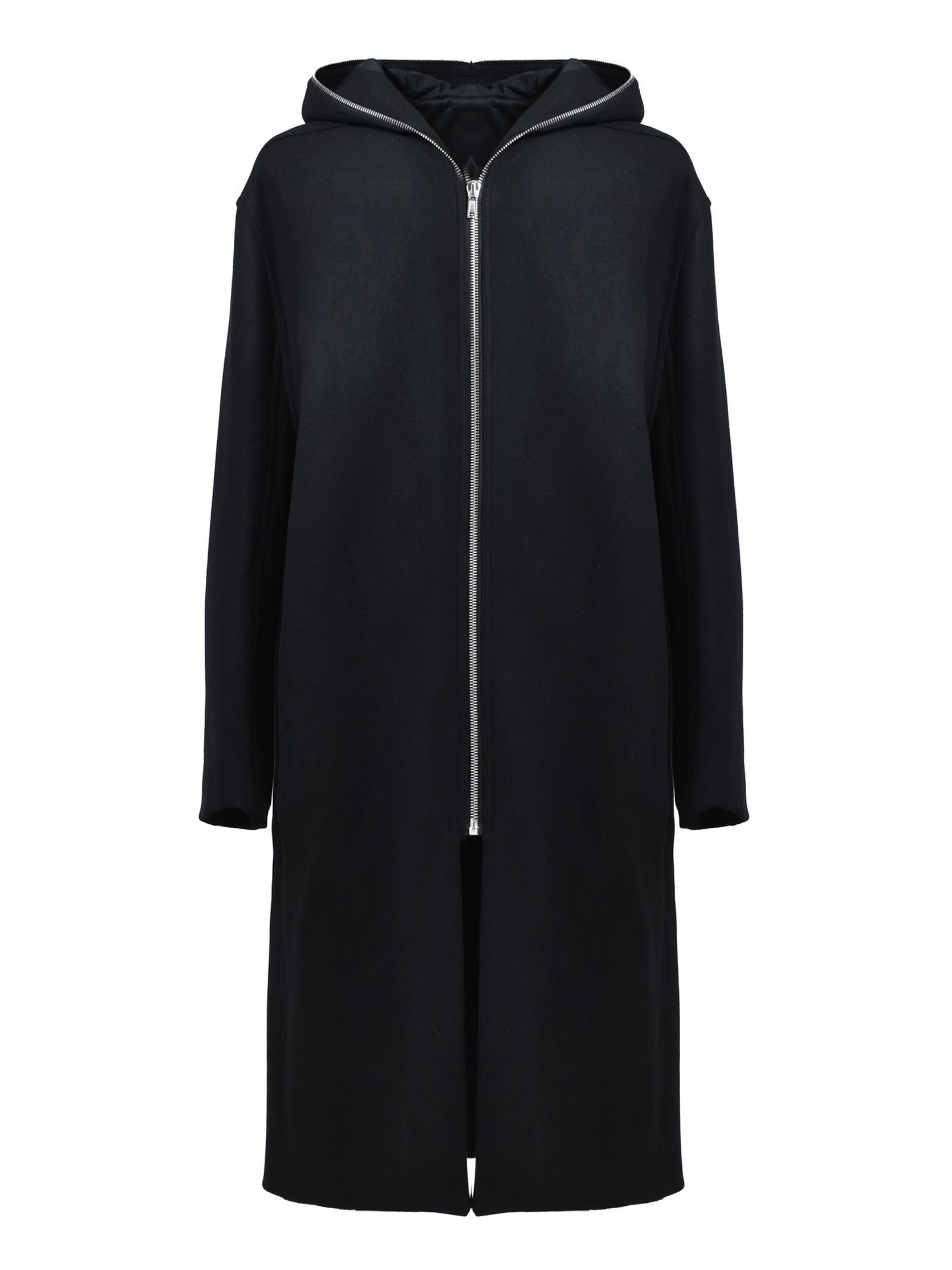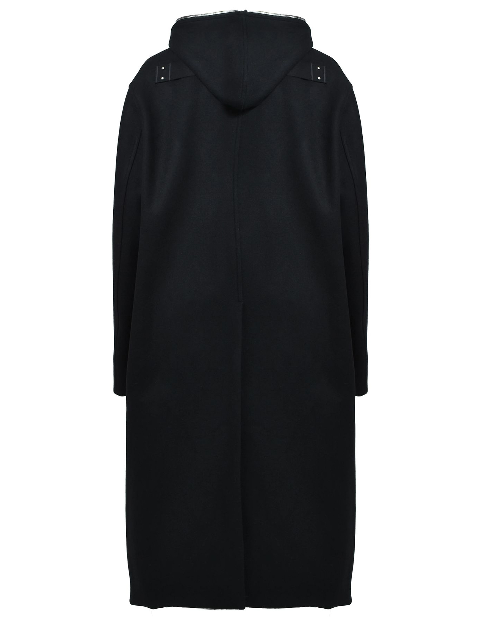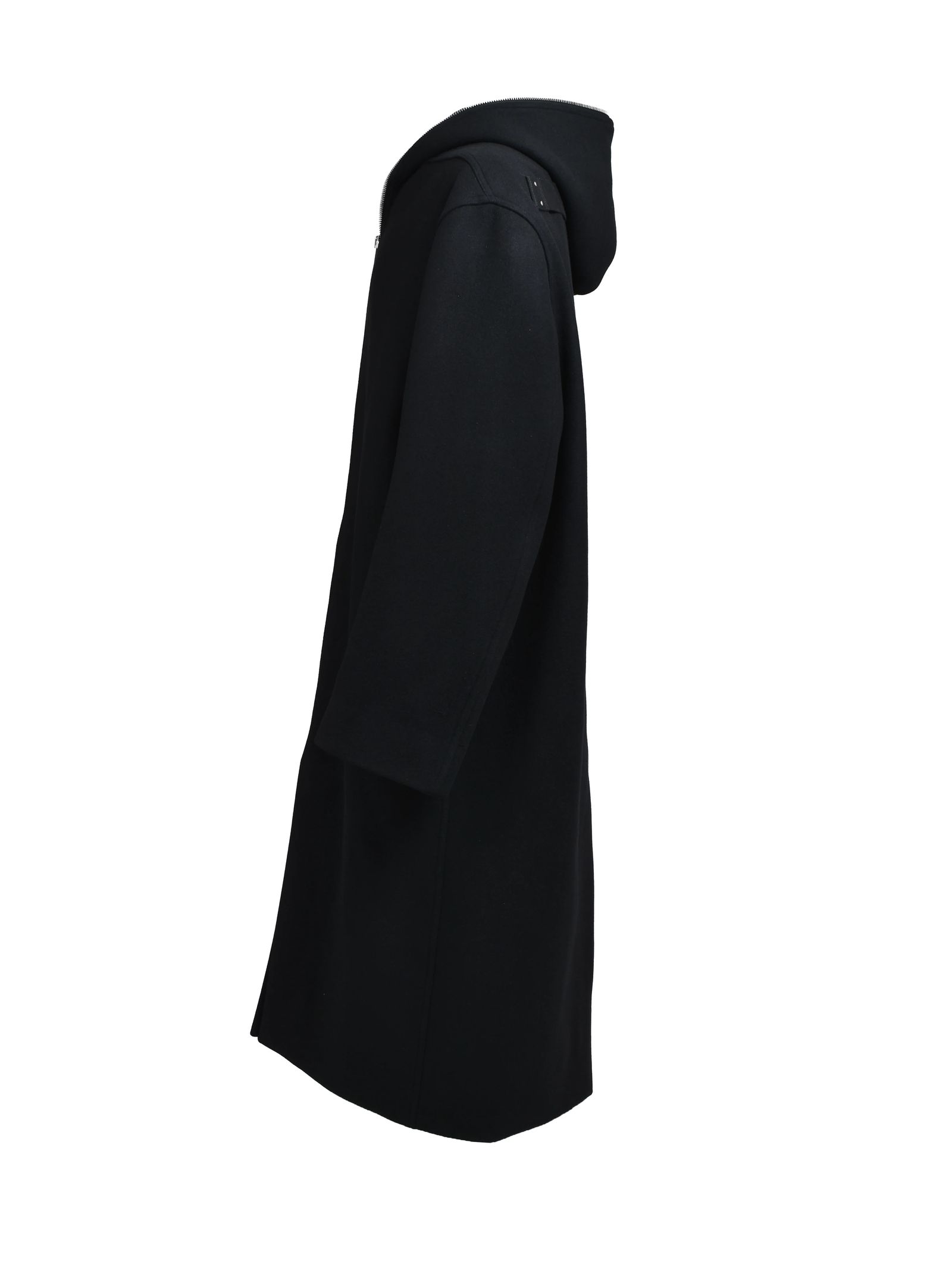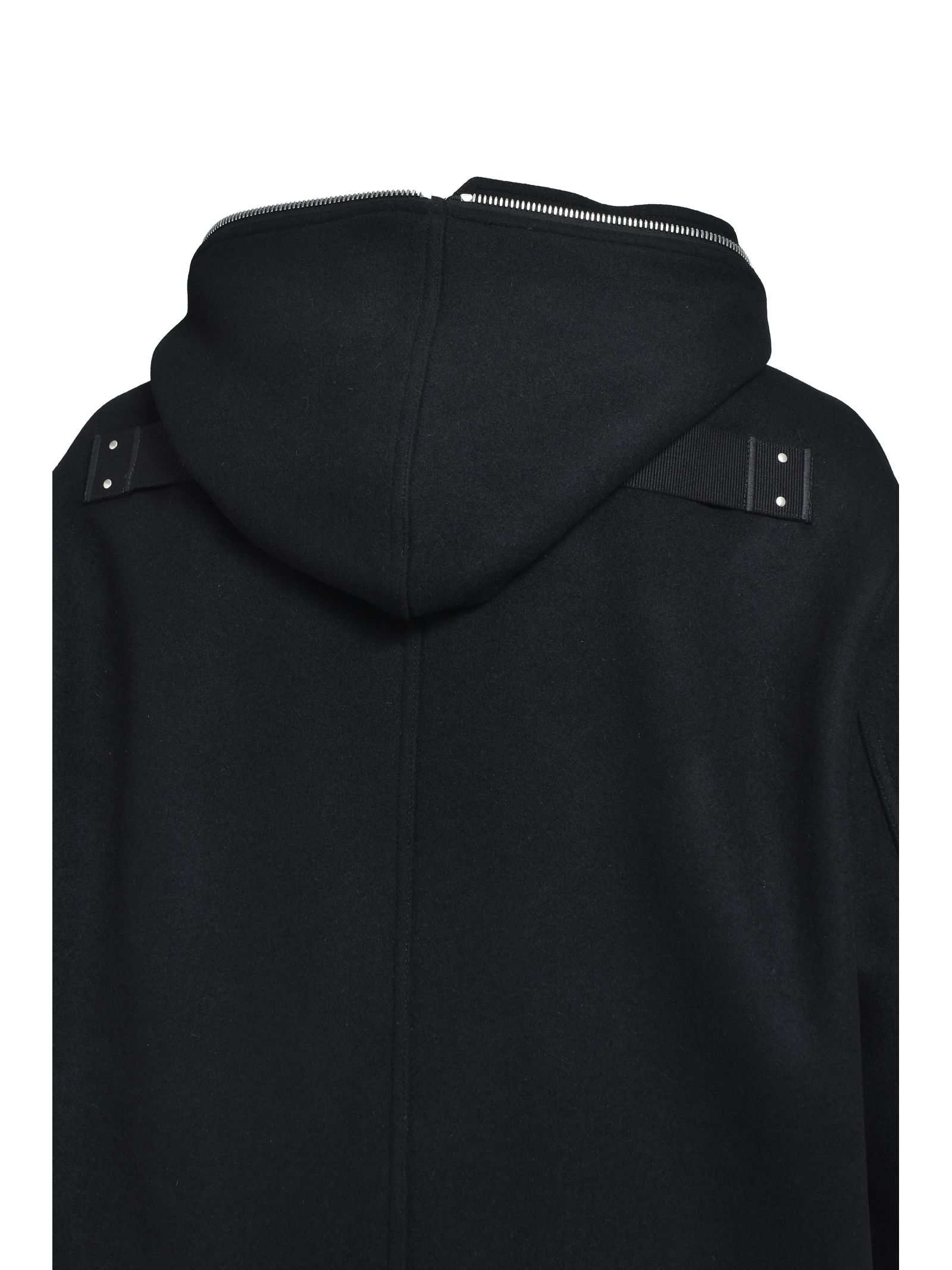 Gimp Mac In Black Melton, Large Hood, Level Shoulder Seams And Concealed Side Seam Pockets. It Features A Front Zipper Closure That Runs From Below Hip Length, Cotton Webbing Strap With Rivet Detail On The Back Yoke. It Is Fully Lined And Has Two Internal Zippered Pockets100% NEW WOOL