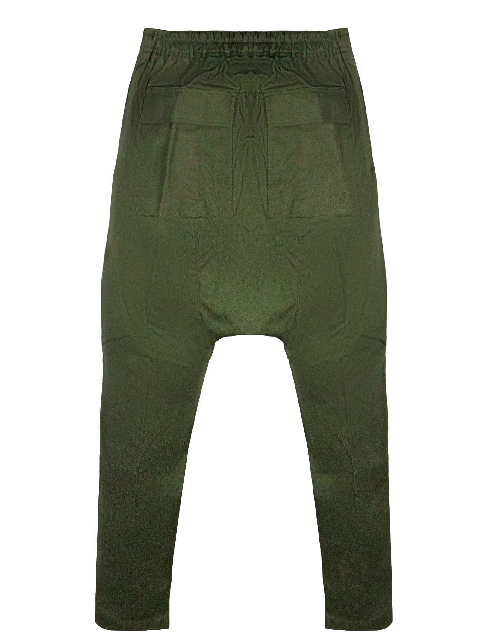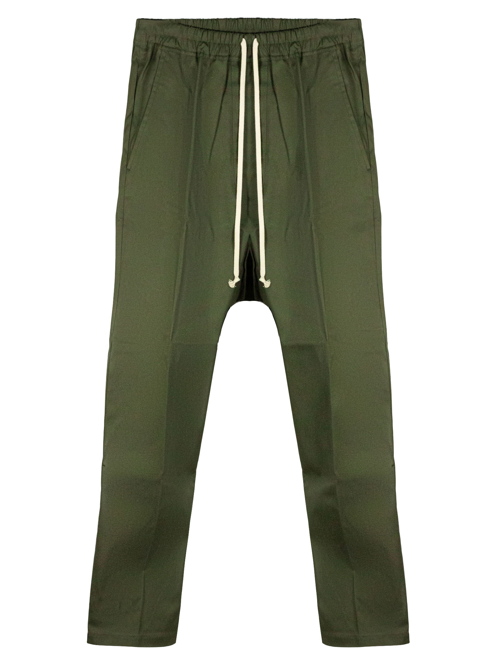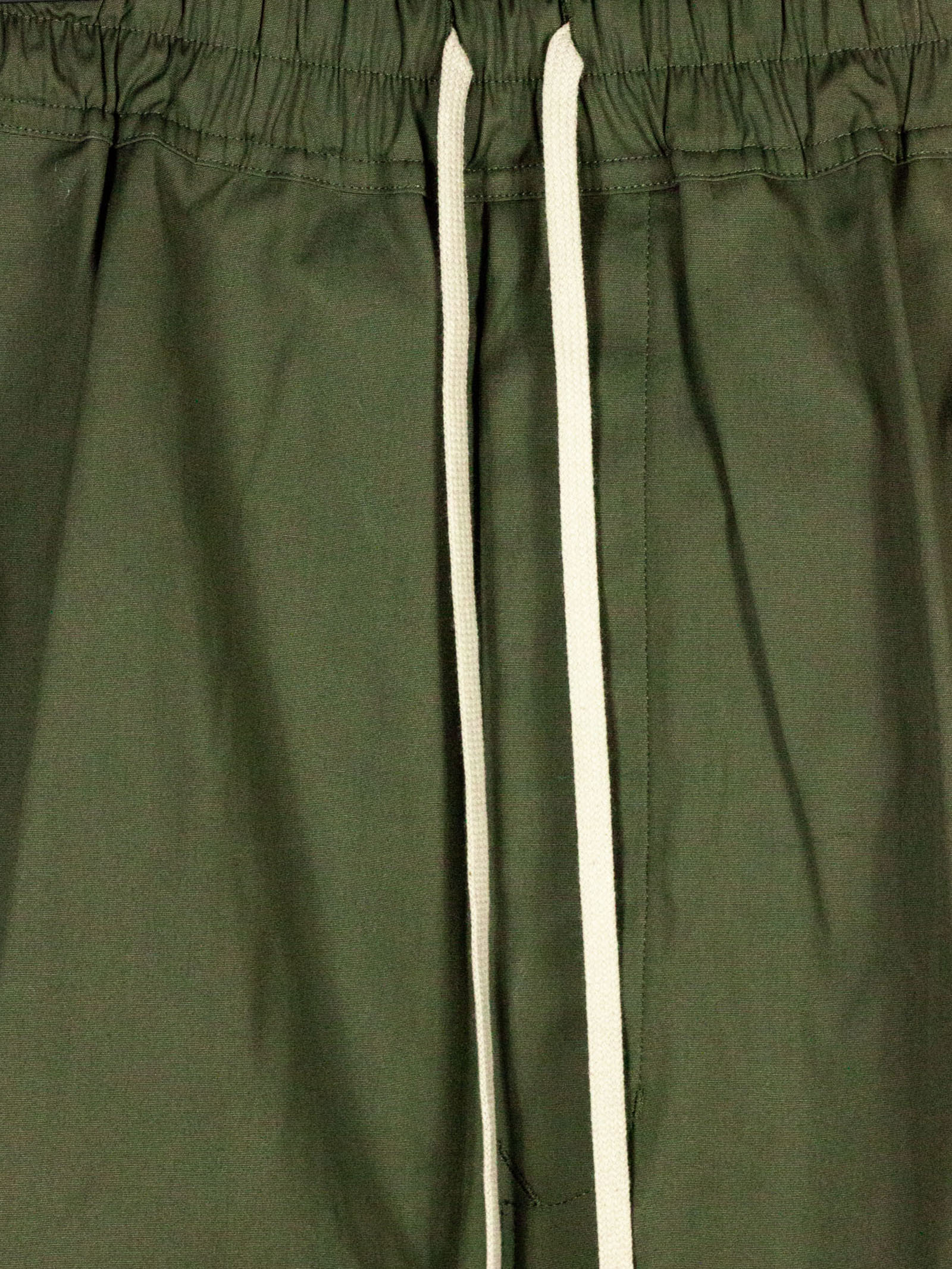 Green cotton trousers with drawstring, double back pockets with flaps, side pockets, wide crotch