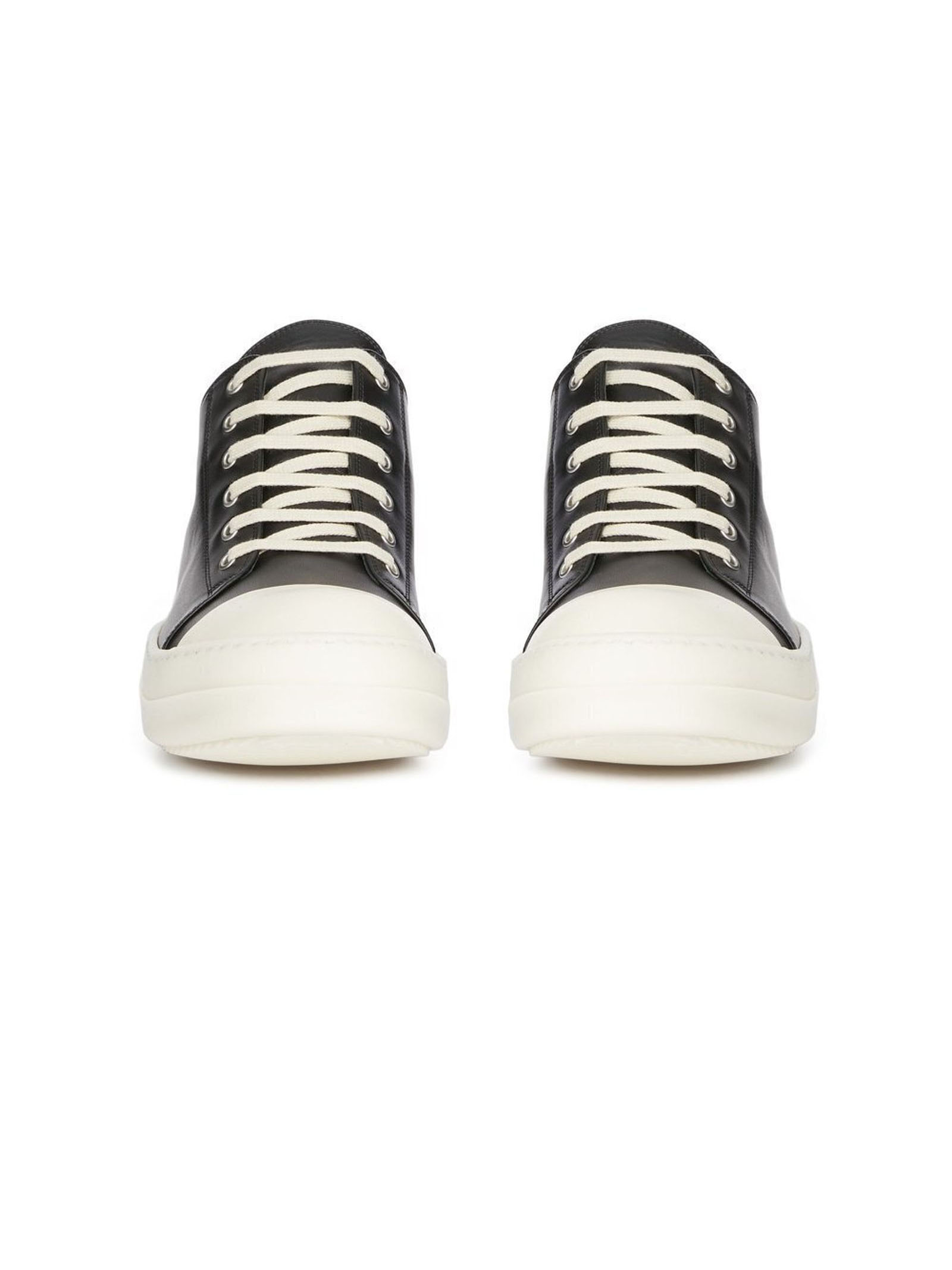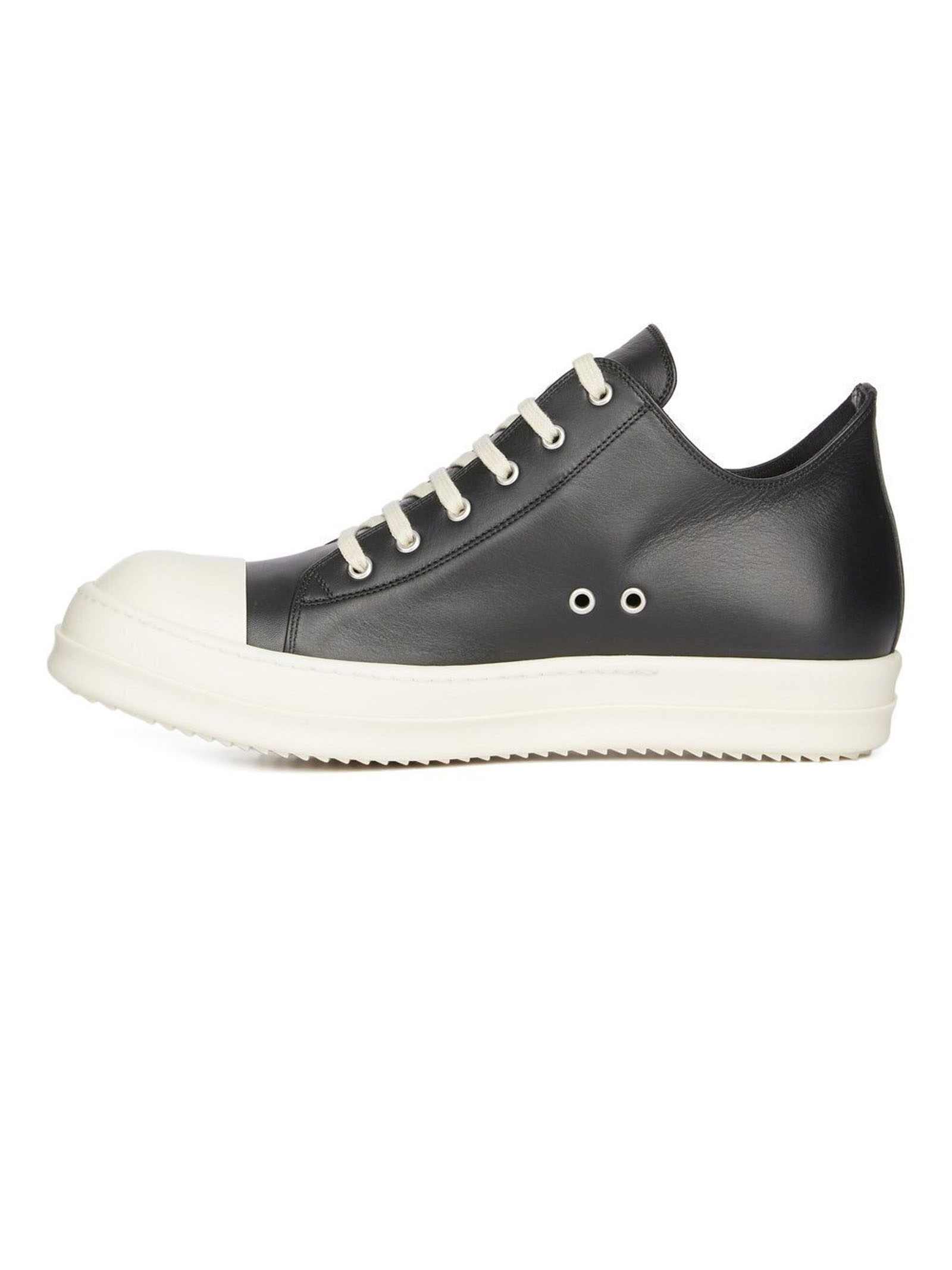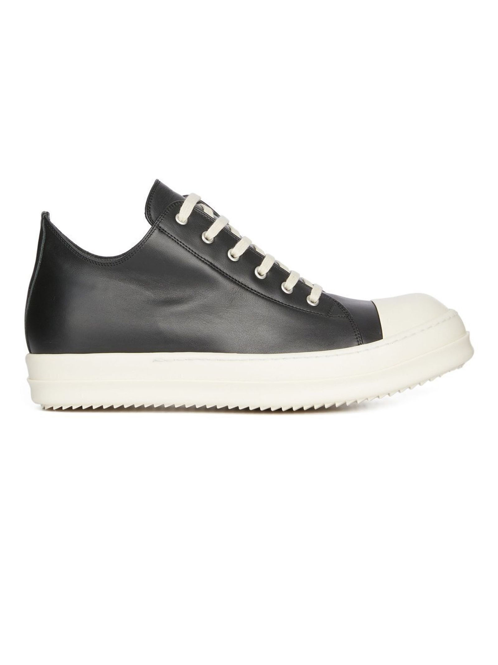 Low Sneaks In Black/Milk/Milk Full Grain Cow Leather, Rising At The Back And Feature Six Eyelets, Laces, Toe Caps And Shark-Toothed Bumper Soles