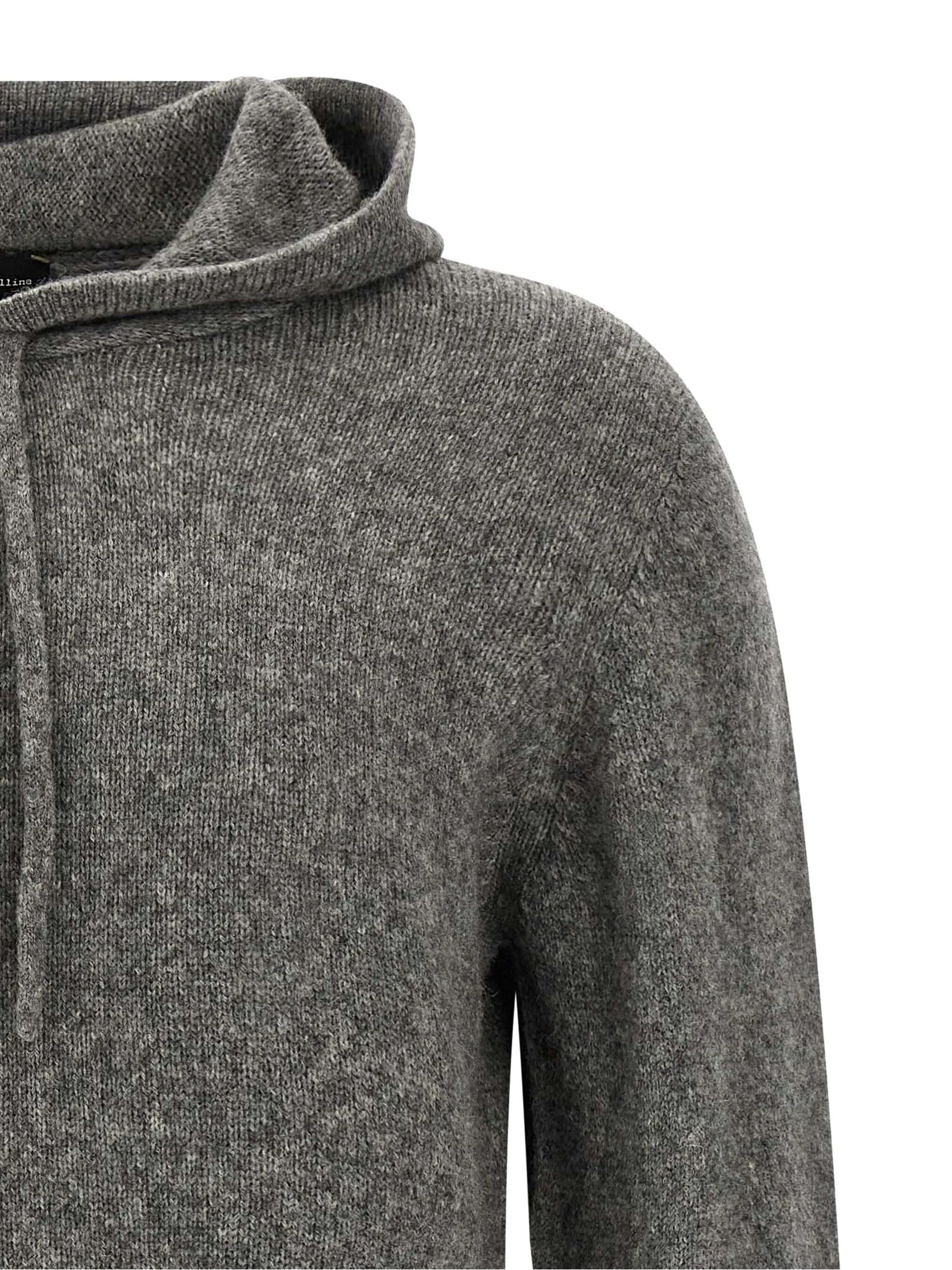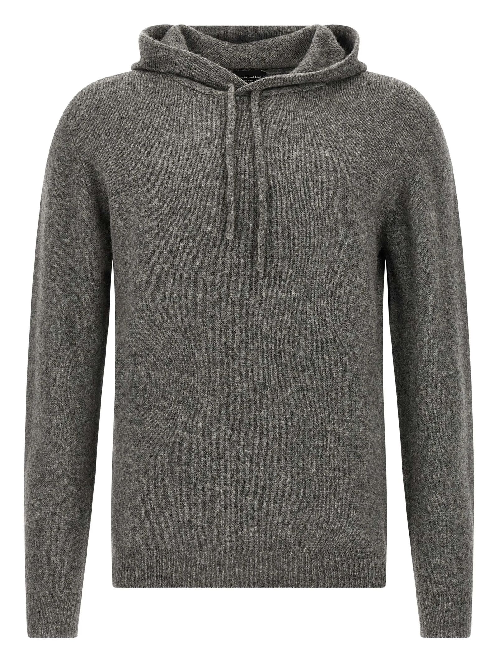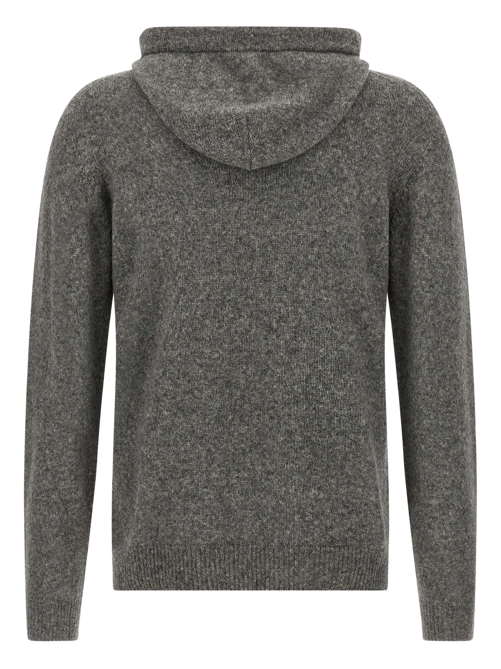 Grey virgin wool and camel hooded sweater, hooded neckline, long sleeves, cuffed sleeves, ribbed hem, wool blend