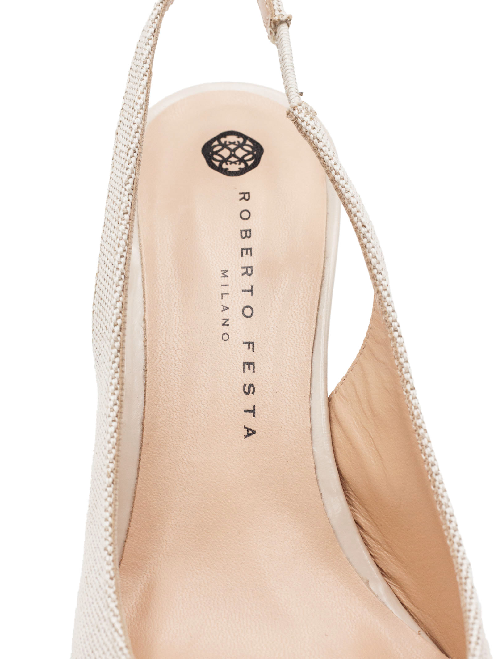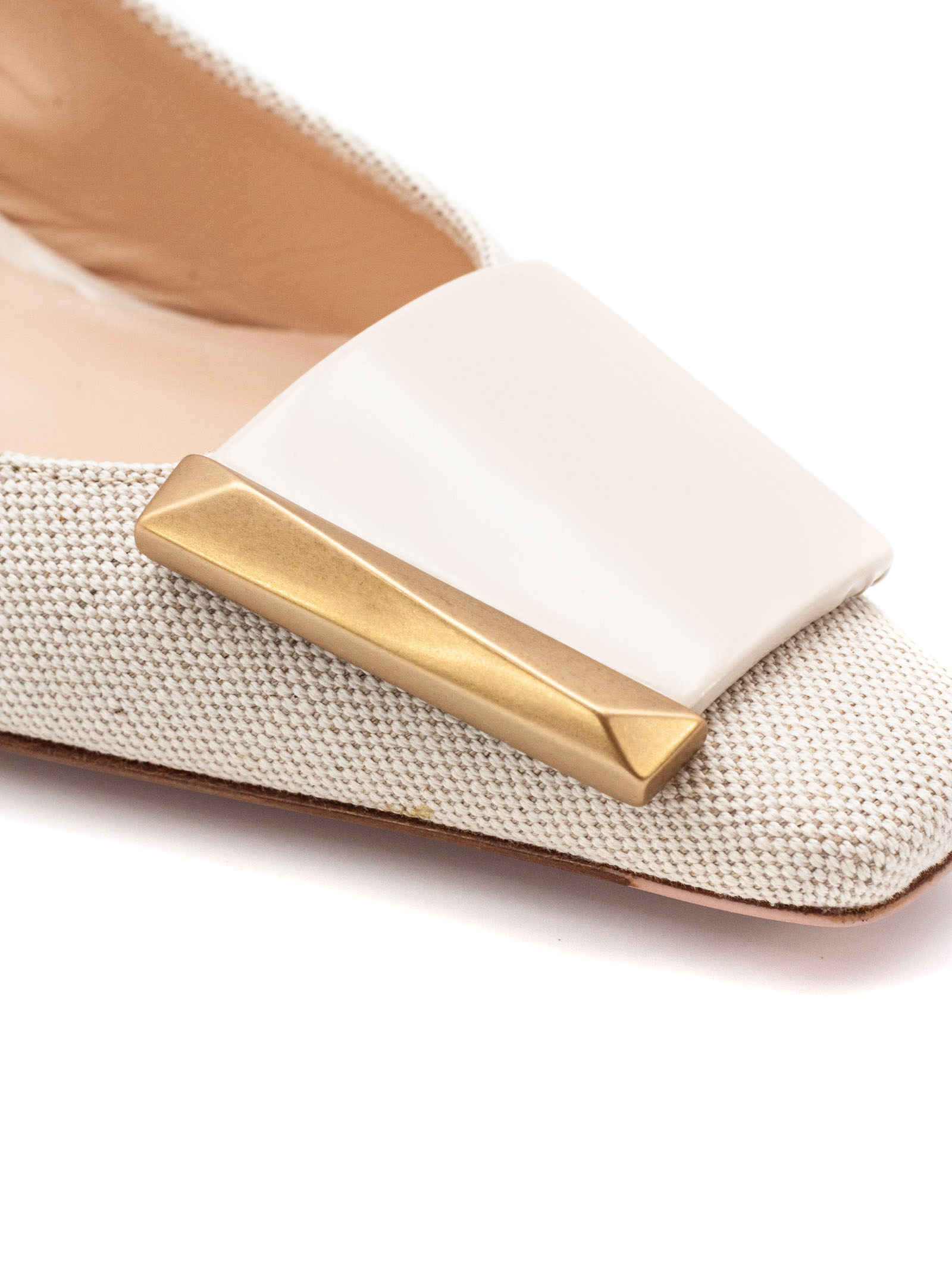 Arienne slingback in beige canvas with shiny buckle and gold-colored metal detail, pointed toe, leather sole with logo, heel height 4 cm