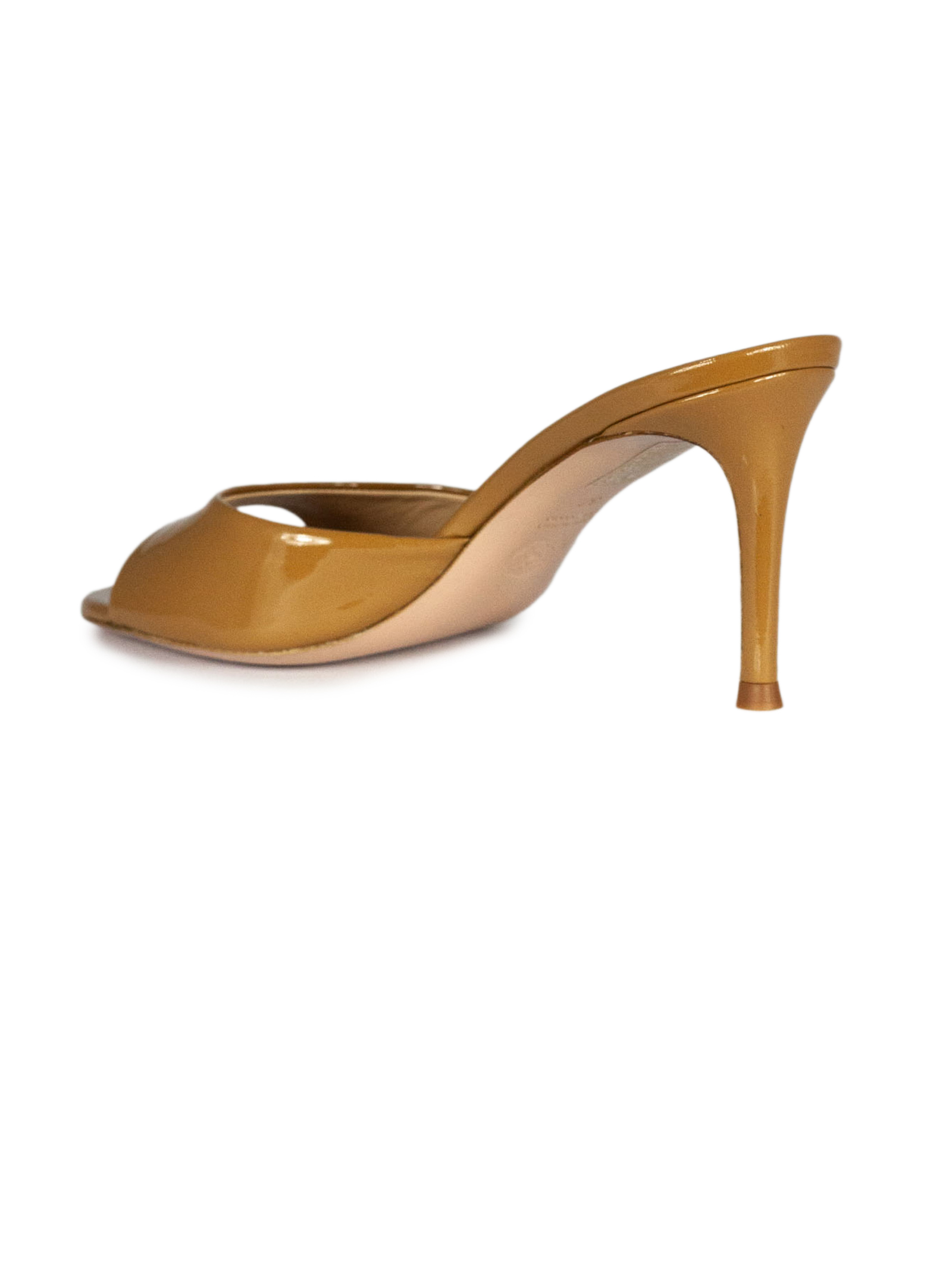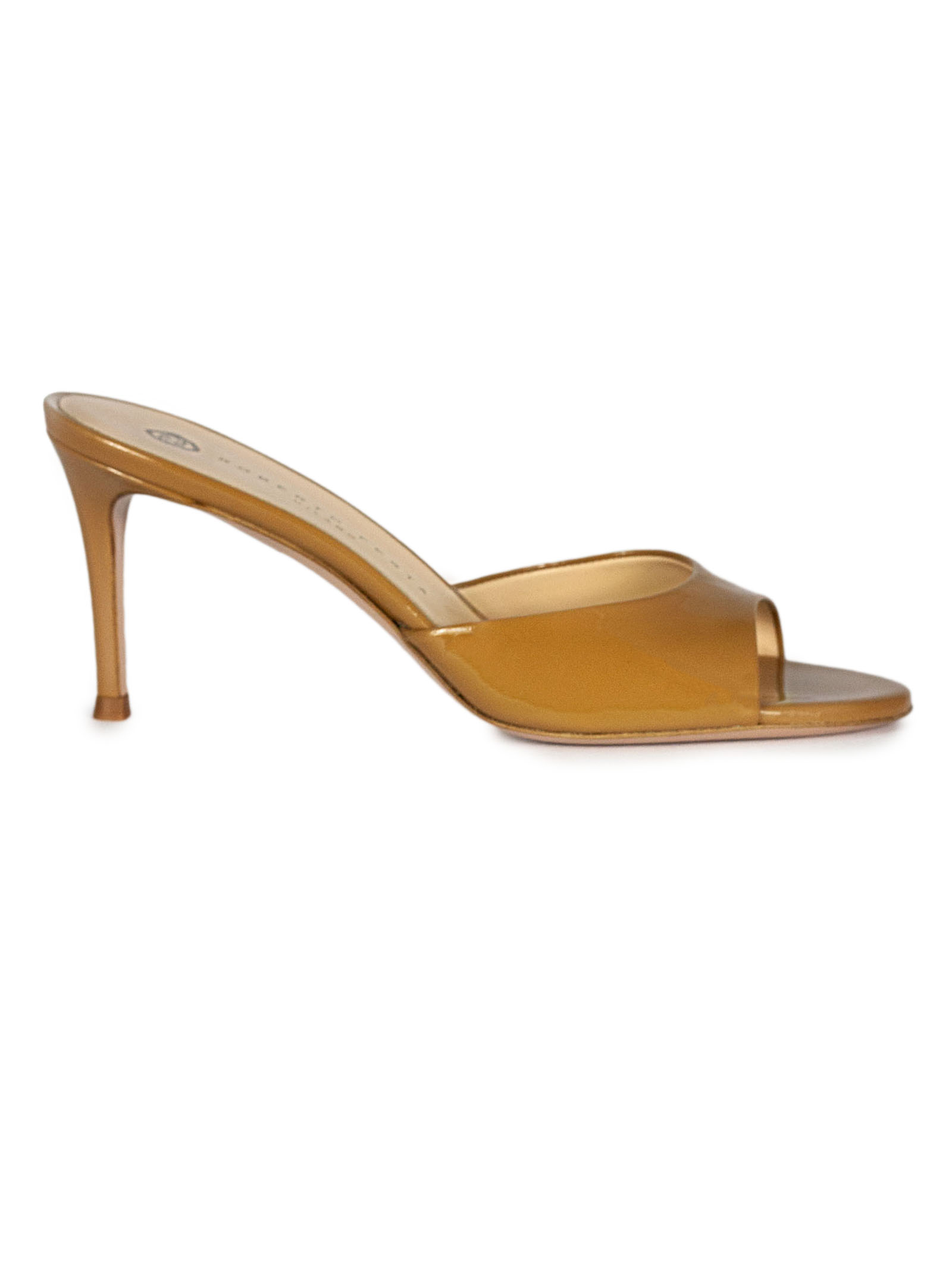 Brown shiny leather Boa sandals with round toe, leather sole with logo, heel height 8 cm