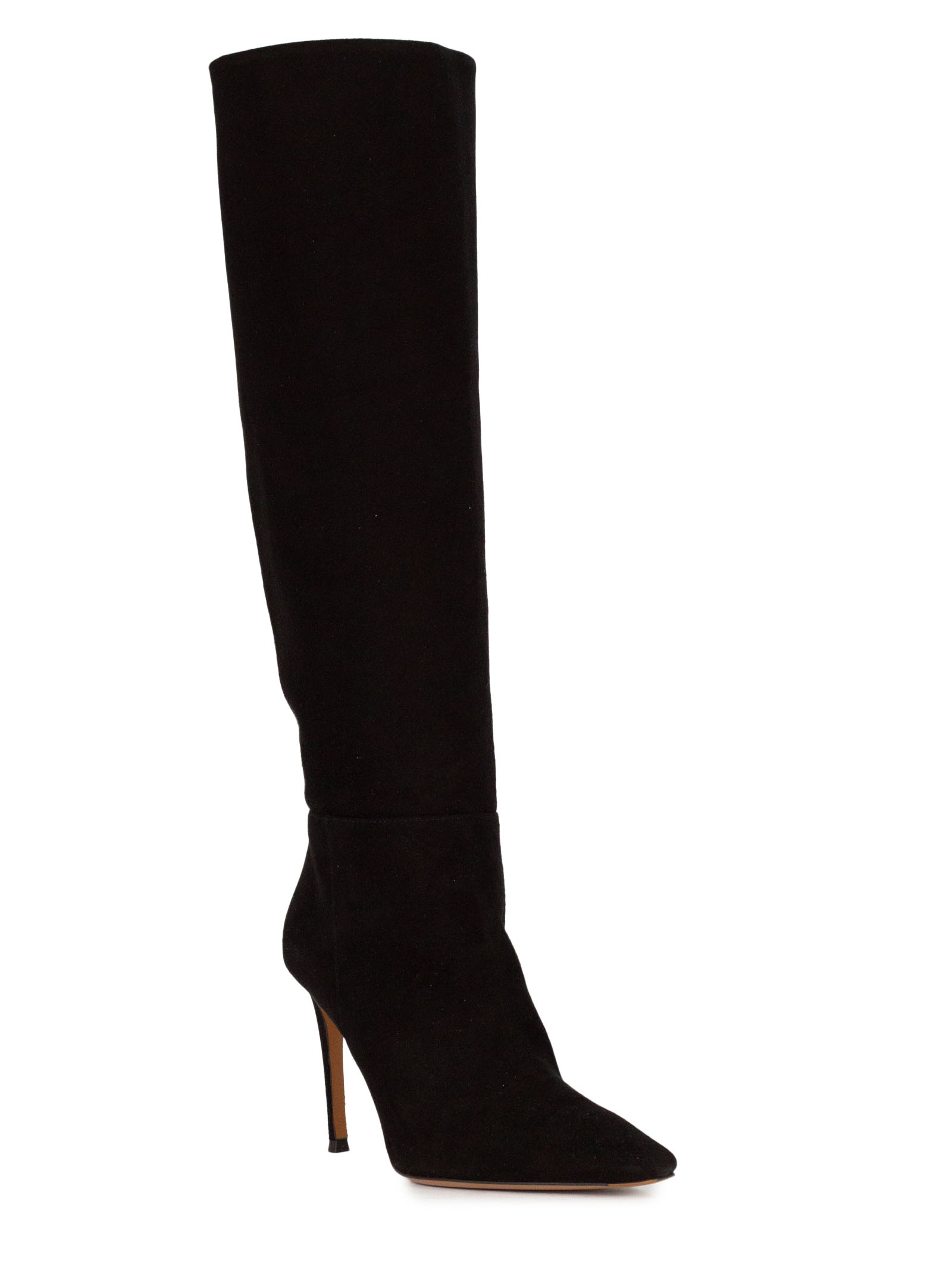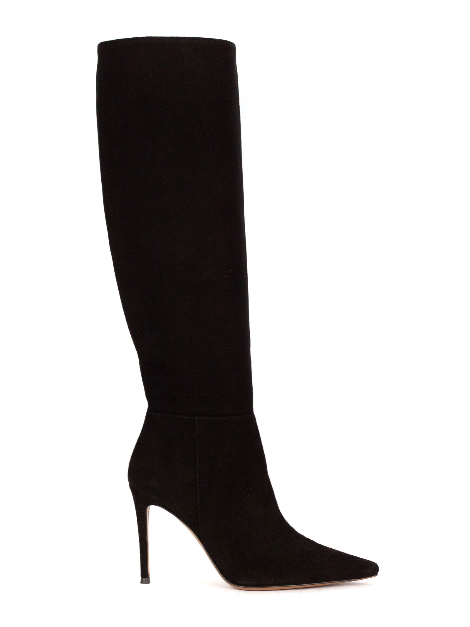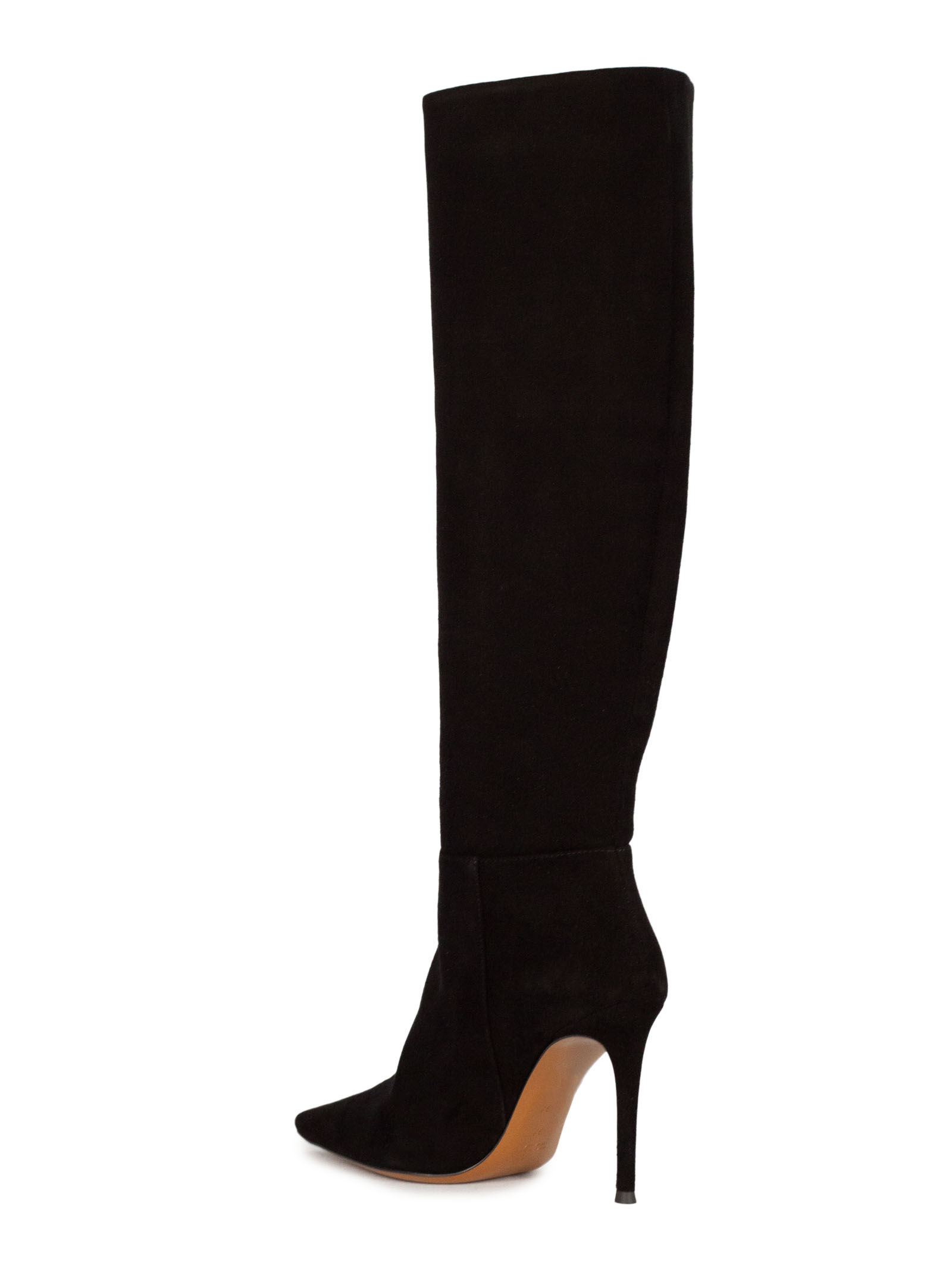 Klaria high boot in black suede, tapered toe, slip-on fit, leather sole with logo, heel height approx. 9 cm
