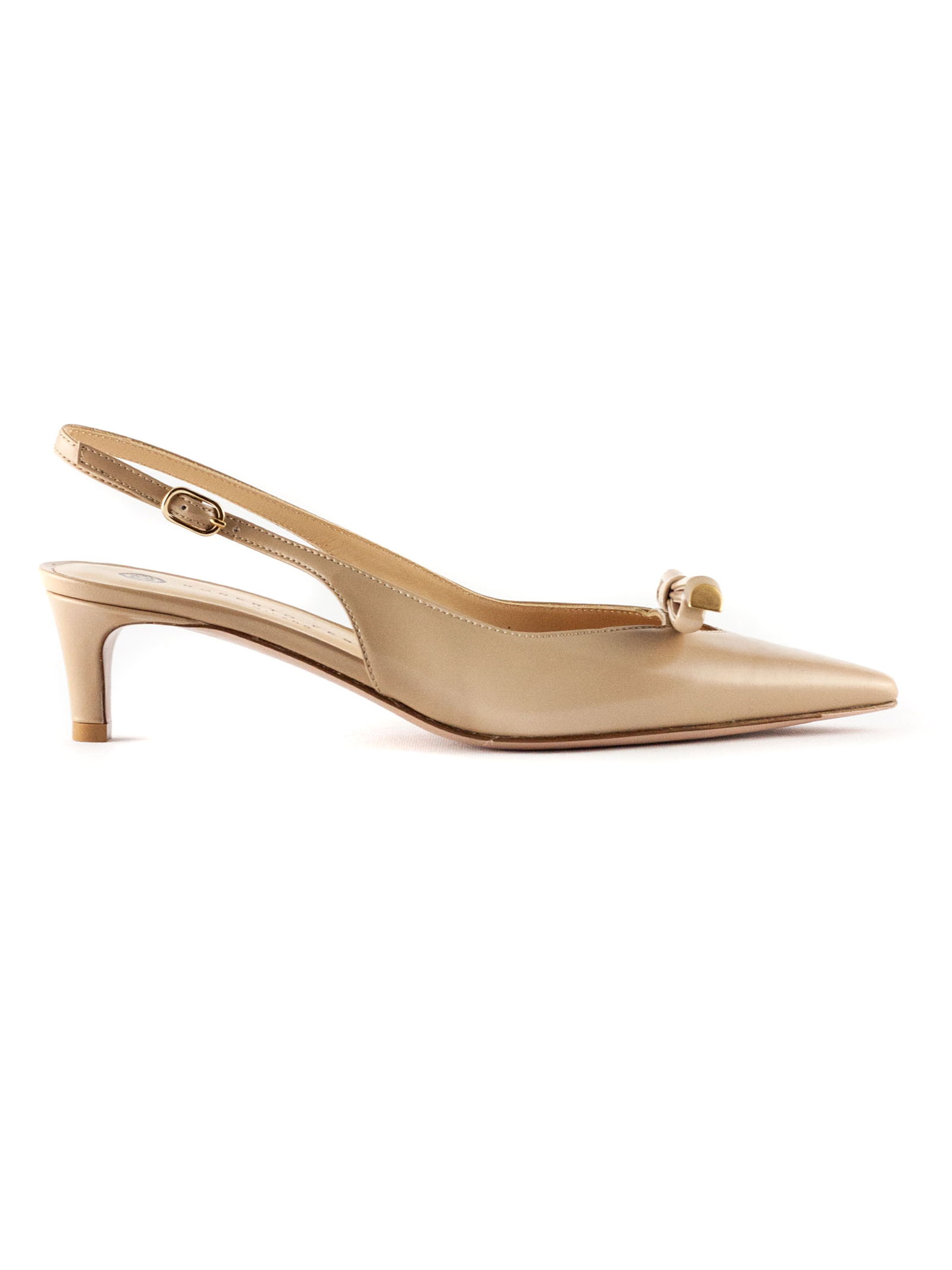 Senyal beige leather slingback with bow detail, pointed toe, adjustable gold-colored metal buckle closure, leather sole with logo, 5 cm heel height