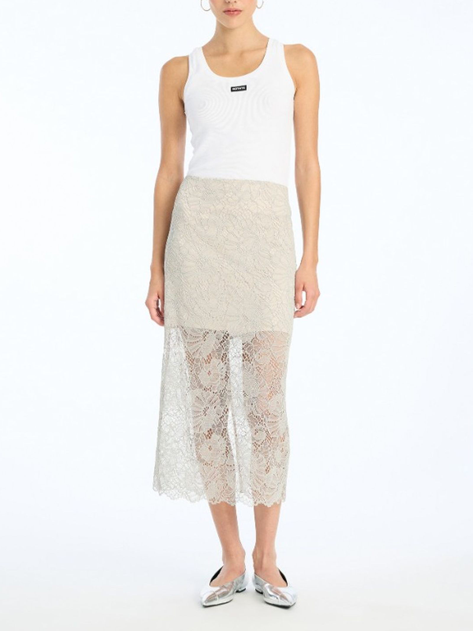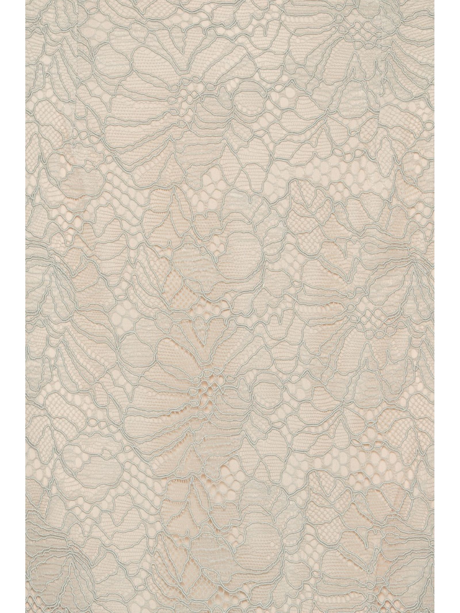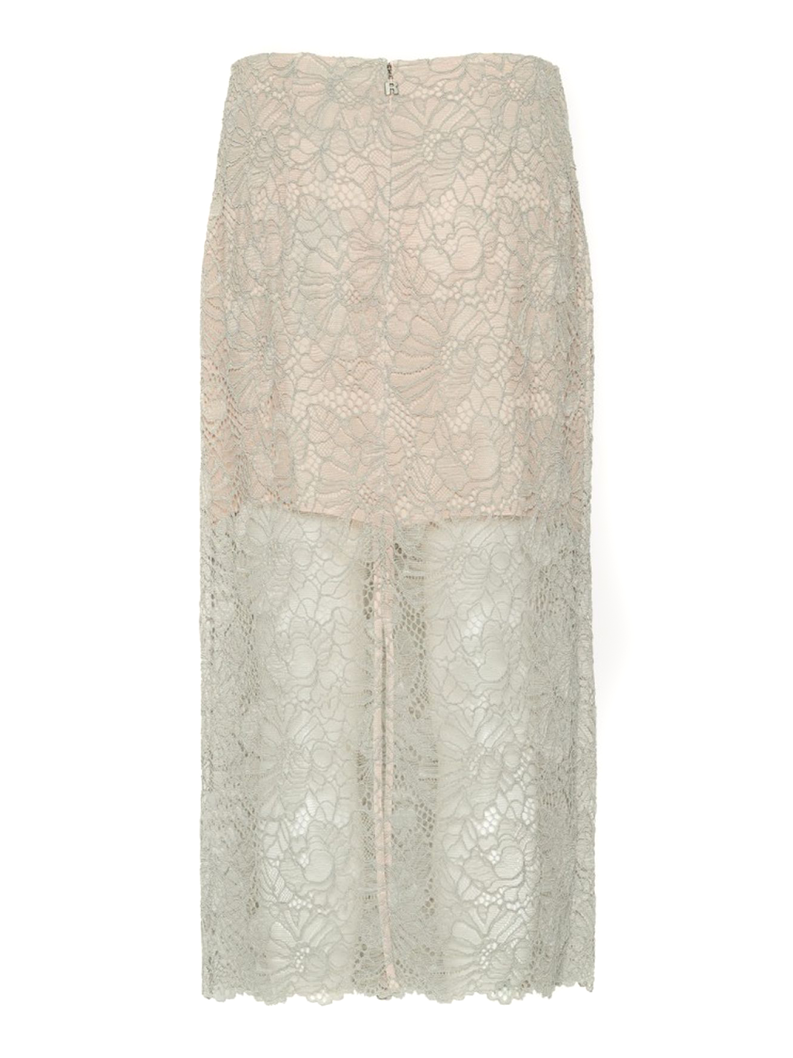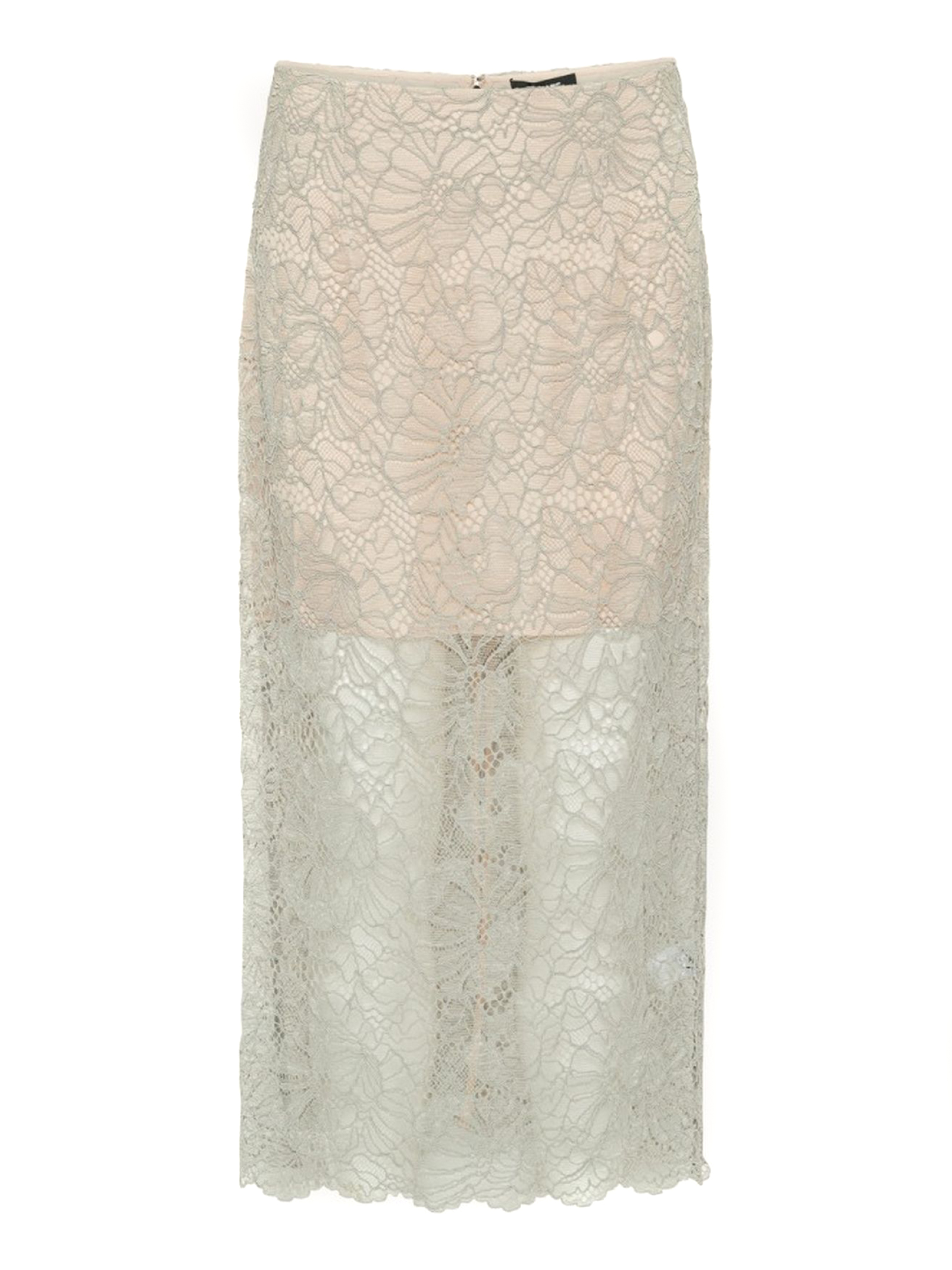 Flower Mesh Pencil Skirt Light Grey is a midi-length skirt made from delicate floral lace. The design has a fitted silhouette with a straight cut and scalloped hem. The skirt features a tonal lining that ends above the knee, leaving the lower part semi-sheer. It fastens with a concealed back zip, Composition: 100% Polyester (Recycled), Lining: 100% Viscose