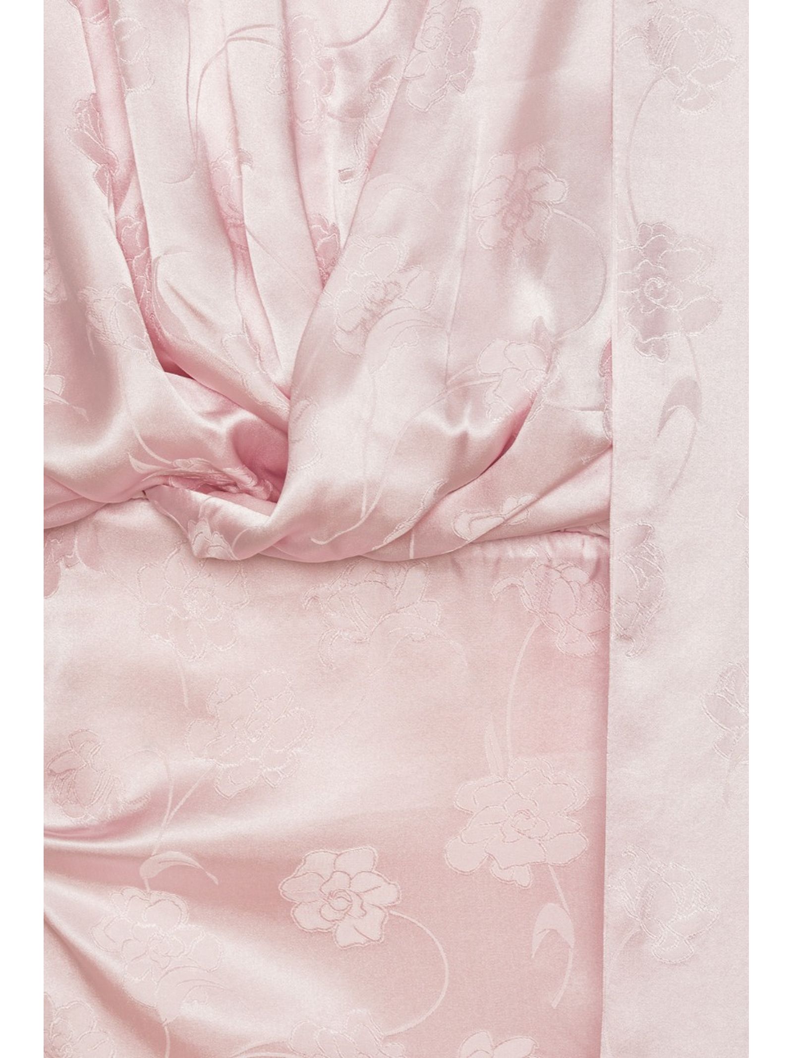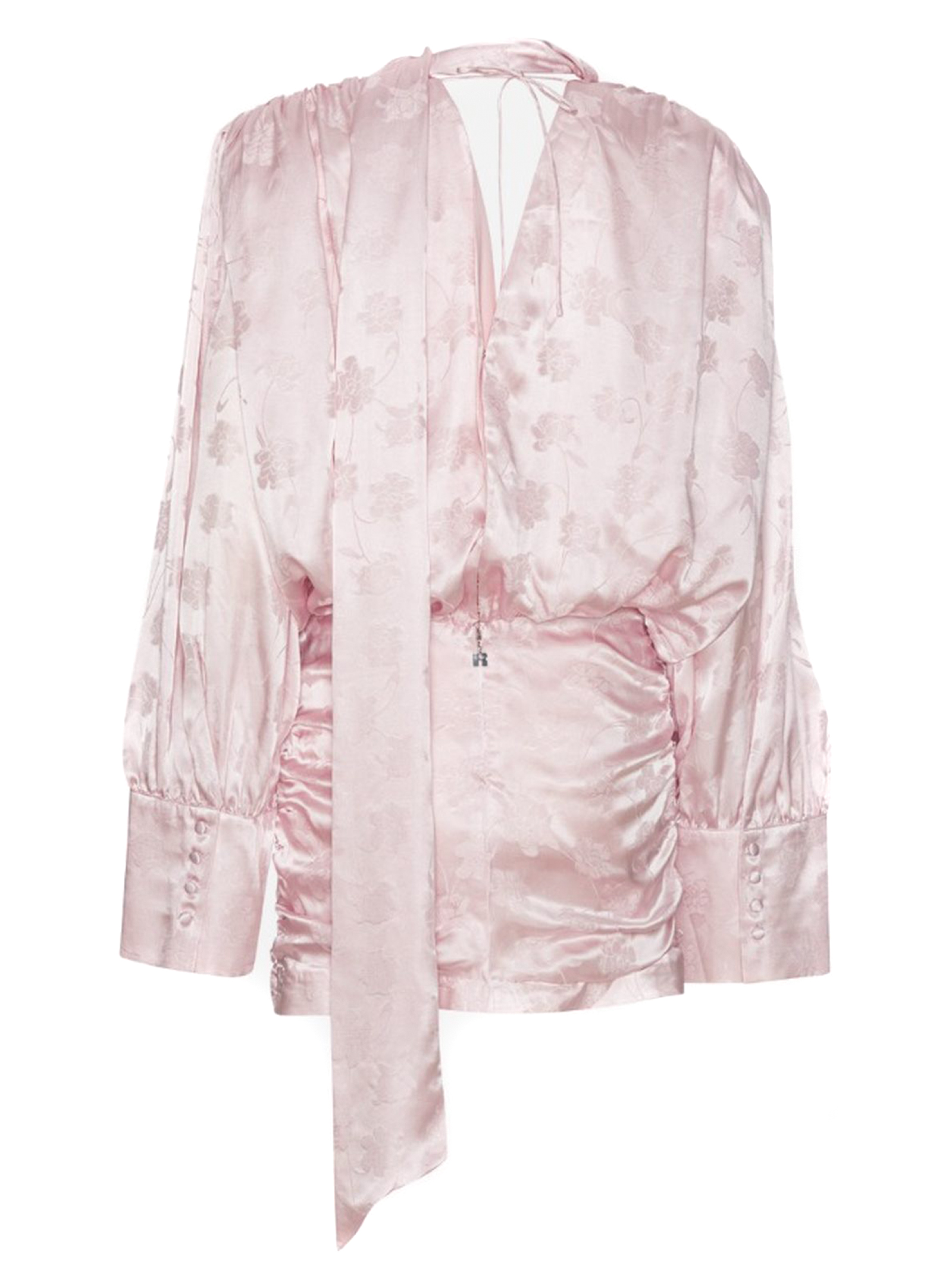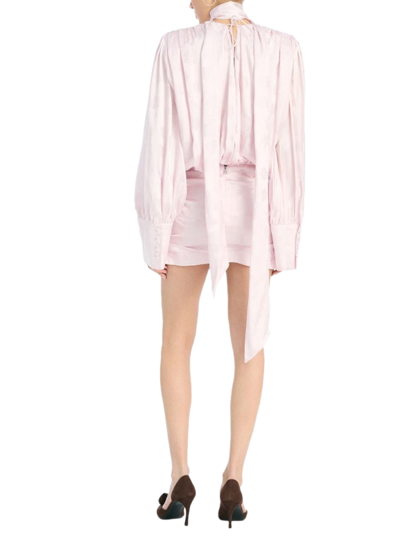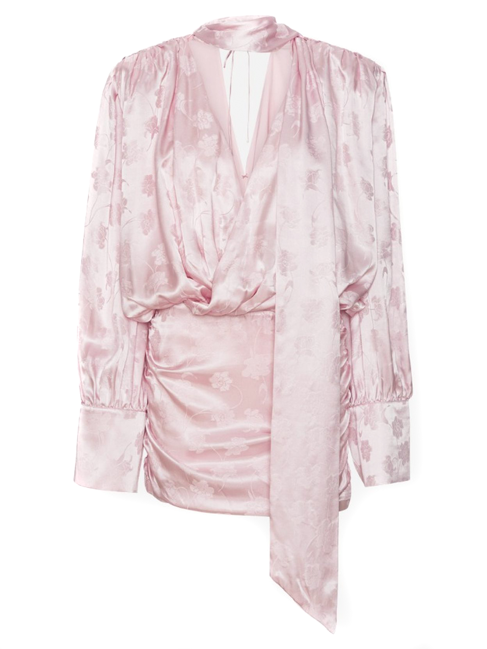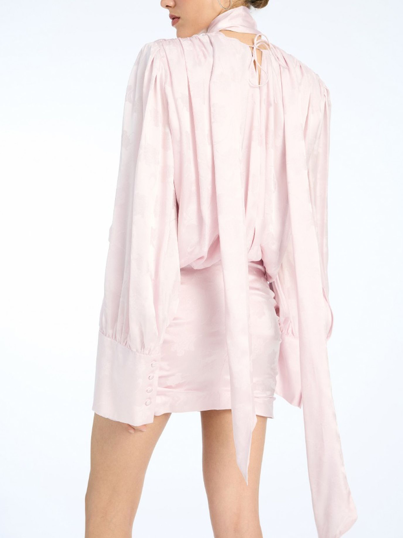 Ls Mini Dress Light Pink is a mini-length dress with long voluminous sleeves and wide cuffs. It features a draped front neckline and a long attached scarf detail that extends from the collar. The sides are ruched, creating a gathered effect along the waist and hips. The dress is crafted from jacquard-patterned satin and is lined for comfort, 97% Polyester (Recycled) 3% Elastane, Lining: 92% Viscose 8 % Elastane