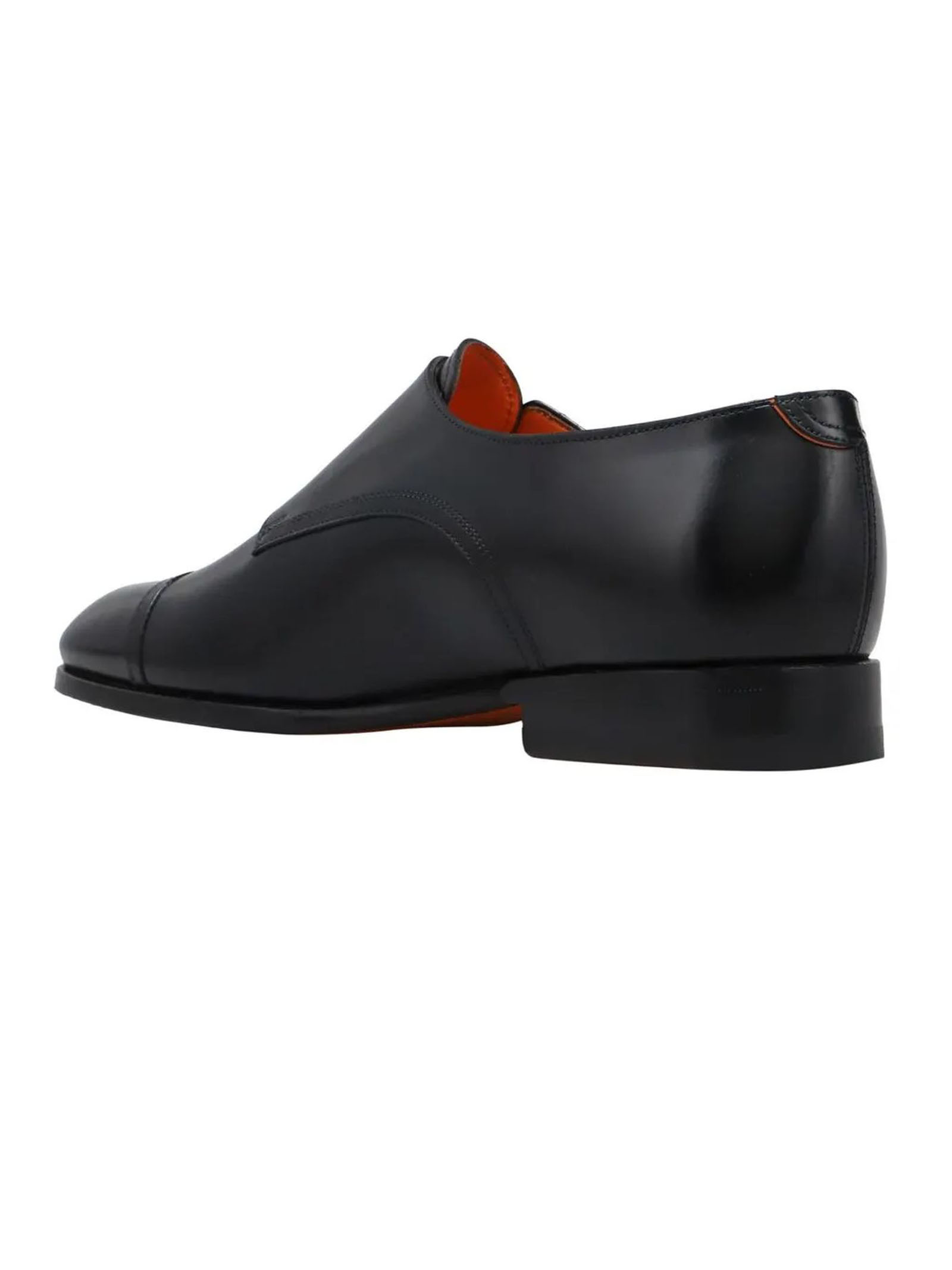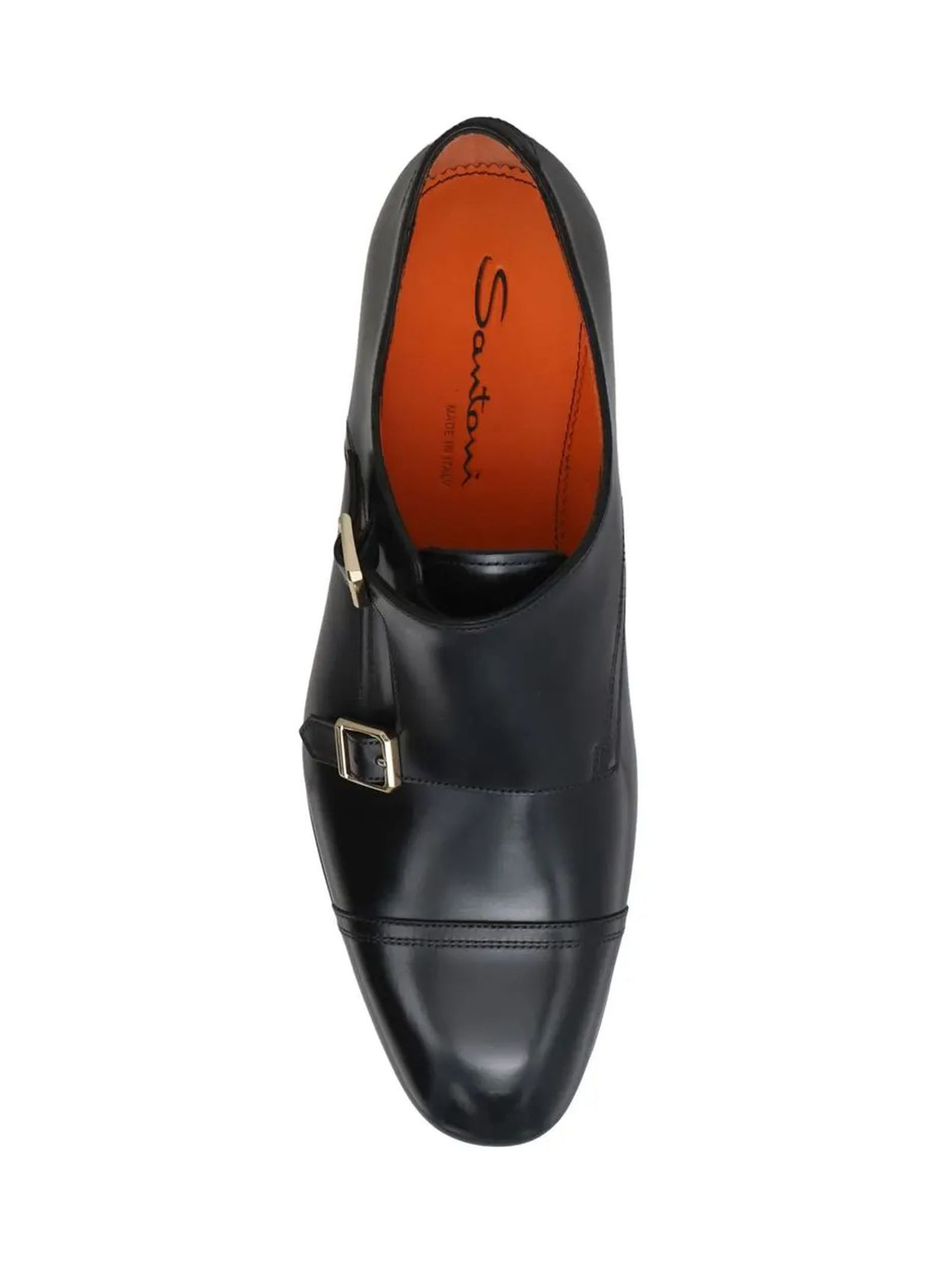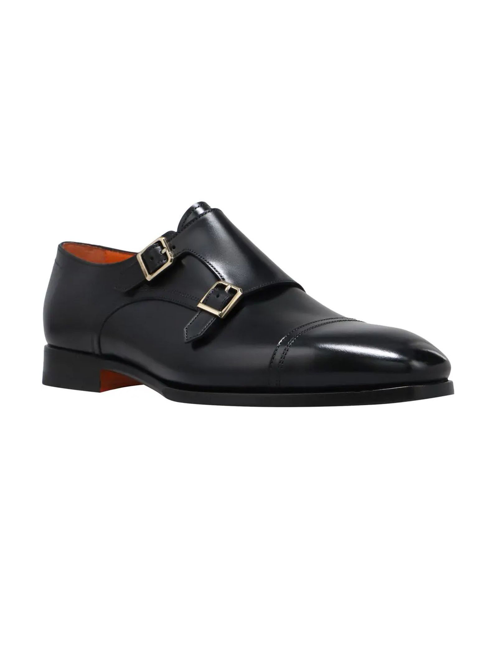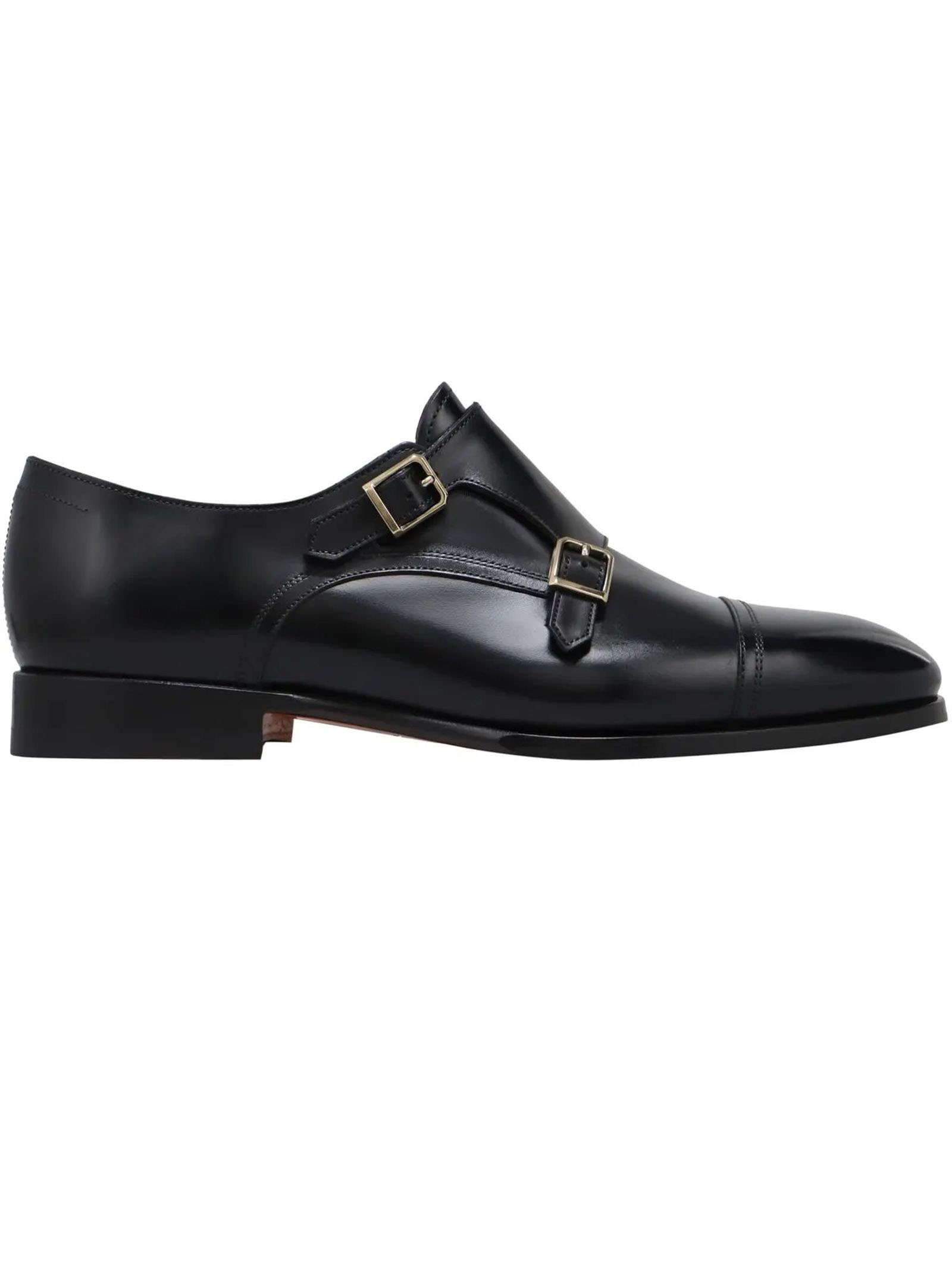 Black leather loafer, double buckle fastening, classic line with tapered toe, Goodyear construction, leather sole and rubber half heel, Santoni logo embossed on the insole