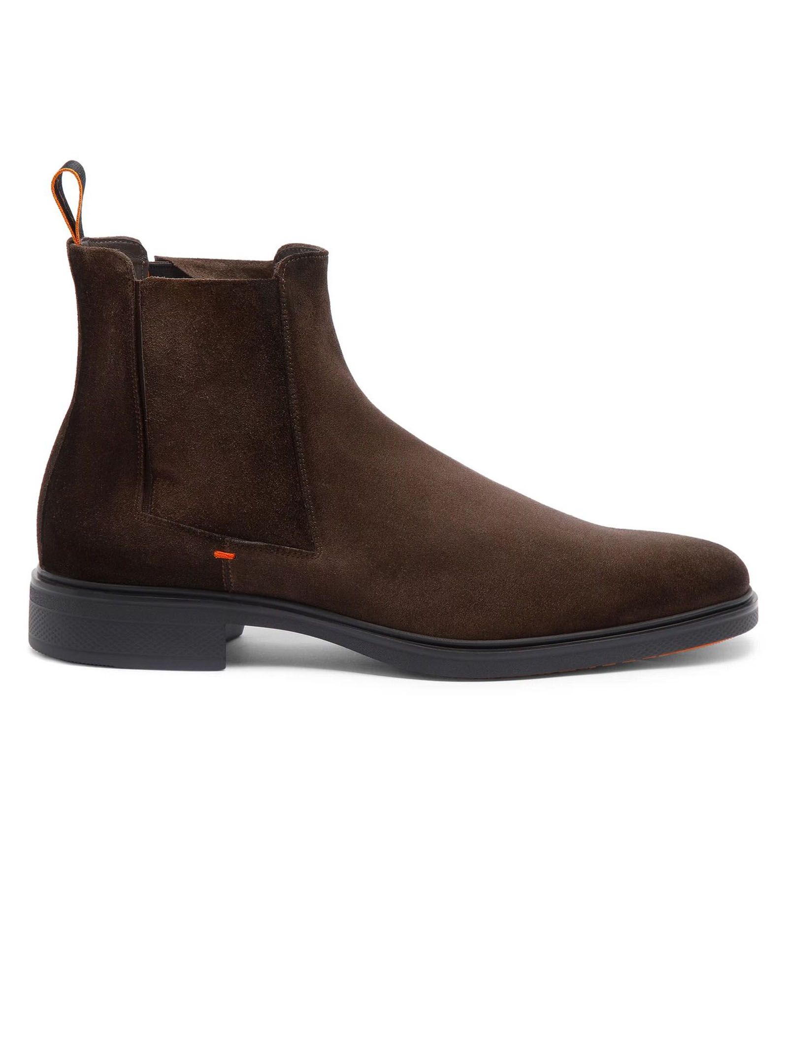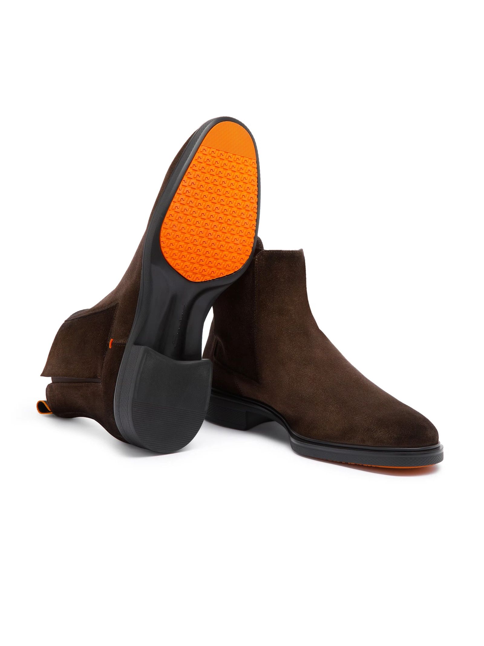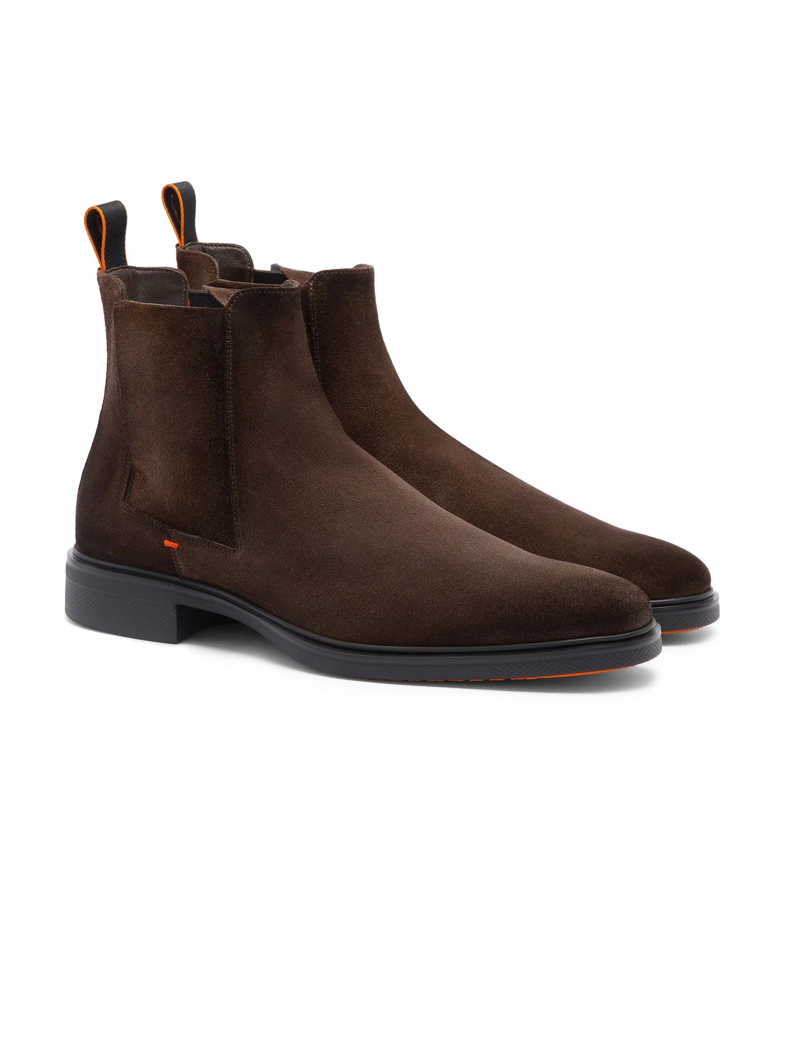 Dark brown suede Chelsea boot, Ultra-lightweight construction, Treated with Santonis velatura color-grading technique, color dark brown , elasticated side inserts , round toe, logo tape pull tab , perforated nappa lining , memory foam insole, orange rubber sole with double-buckle pattern, printed Santoni logo on the insole