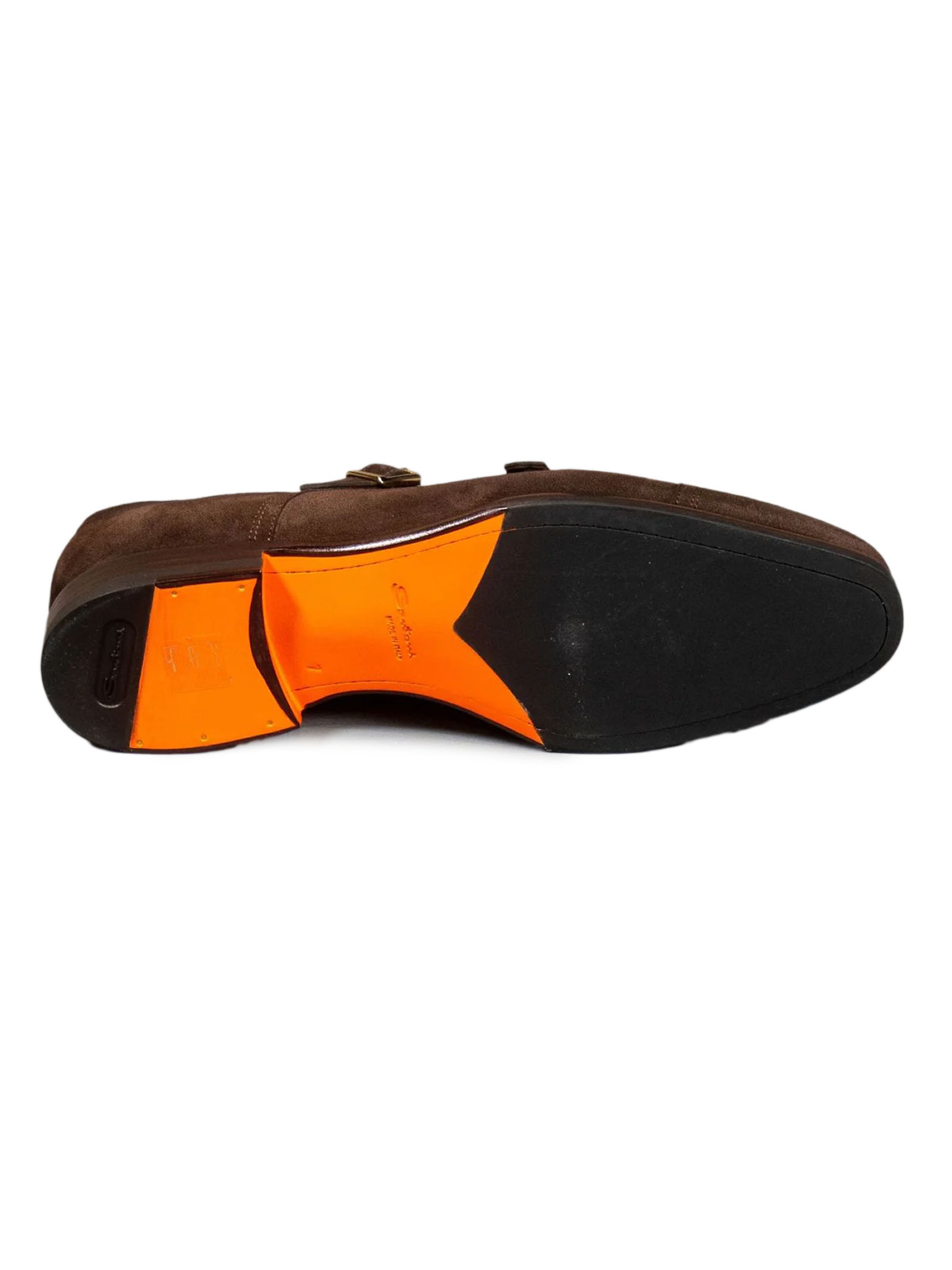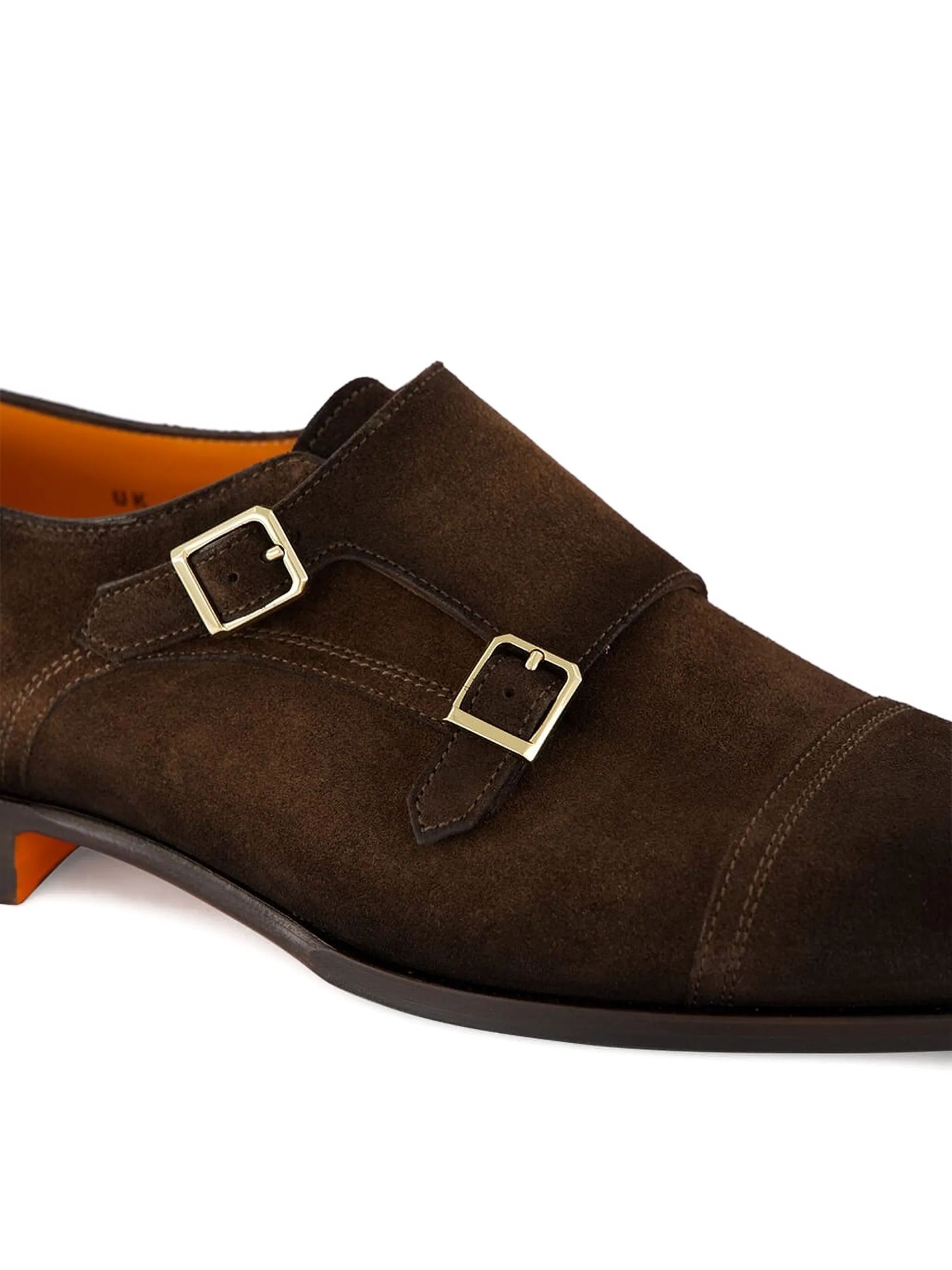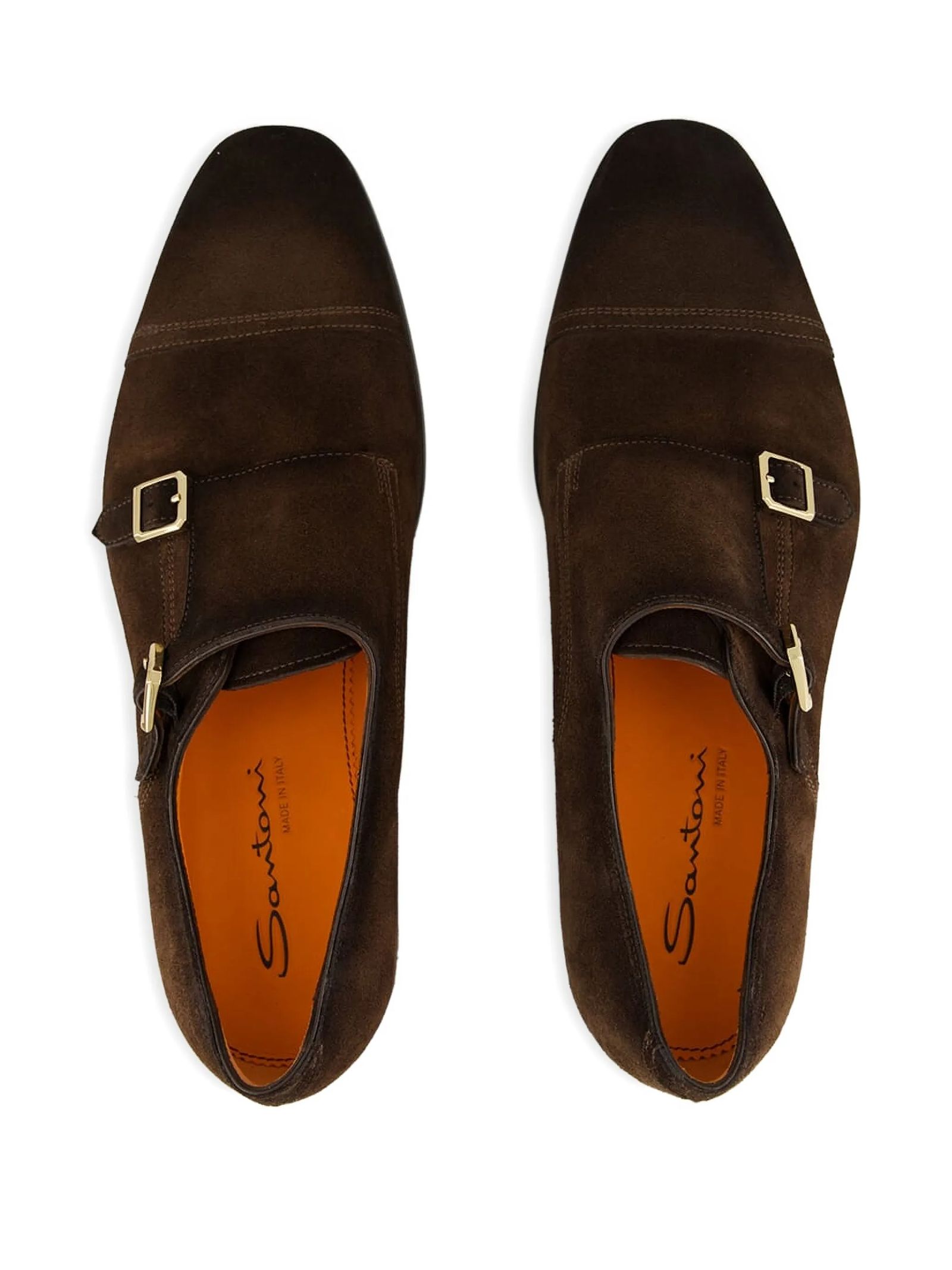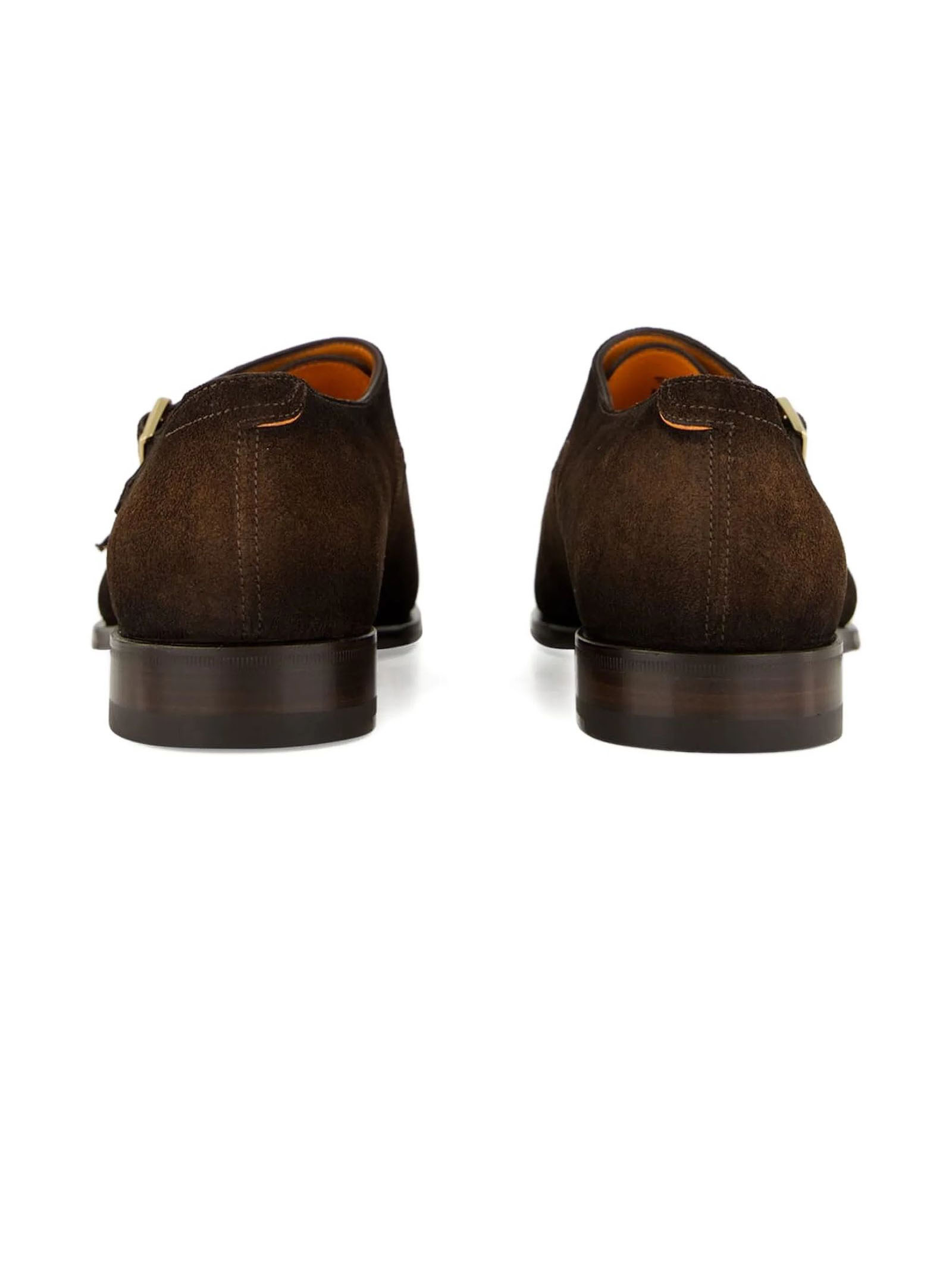 Double buckles in dark brown suede, Stitching on the toe, Classic tapered silhouette, Leather sole and rubber heel, Santoni logo embossed on the insole